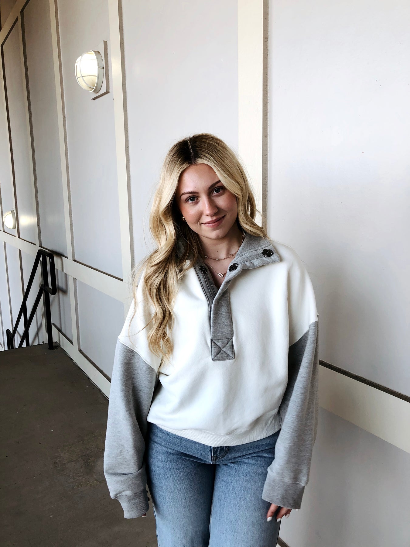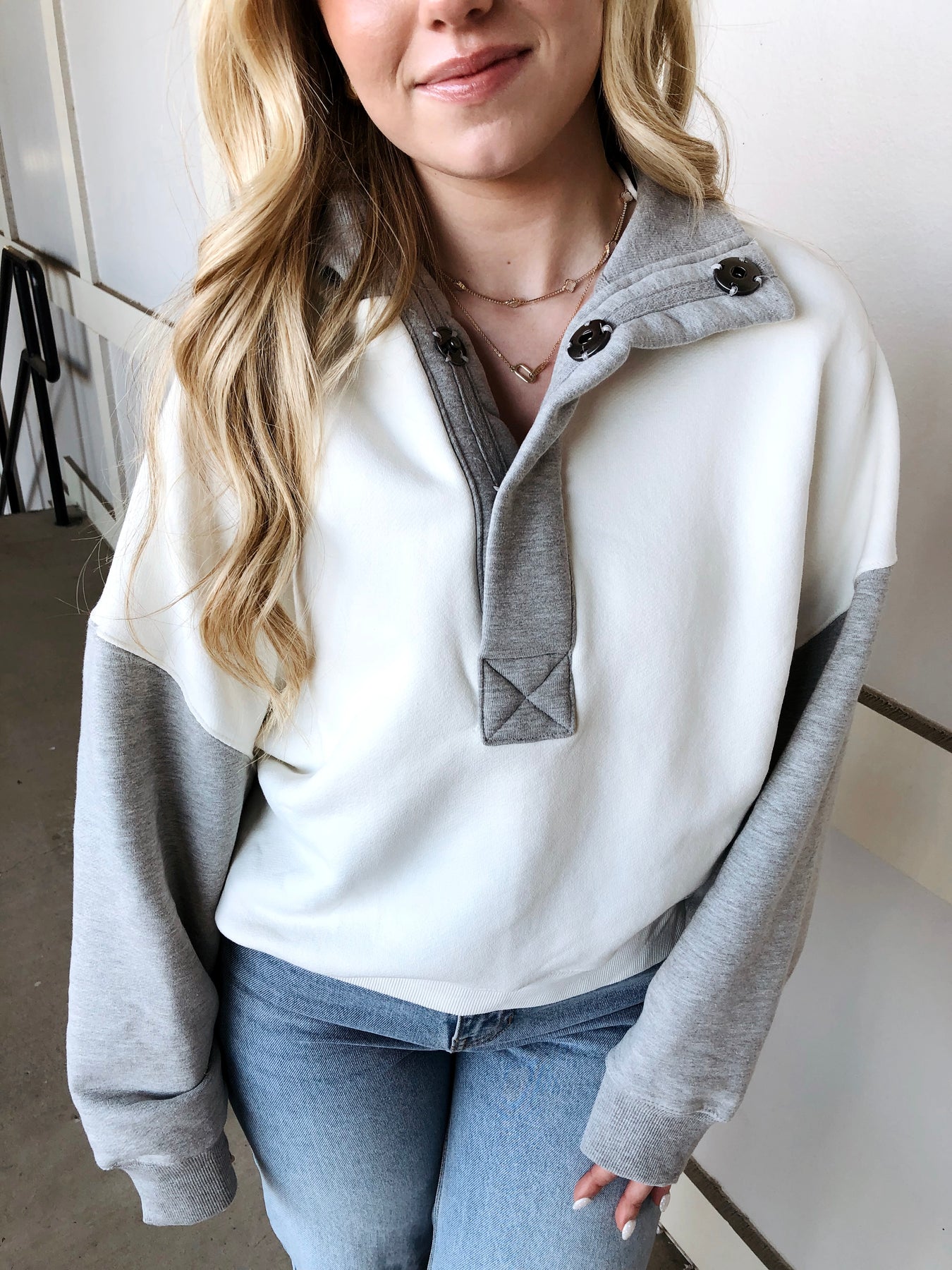Elevate your casual game with this charming color-block sweatshirt that effortlessly blends white and grey in perfect harmony. The quarter-button design adds a touch of laid-back sophistication—ideal for layering or wearing solo. Soft, cozy fabric keeps you comfortable whether you're running errands or settling in for a relaxed day. A timeless piece that works with everything in your wardrobe, this sweatshirt proves that sometimes the simplest styles are the most versatile. Your new go-to for comfort that never goes out of style.