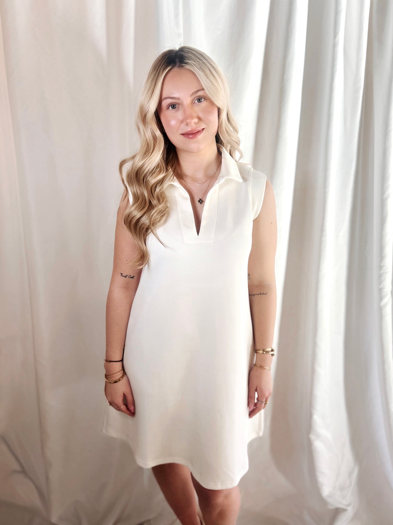 Serve up style in the For a Moment Dress—a butter-soft sleeveless tennis dress that's as comfortable on the court as it is at brunch. Crafted from luxuriously smooth fabric, this versatile piece glides effortlessly from game to getaway. Choose between timeless ivory or warm taupe to match your mood. Whether you're acing your serve or stealing the show, this dress keeps you looking fresh and feeling fabulous all day long.