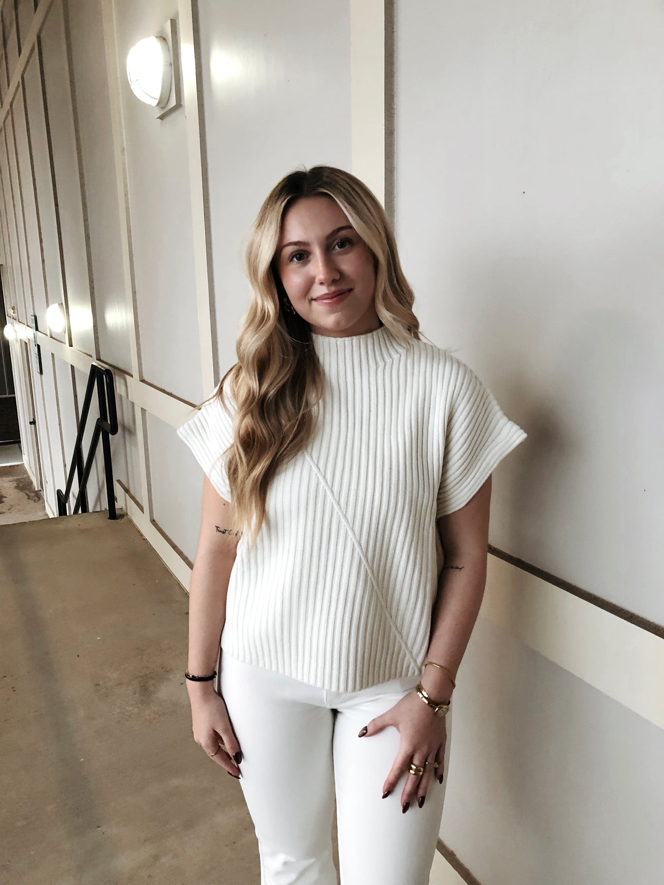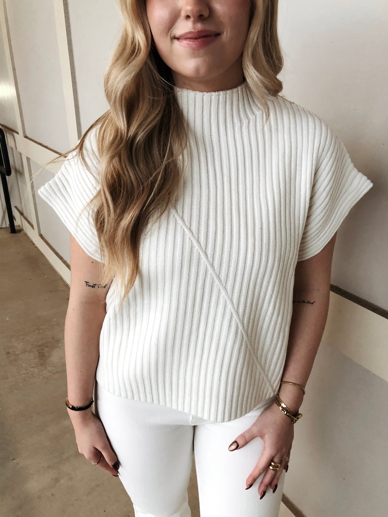 Throw on this crisp white ribbed knit vest and instantly elevate your layering game. The sleek mockneck adds a touch of sophistication, while the textured ribbed fabric brings visual interest and a hint of retro charm. Perfect for pairing over your favorite tees, under blazers, or styled solo for those "almost time" moments when you want to look polished without trying too hard. Versatile, timeless, and endlessly cool.