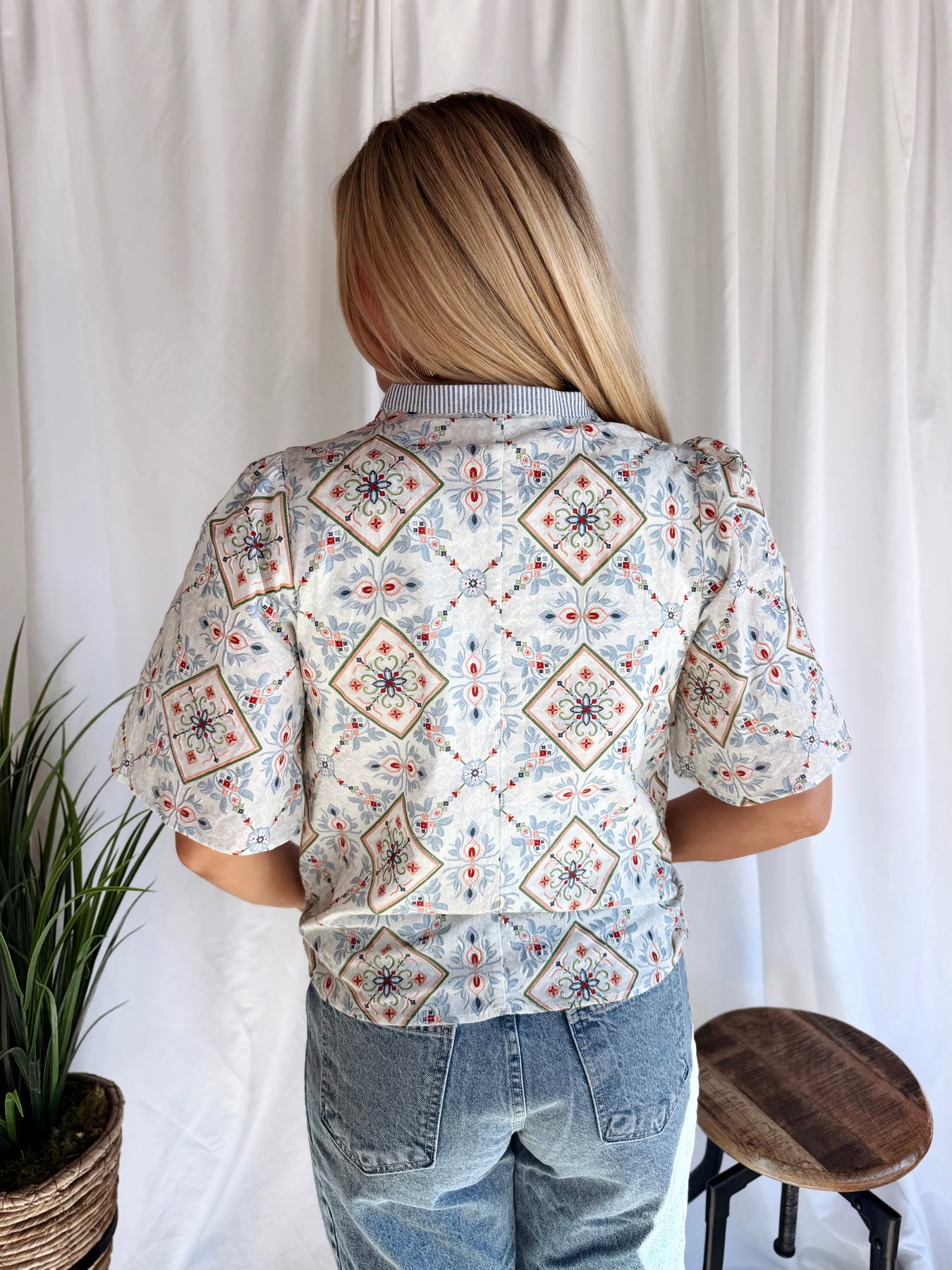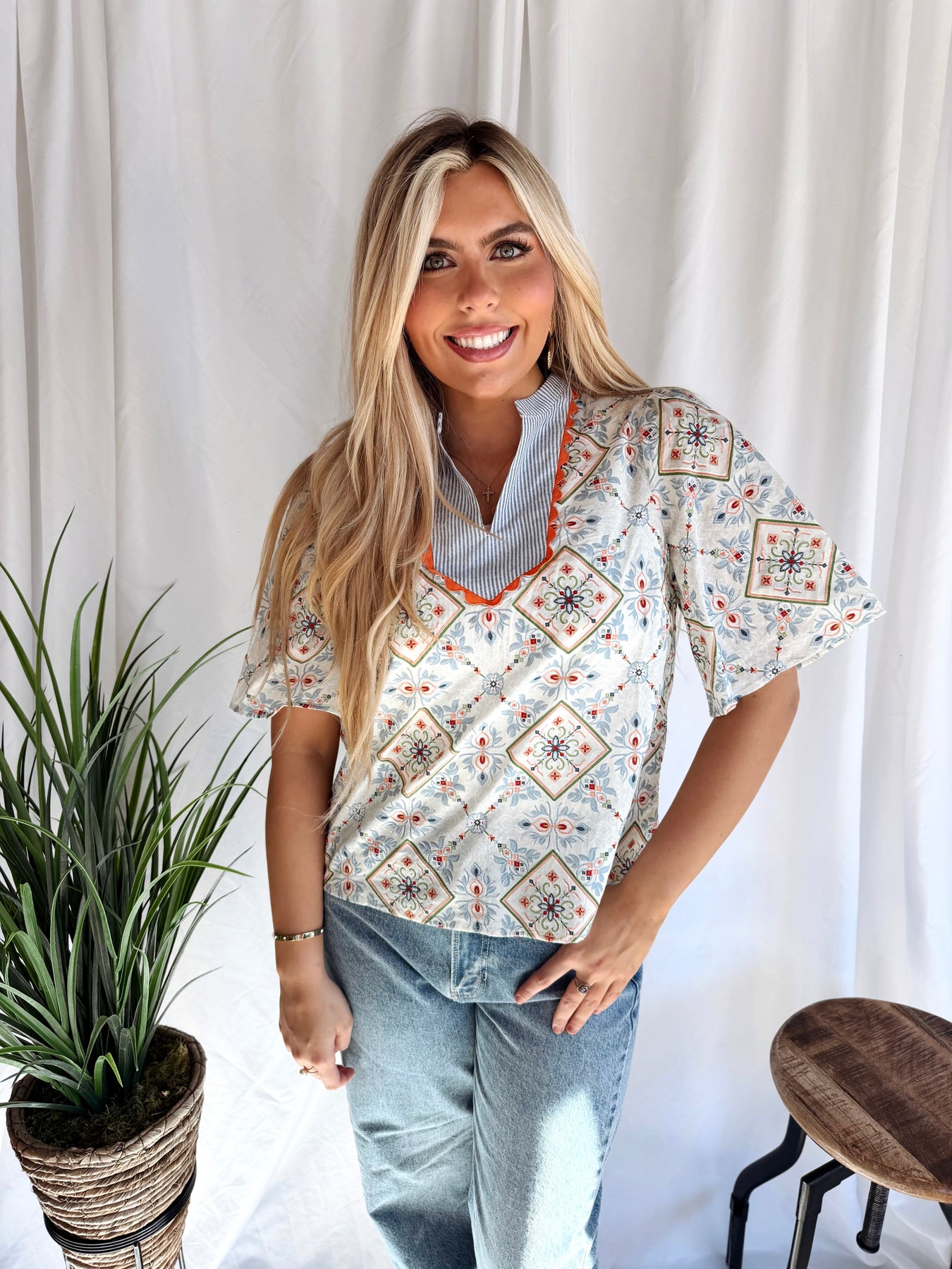 The HEIRLOOM BLOUSE brings vintage charm with a modern twist. This delightful piece features a vibrant orange wave trim that dances along the edges, paired with a crisp striped collar for a touch of classic sophistication. The soft floral print throughout adds romantic flair, making it perfect for anyone who loves mixing patterns with personality. Dress it up for brunch or down for casual outings—this versatile blouse is ready for whatever adventure awaits.