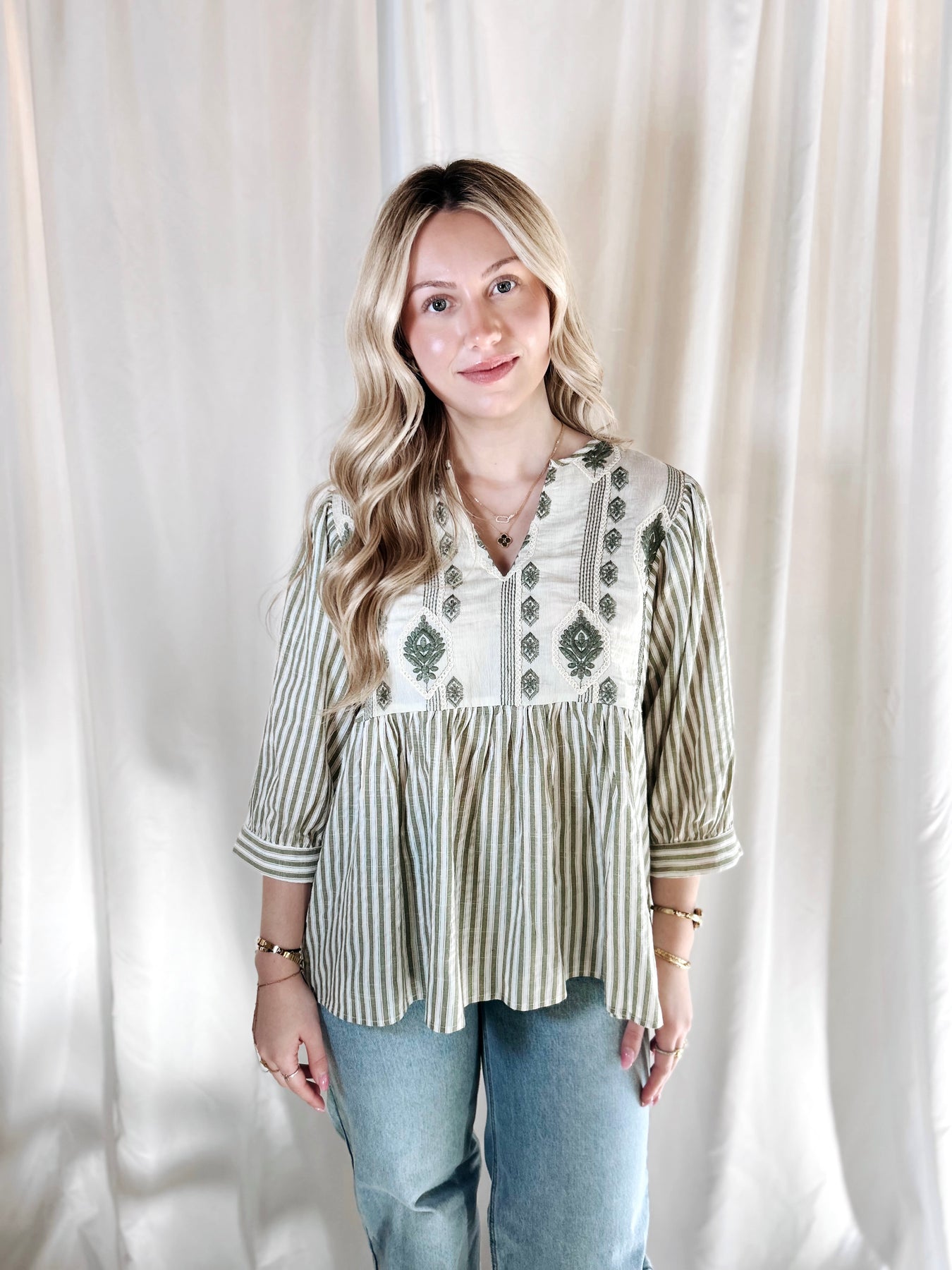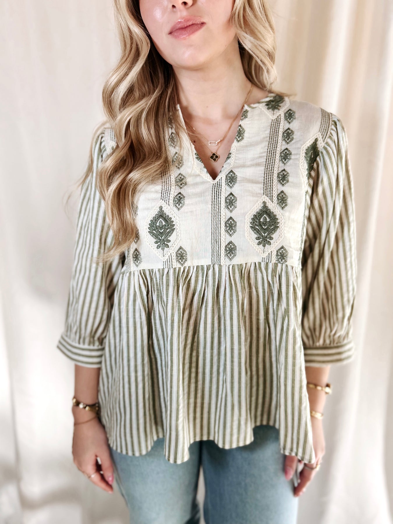 The MEADOWLANE TOP brings effortless charm to your everyday rotation. Crafted in soft sage green with delicate stripes, this puff sleeve beauty features an intricate half length, embroidered detailing that adds a touch of whimsy. Perfect for layering or wearing solo, it's the kind of piece that makes getting dressed feel like fun. Versatile enough for casual outings yet special enough to feel intentional.