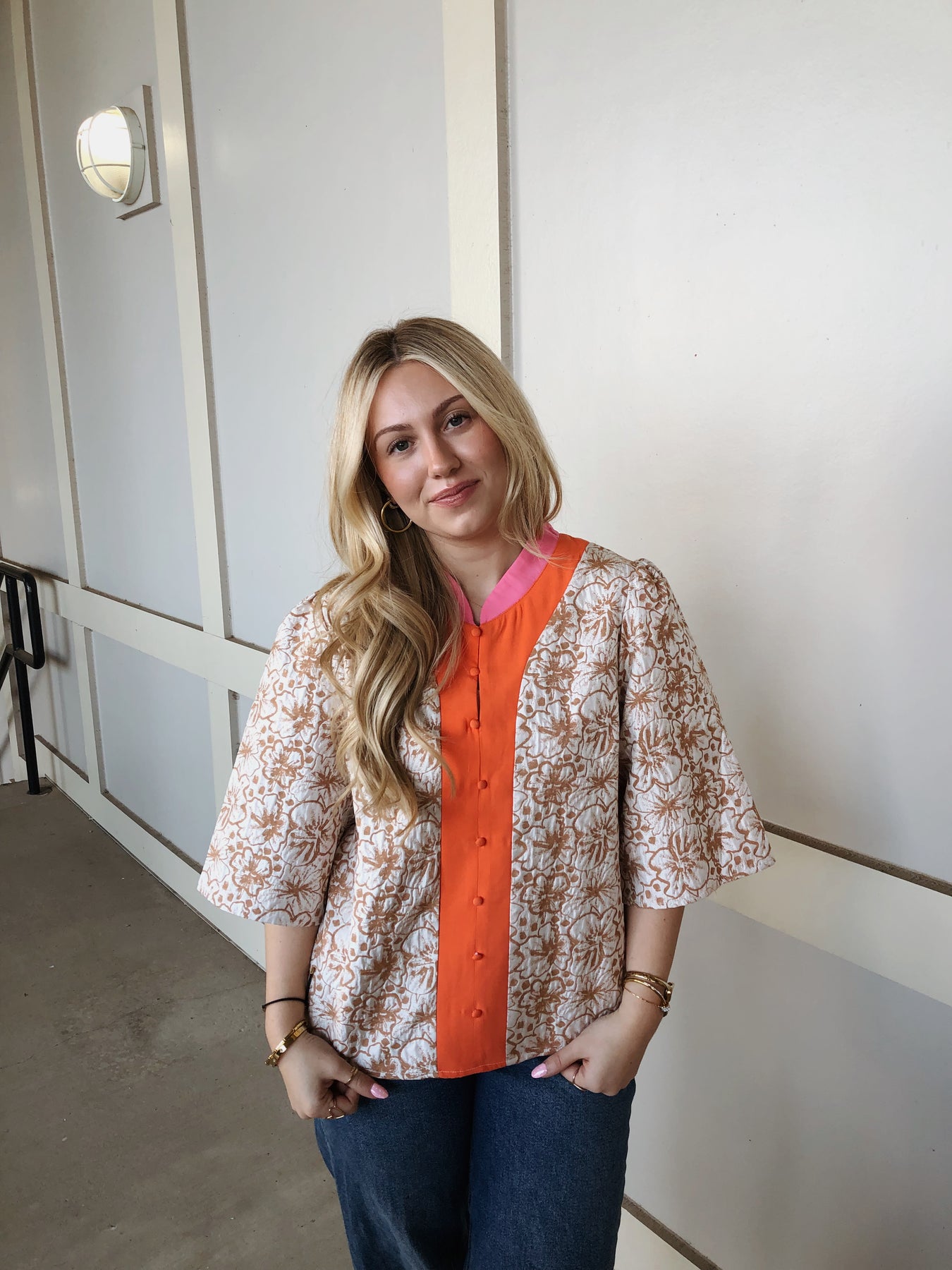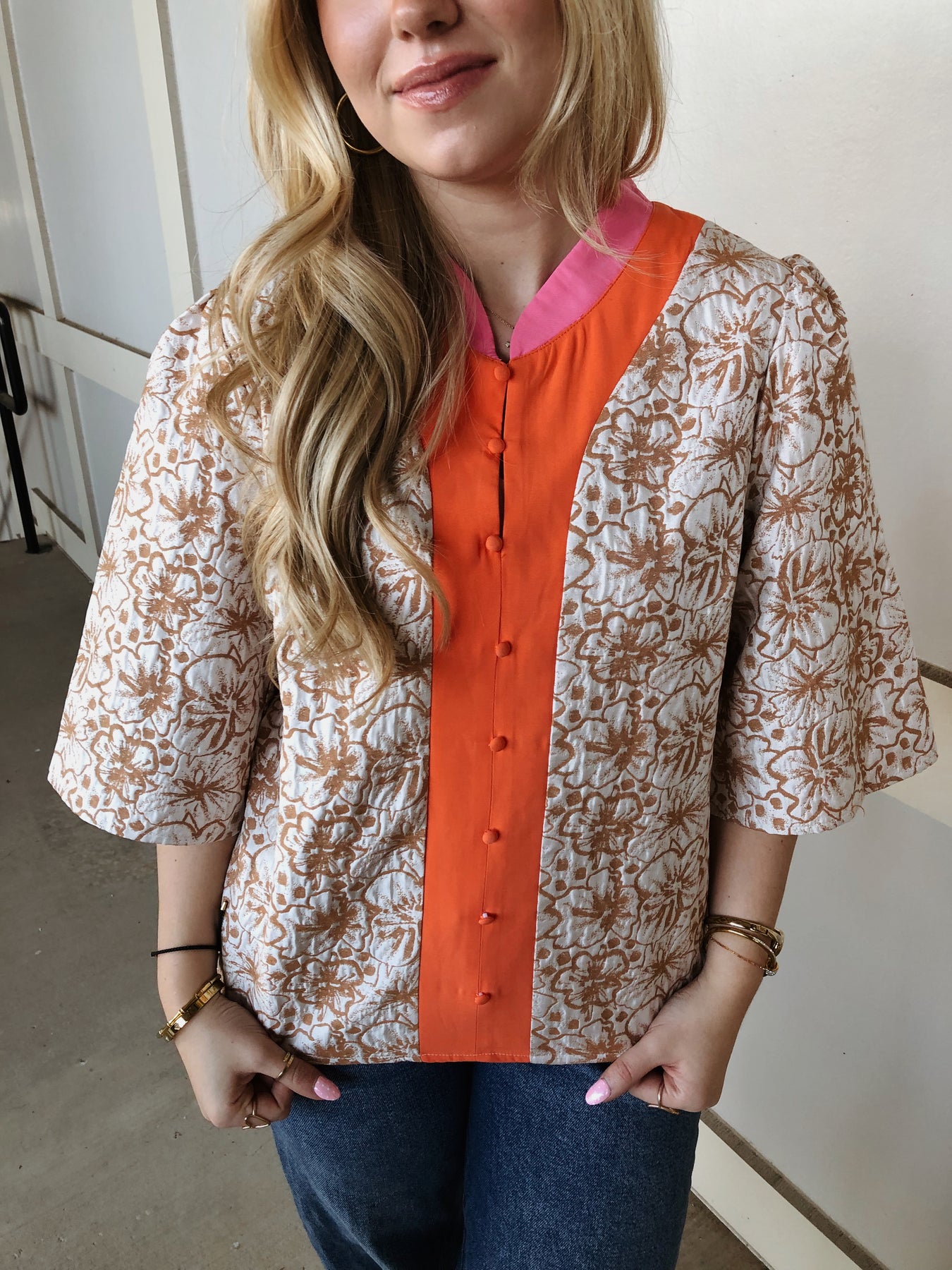 Brighten your wardrobe with this stunning color-block floral jacquard top that's absolutely gorgeous! Featuring a playful mix of orange and pink contrasting fabric details, this piece brings joy and personality to any outfit. The intricate jacquard weave adds texture and visual interest, while the bold color blocking makes a confident style statement. Perfect for those who love to stand out and celebrate the wonderful moments in life with fashion that matches their vibrant spirit.