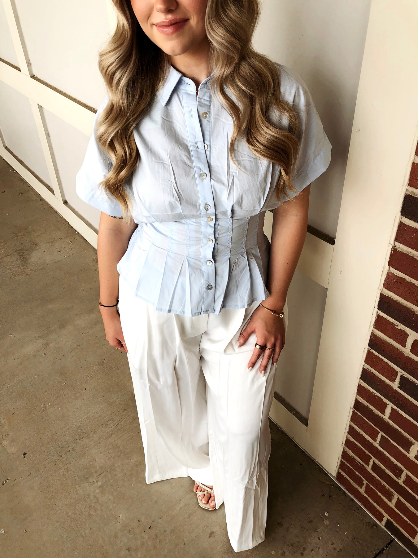 Elevate your office style with the Shape of You Blouse, featuring delicate light blue pintucked details and a classic button-down collar. This playful piece adds a fresh twist to your workday wardrobe, ensuring you look sharp and feel confident all day long.