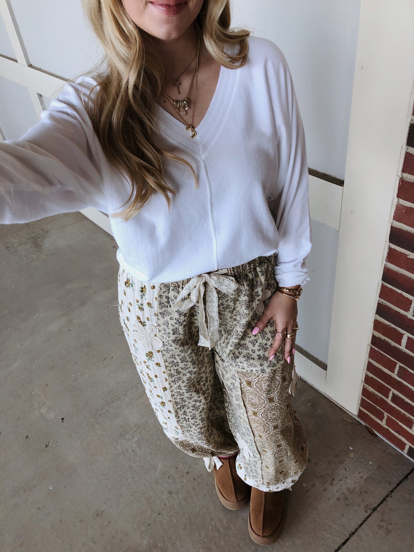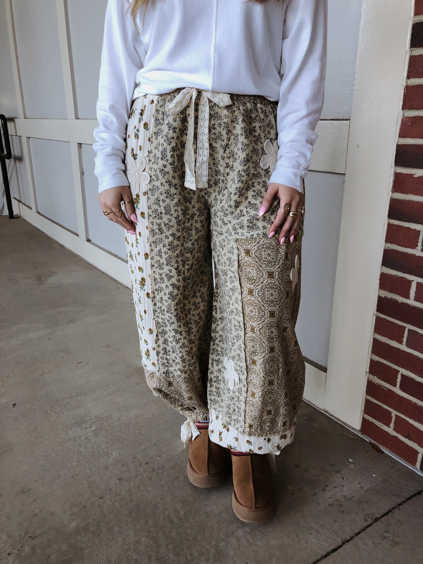 These laid-back pants bring both comfort and style with their roomy fit and playful patchwork design. Adjustable ties add a fun, casual flair while letting you customize the fit. Perfect for relaxed days when you want to feel free and look effortlessly cool.