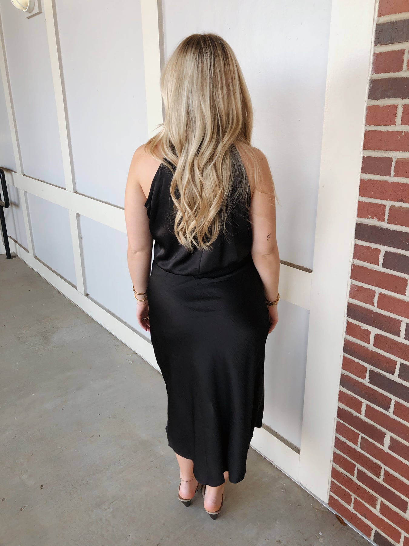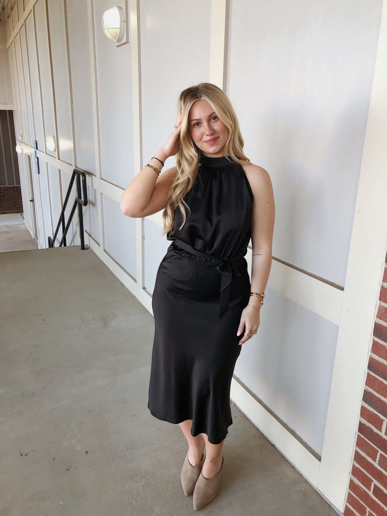 Turn heads with the Pandora Dress, a playful halter neck midi that’s perfect for dancing the night away. Its sleek black design flatters every silhouette, while the sleeveless cut keeps you cool and comfortable. Whether you're out on the town or at a special event, this dress brings effortless charm and flirty vibes to your wardrobe.