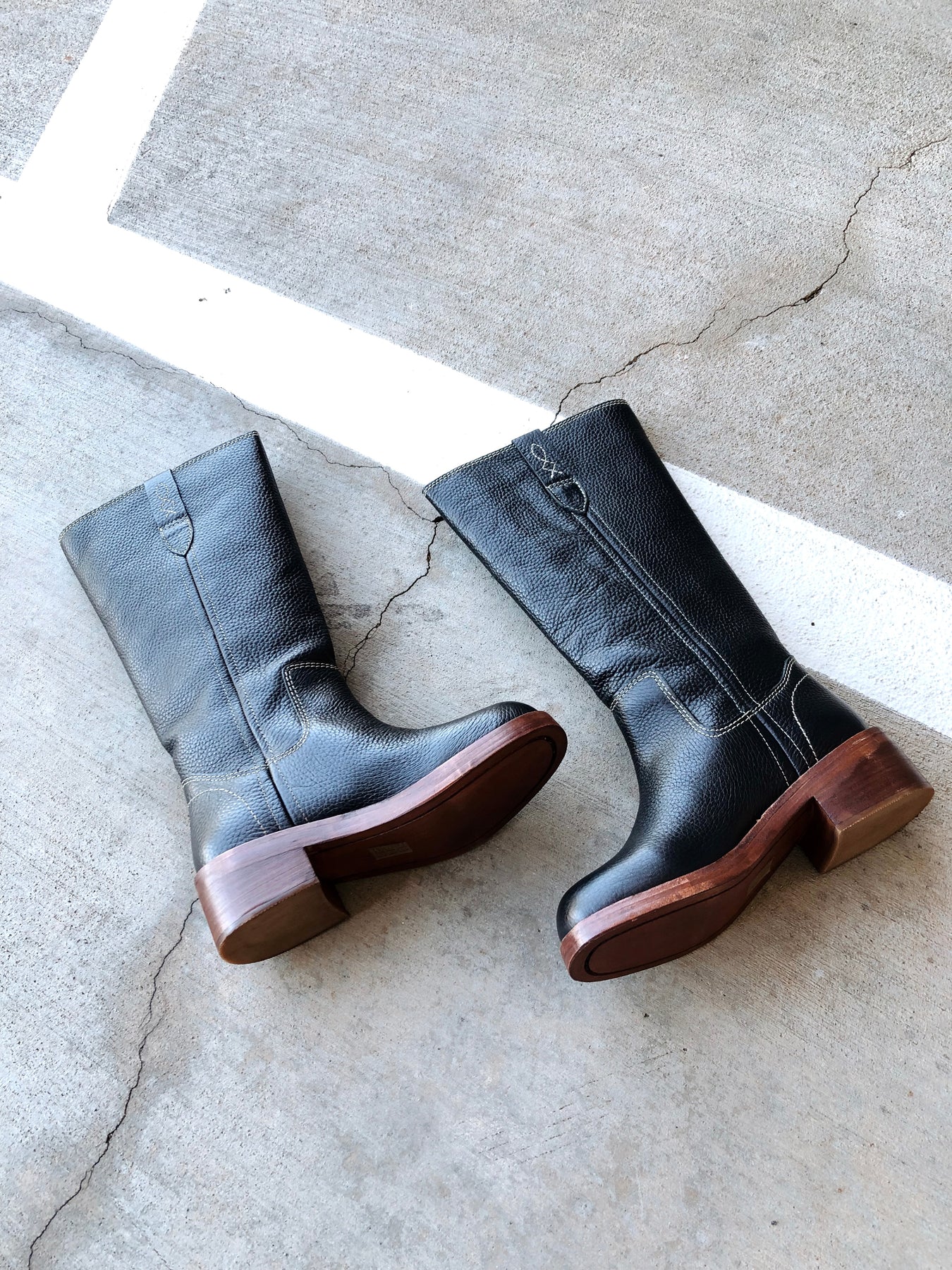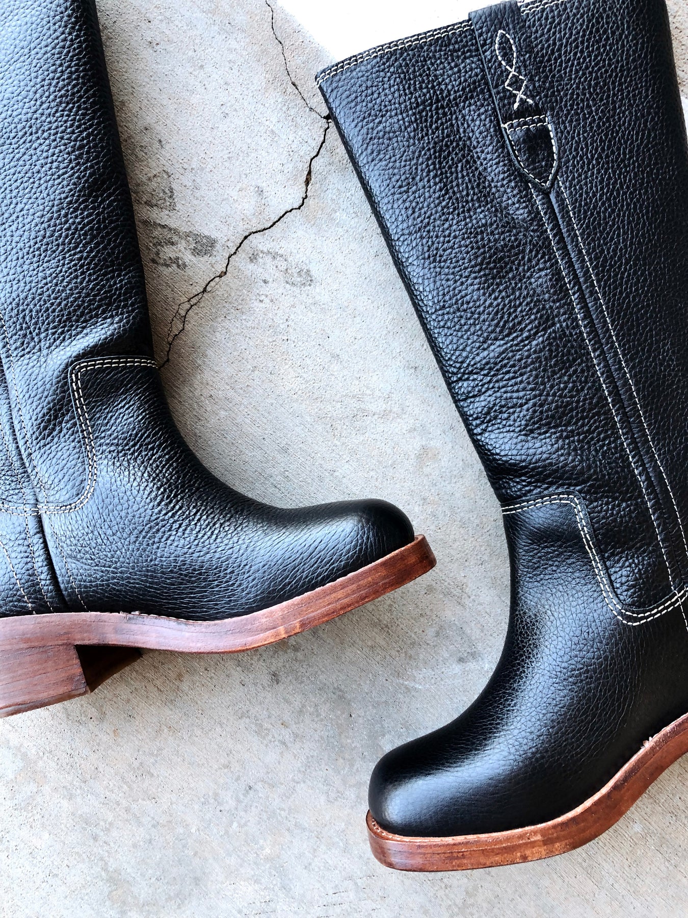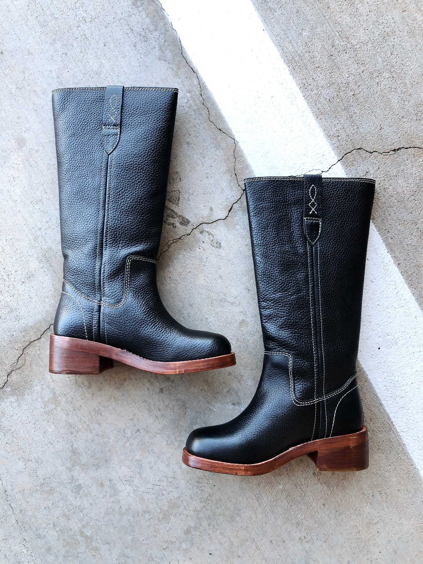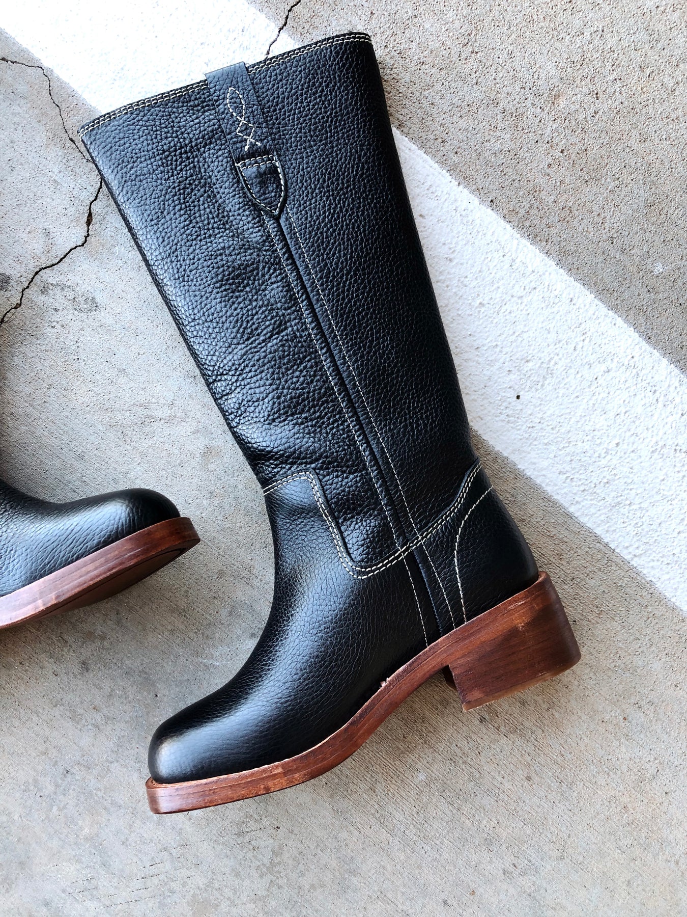 Pull-on style, tall design, leather uppers, pull straps with embroidered details, square toe, fading at heel and toe, stacked leather block heel.
