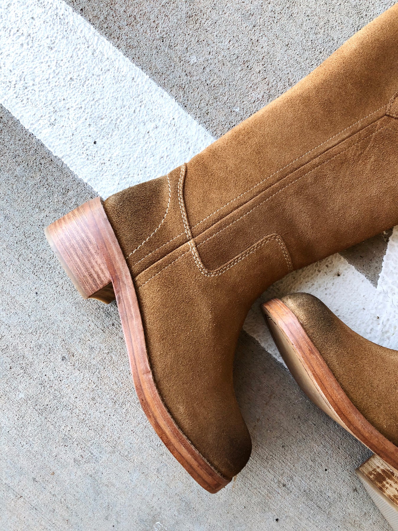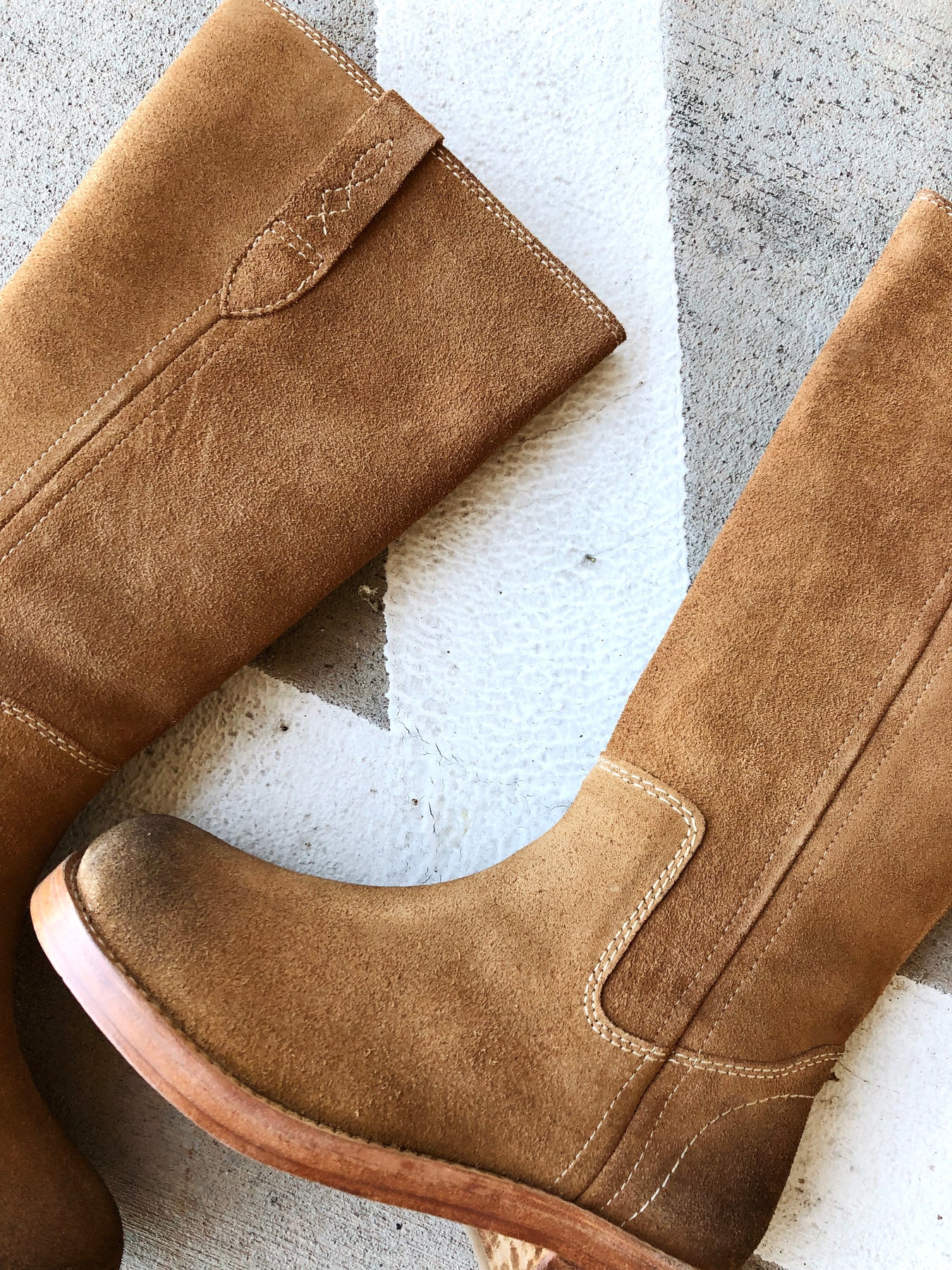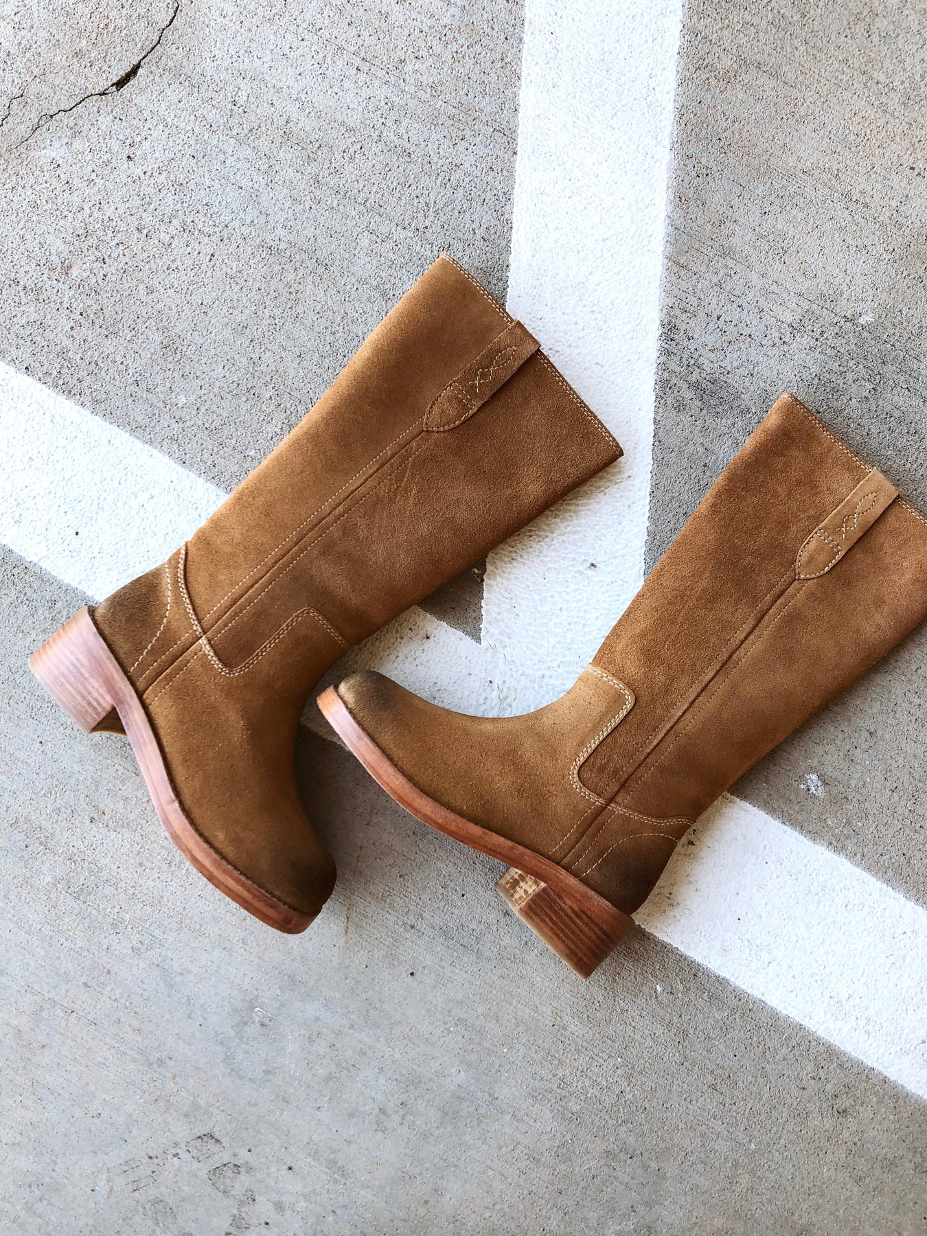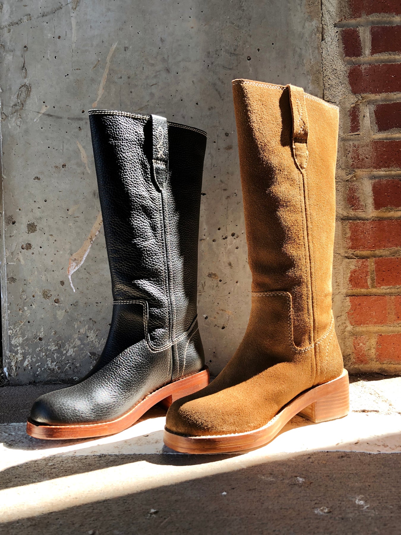 Pull-on style, tall design, leather uppers, pull straps with embroidered details, square toe, fading at heel and toe, stacked leather block heel.