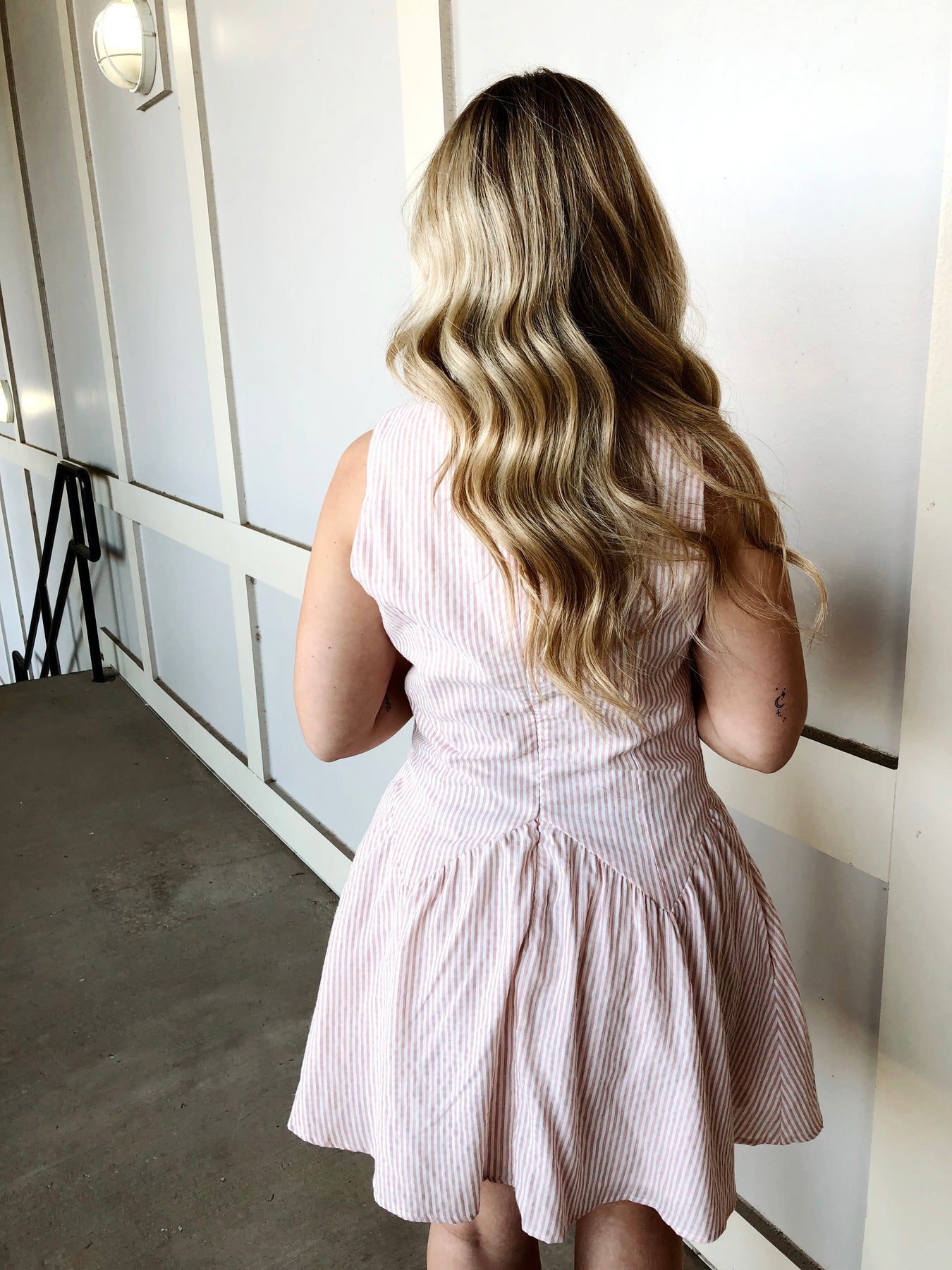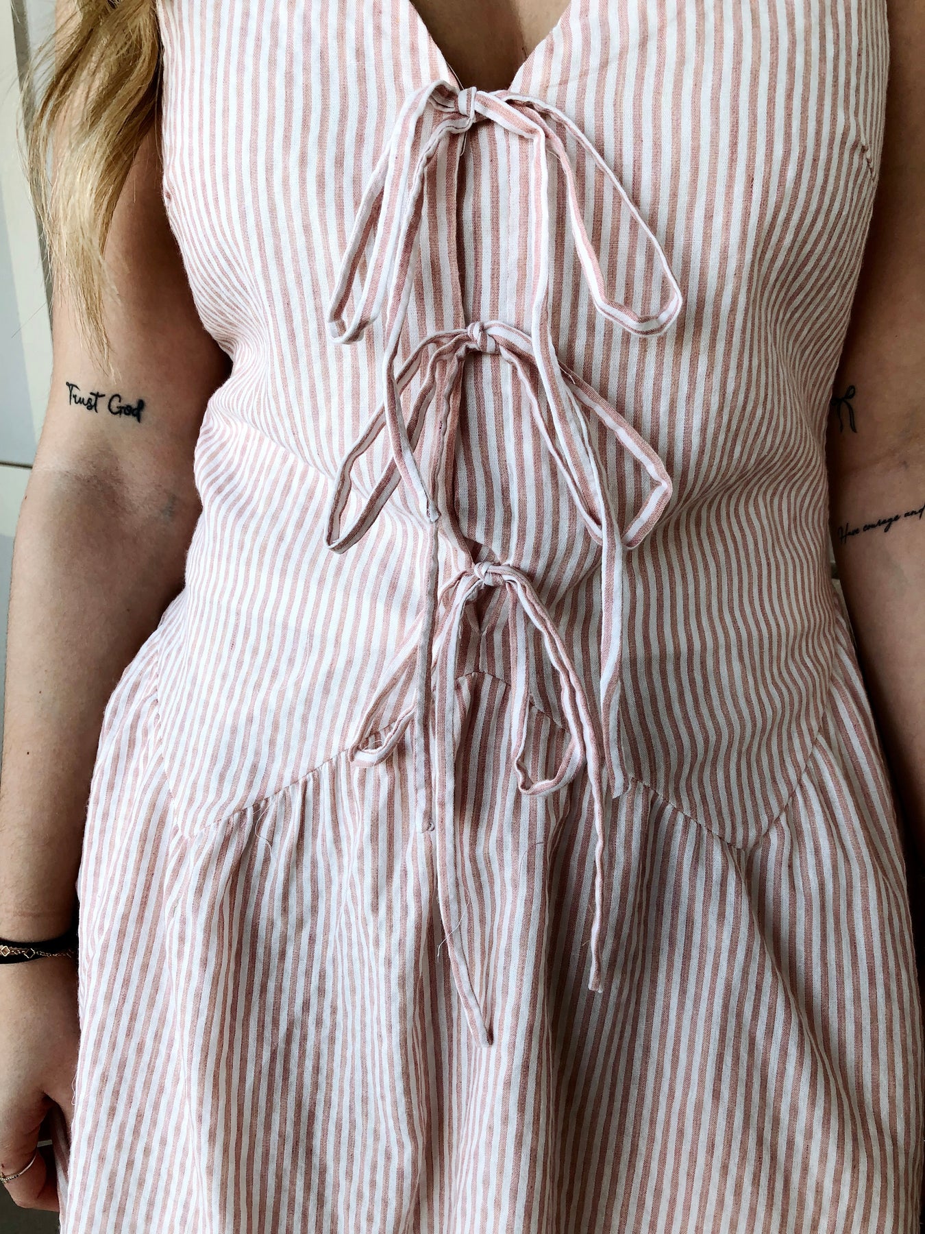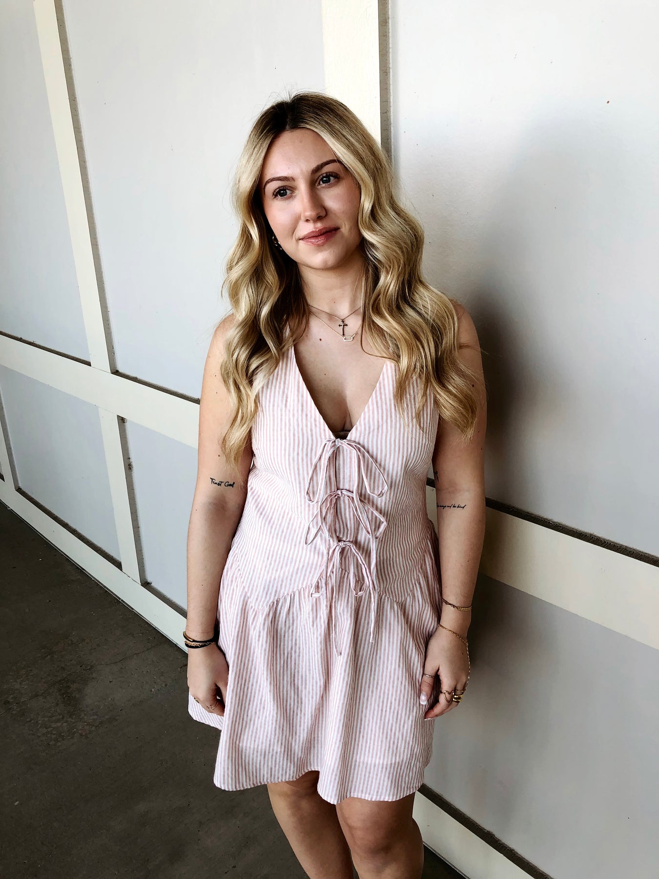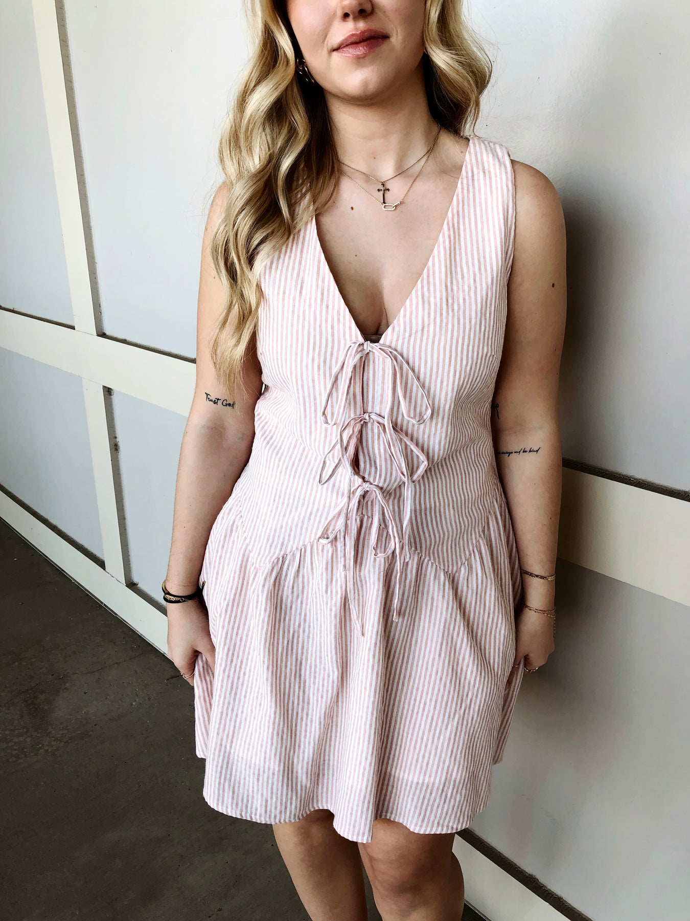 The Eden Dress brings effortless charm to your everyday rotation. This cotton mini features soft blush stripes and a flattering dropwaist silhouette that skims beautifully. The front tie detail adds a playful twist—cinch it snug for definition or leave it loose for a relaxed vibe. Perfect for casual outings, weekend brunches, or whenever you want to feel put-together without trying too hard. Lightweight and breathable, it's your new go-to for warm-weather style.
