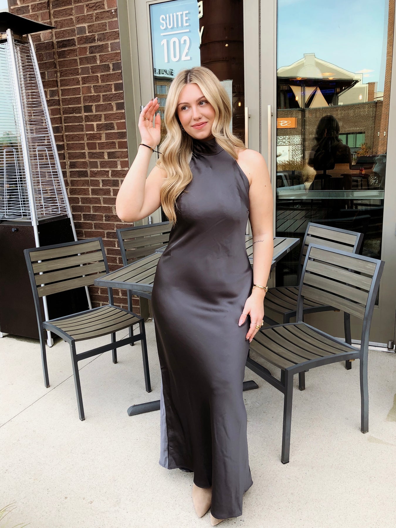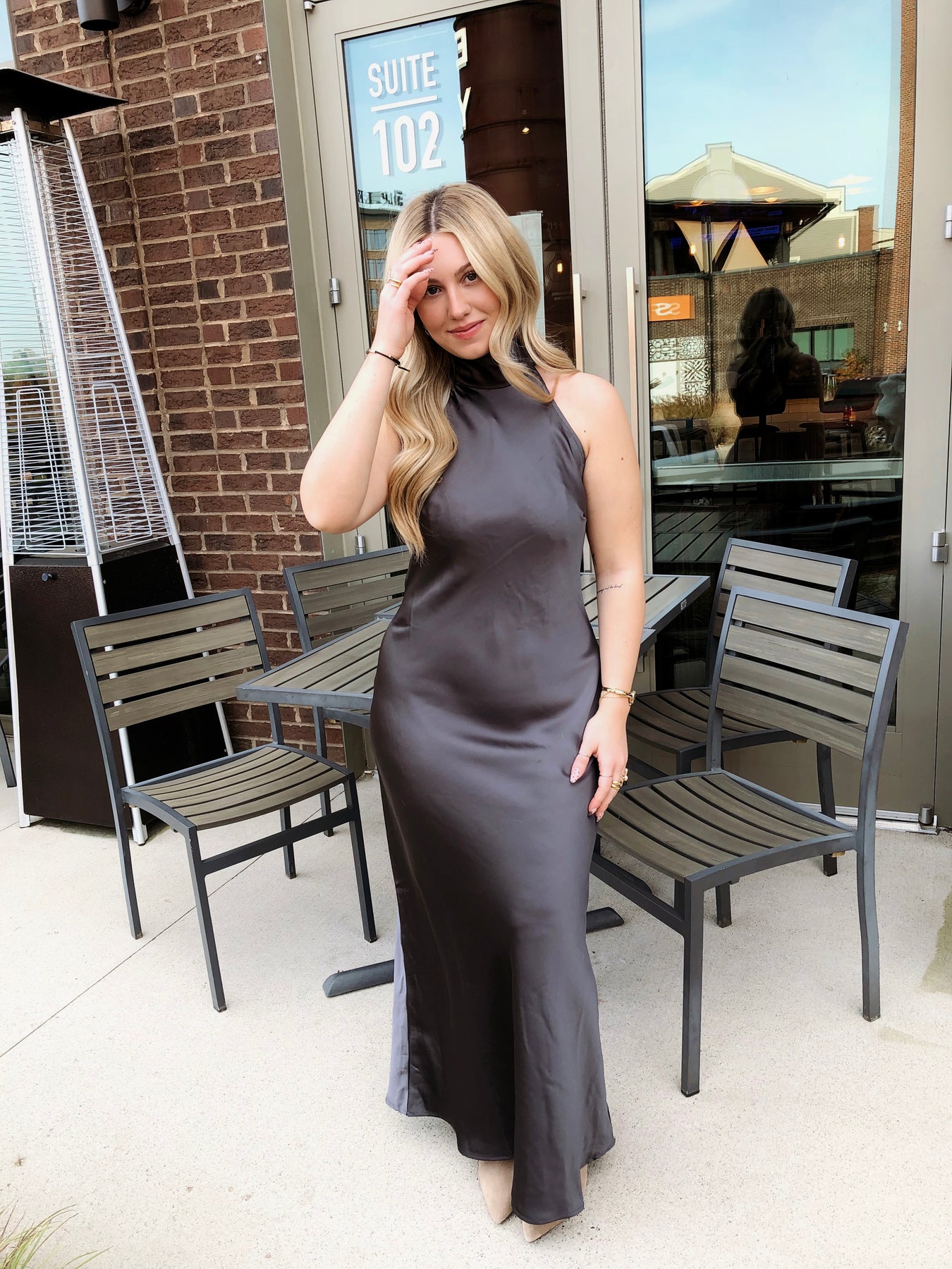 Slip into sophistication with the LARA DRESS, a stunning dark slate halter satin maxi that's equal parts glamorous and effortlessly chic. The luxurious satin fabric drapes beautifully while the halter neckline adds a flirty touch of elegance. Perfect for evening events, date nights, or whenever you want to feel absolutely fabulous. This showstopper pairs timeless style with modern flair—because looking amazing should always be this much fun.