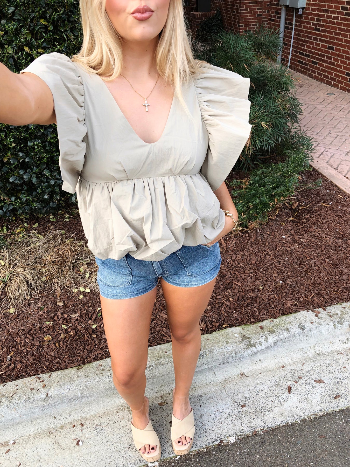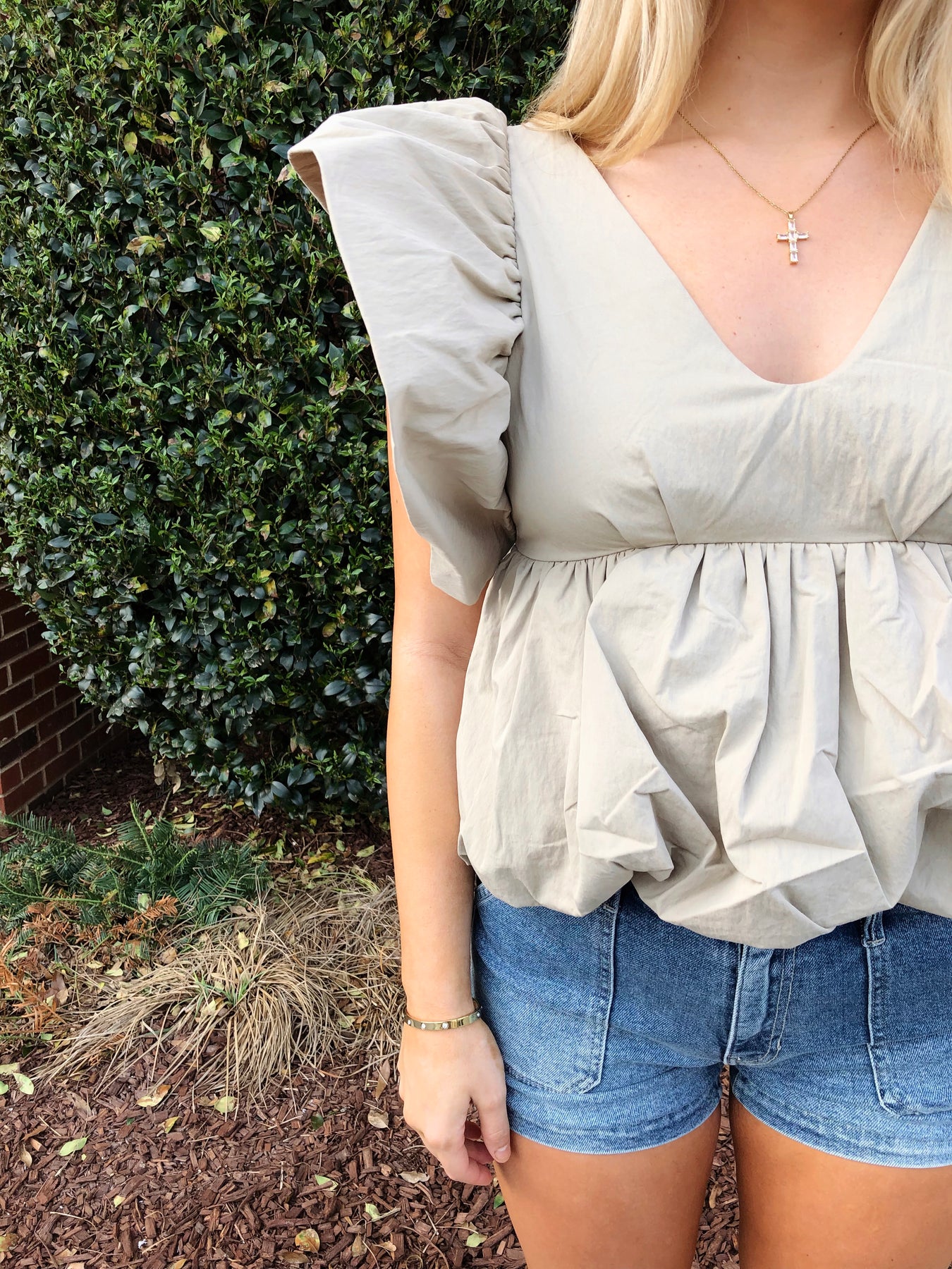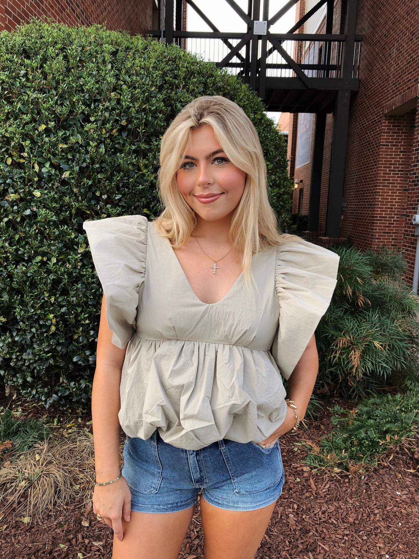 The SASKYA TOP combines effortless style with playful details. Crafted from a crisp cotton blend, this slightly cropped silhouette features voluminous flutter sleeves that add movement and dimension. The bubbly hem creates a charming, textured finish that elevates any casual look. Perfect for layering or wearing solo, this versatile piece brings a modern twist to your everyday wardrobe.