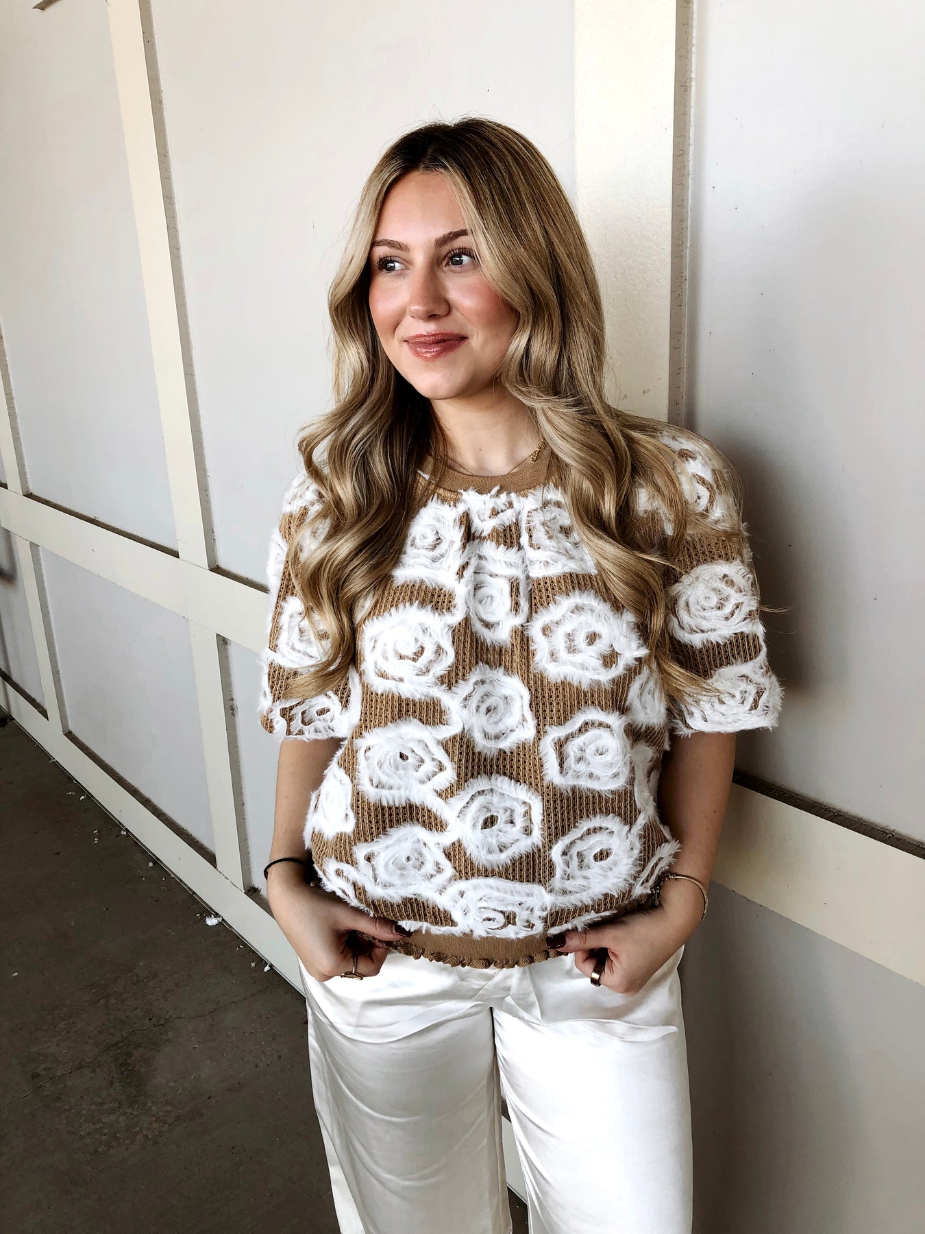 Add a burst of playful charm to your wardrobe with this tan floral textured knit top. Soft and cozy, it's designed to keep you comfy while the delicate floral texture adds an eye-catching twist. Perfect for lively nights out or casual days in, this top brings a fun, feminine flair to any outfit. Let your style bloom and the night be young!