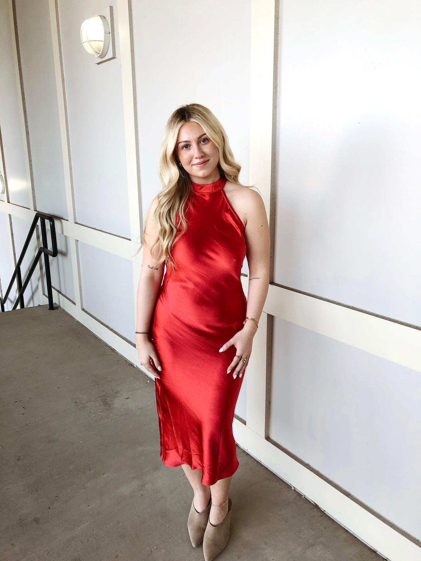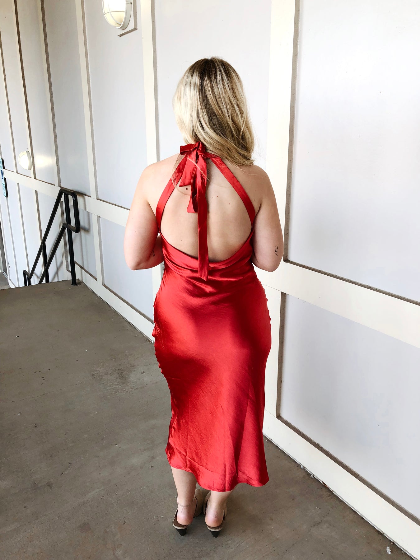 Turn heads this holiday season in our UNDER THE MISTLETOE DRESS—a stunning red halter neck design that's equal parts bold and flirty. The open back creates an unexpected allure, perfect for festive celebrations where you want to make a statement. Slip into this showstopper and let the compliments flow. Whether you're dancing at a party or stealing a kiss under the mistletoe, this dress delivers confidence and charm in every wear.