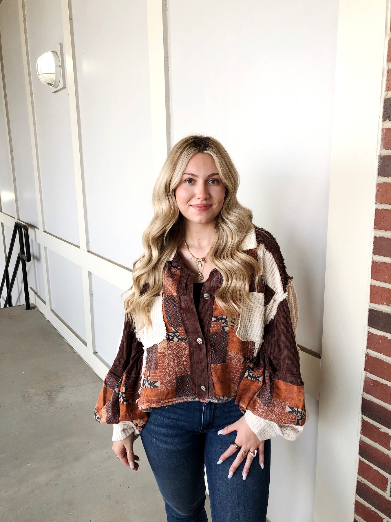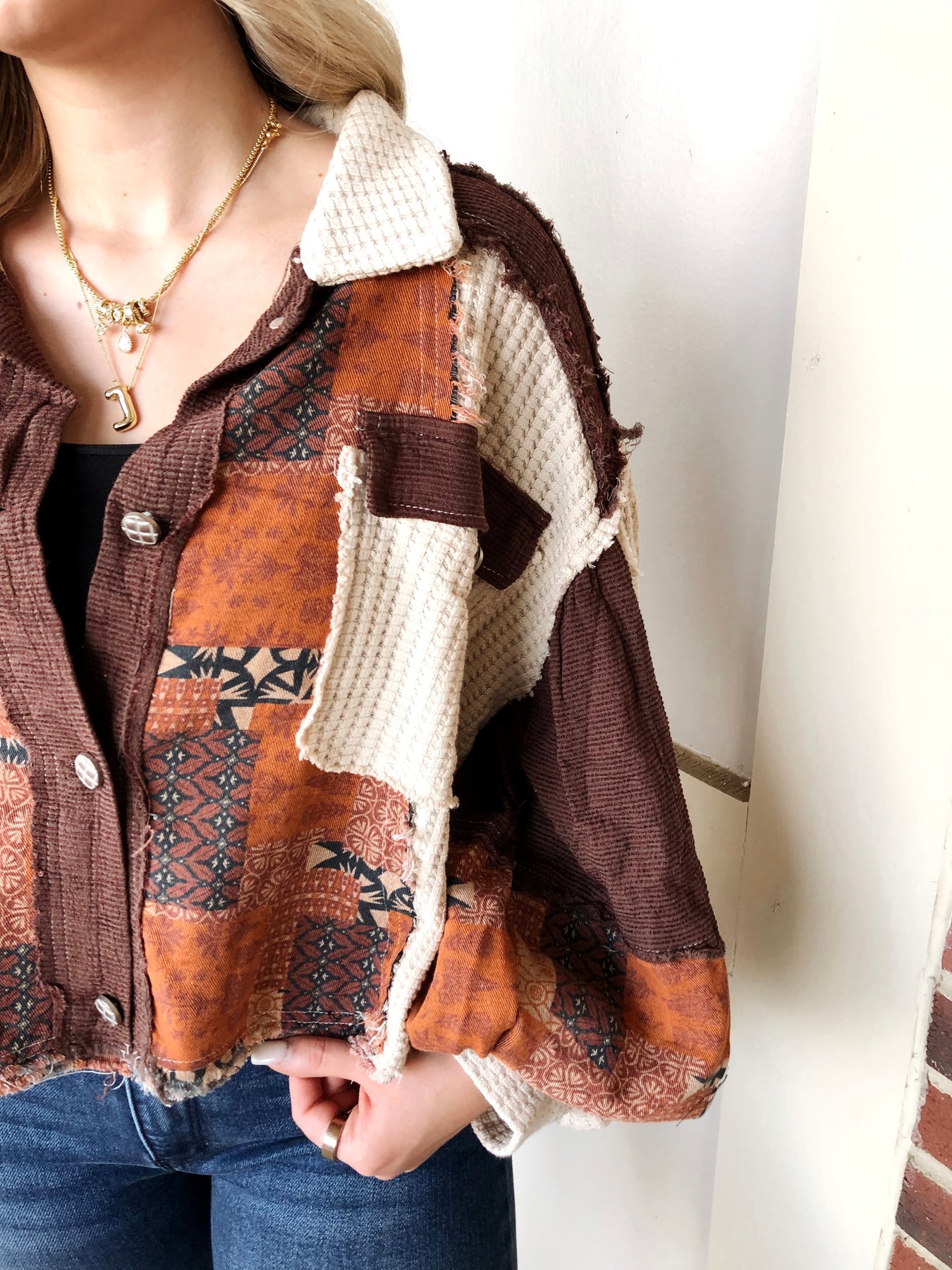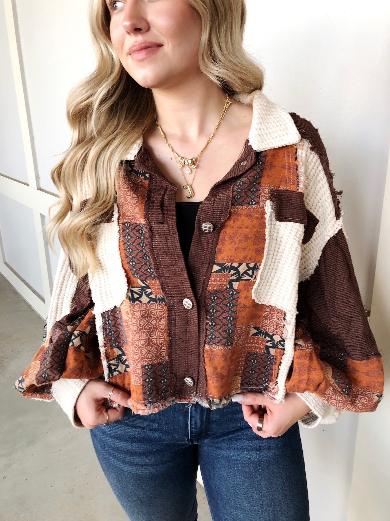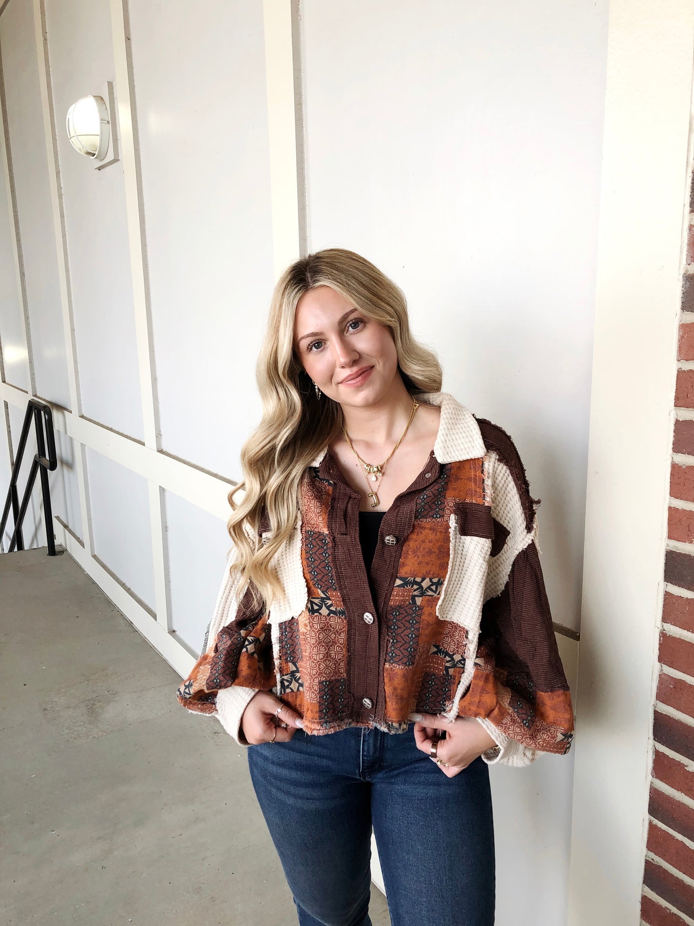 Embrace fall’s fabulous vibes with the No Promises Jacket, featuring a playful mix of fabrics that add texture and fun to your look. Buttoned down the front and finished with two front pockets, this jacket combines style and function effortlessly. Perfect for layering on crisp days, it’s your new go-to for turning heads and keeping cozy all season long.