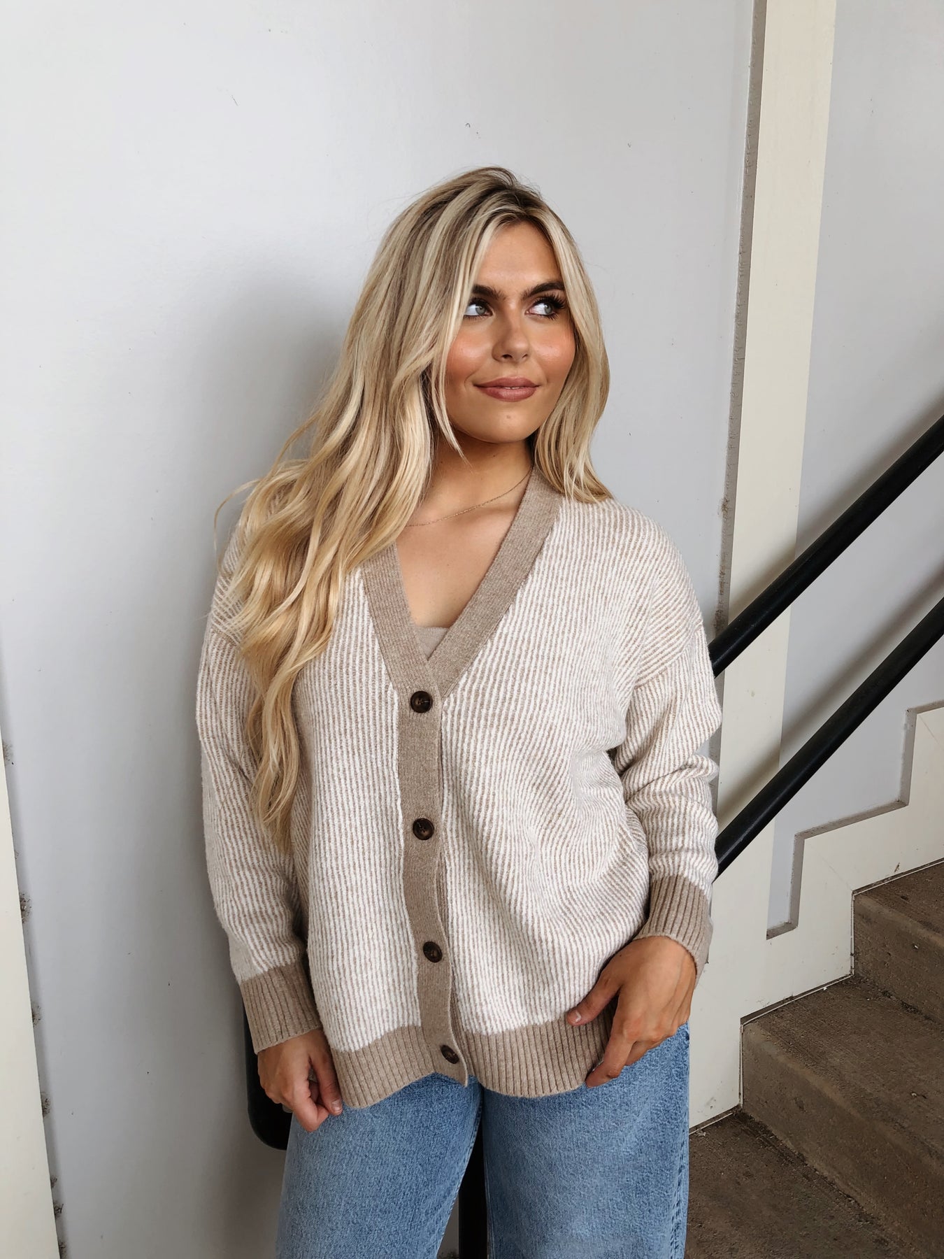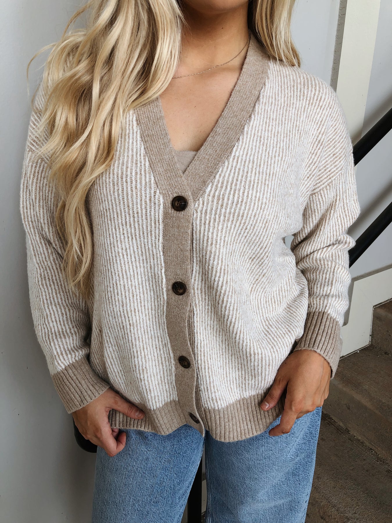 Wrap yourself in cozy charm with the Taupe and Cream Striped Oversized Cardigan, your new favorite for crisp fall days. Its roomy fit and soft stripes make it perfect for layering on relaxed afternoons or casual outings. Easy to style and irresistibly snug, this cardigan effortlessly adds warmth and a playful touch to your wardrobe essentials.