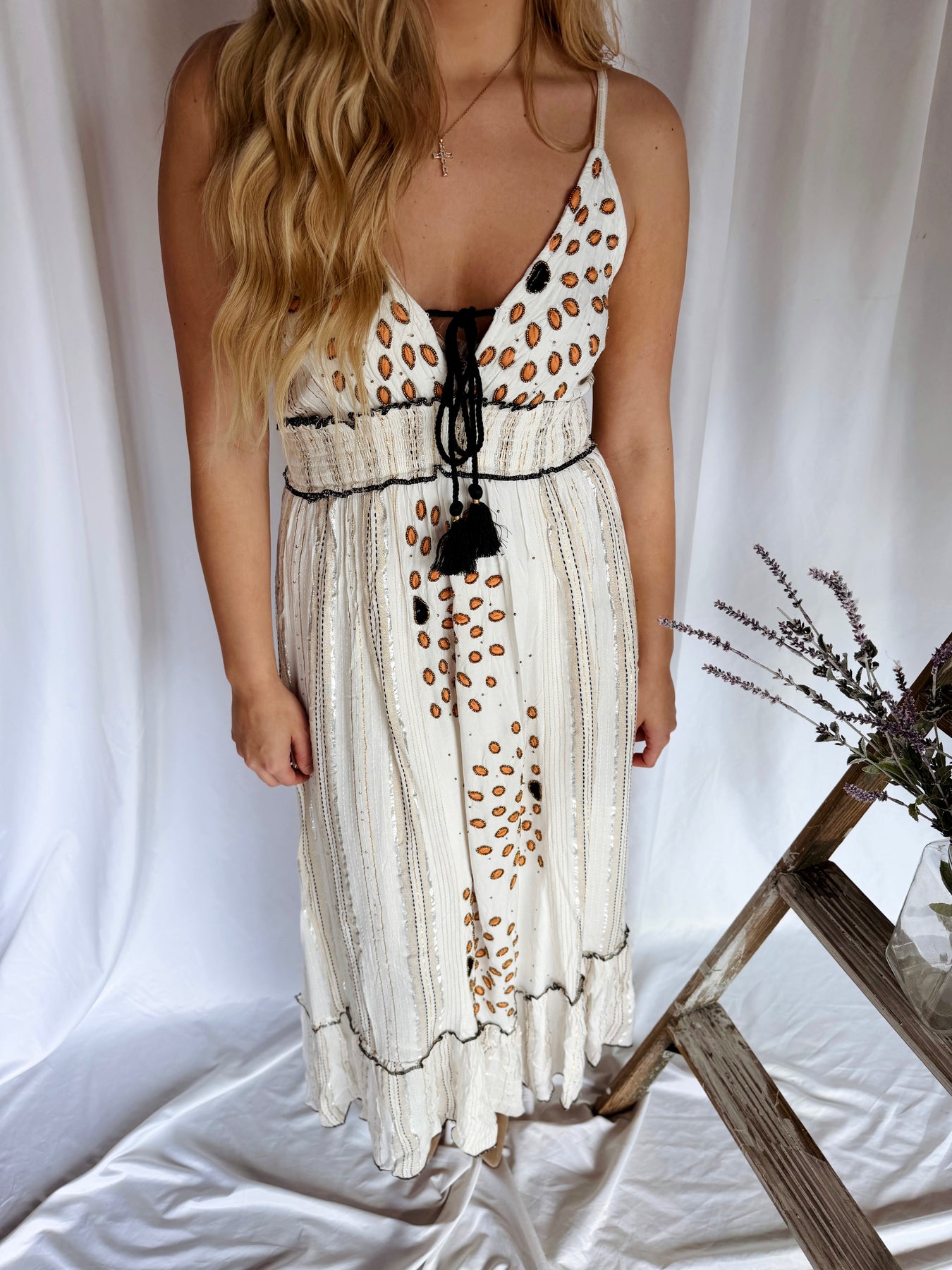 Slip into effortless elegance with this stunning maxi dress that catches the light from every angle. Shimmering metallic threads are woven throughout the fabric, creating a subtle sparkle that transforms you into the star of any gathering. Perfect for evening events, special occasions, or whenever you want to feel absolutely radiant. The flowing silhouette offers comfort and grace, while the luminous detailing adds just the right touch of glamour without overwhelming your natural beauty. Dress it up with heels or keep it casual—this versatile piece adapts to your style.