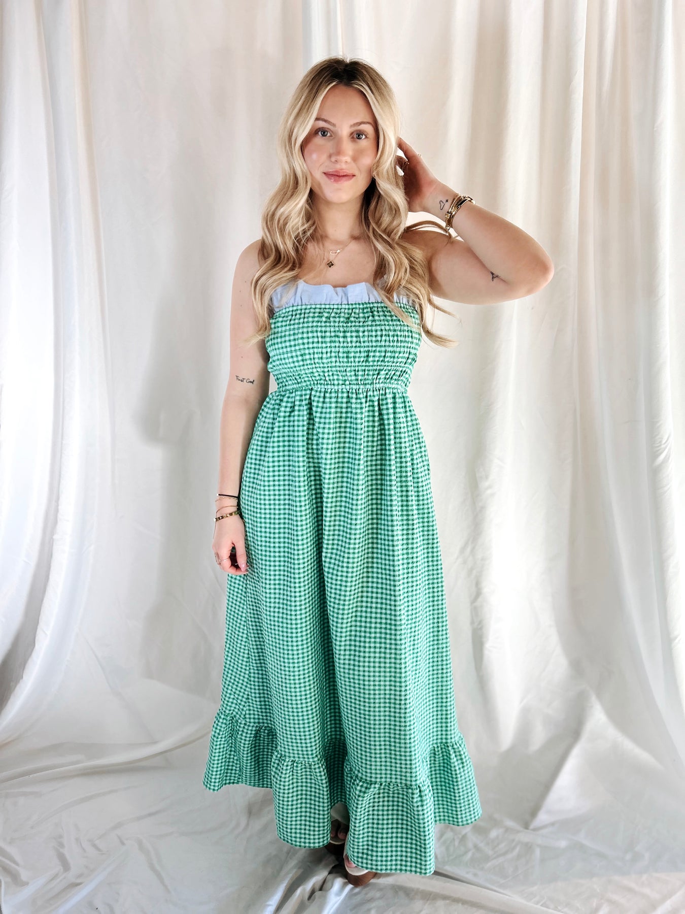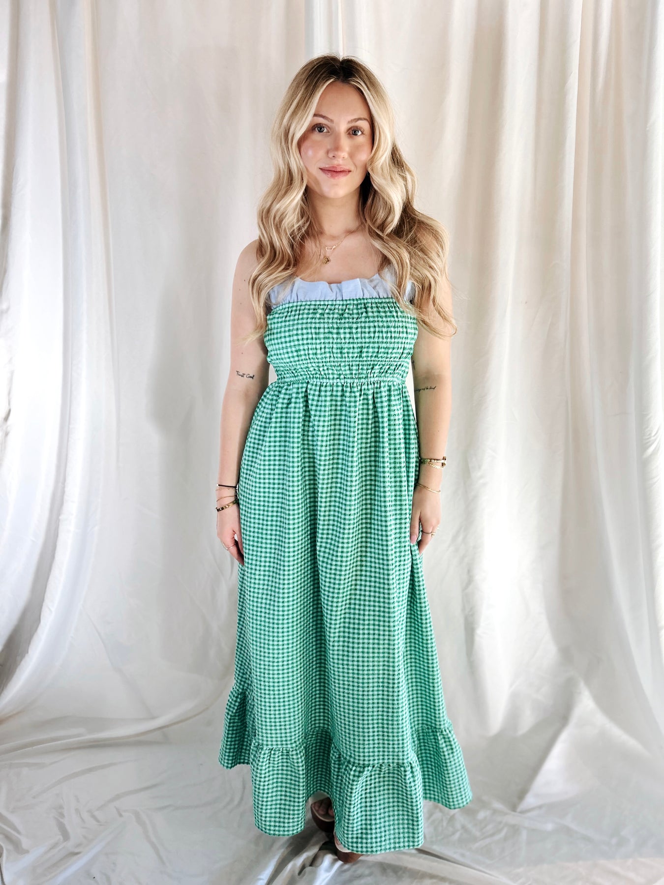 Slip into effortless charm with this electric gingham maxi dress, where delicate thin straps meet a flattering smocked bodice. The timeless gingham pattern brings a fresh, cheerful vibe perfect for summer adventures, while the flowing maxi silhouette keeps you cool and comfortable. Whether you're heading to a garden party or a casual weekend getaway, this dress delivers style that feels as good as it looks. A playful wardrobe essential that transitions seamlessly from day to night.