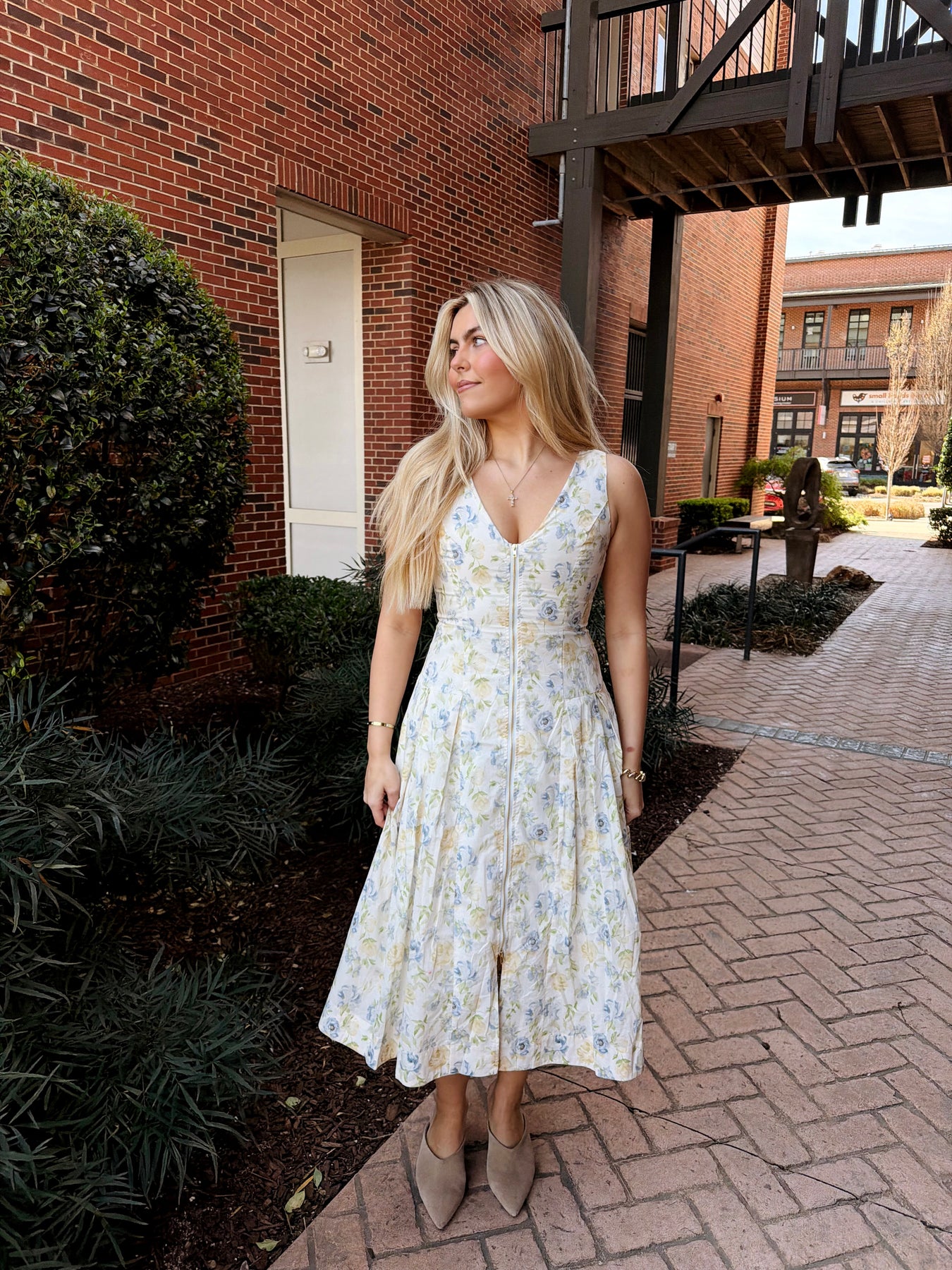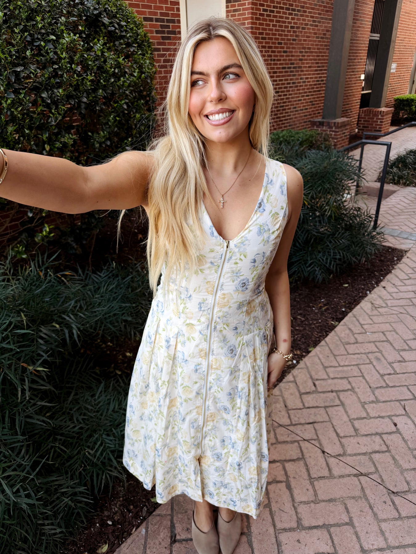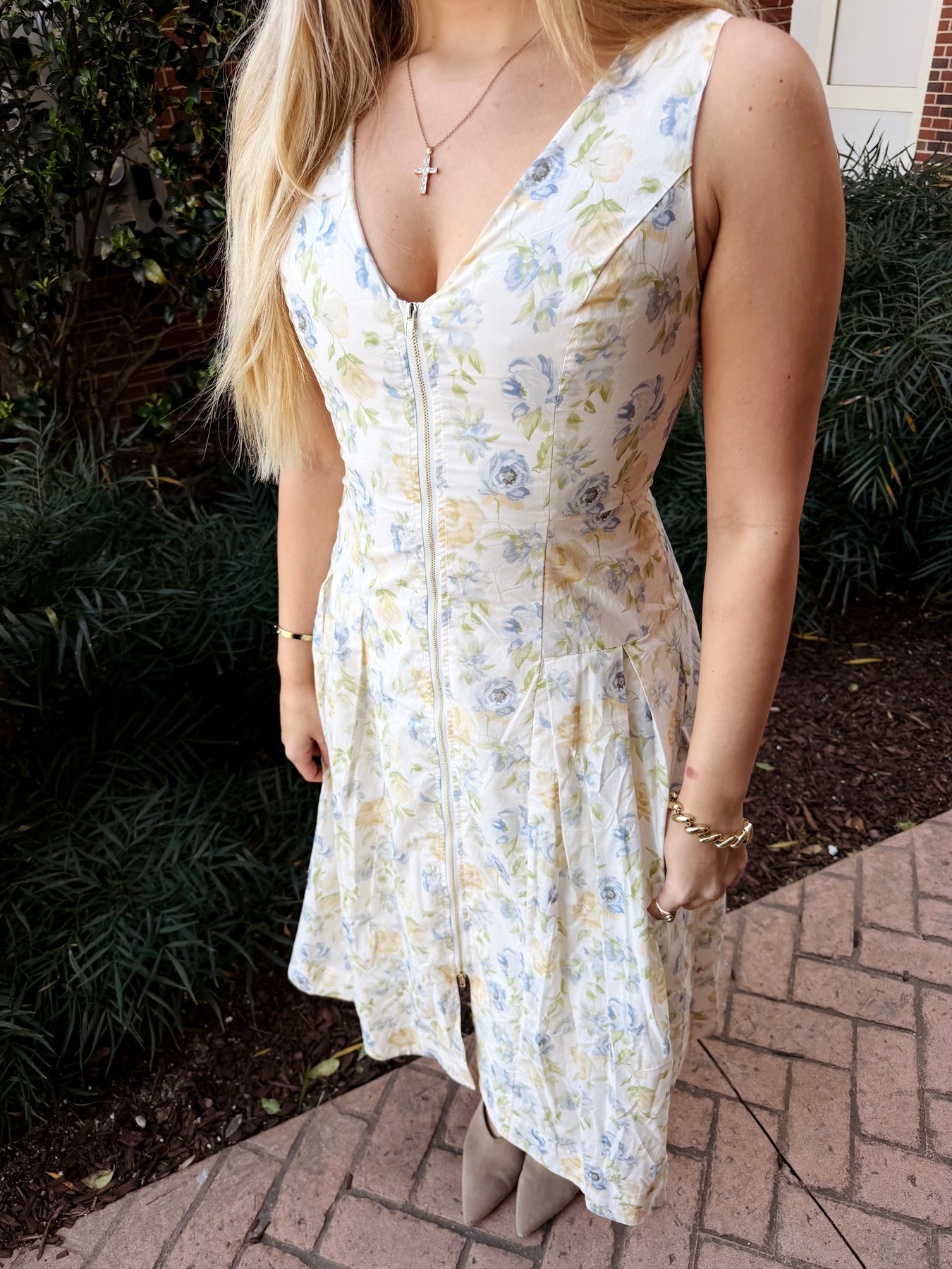 Elevate your spring wardrobe with this stunning front-zip floral dress. The midi silhouette flatters your figure while the cinched waist creates a polished, defined look. Perfect for Easter celebrations and special occasions, this piece transitions beautifully from daytime events to evening gatherings. The convenient front zip makes dressing effortless, while the vibrant floral print adds timeless charm to any ensemble.