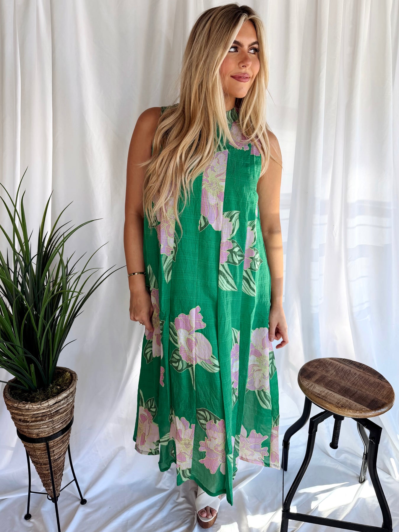 Embrace your inner nature goddess in this enchanting floral print midi dress. The rich kelly green backdrop creates a lush canvas for delicate blooms, perfect for garden parties, brunch dates, or whenever you want to feel effortlessly elegant. The midi length offers a sophisticated silhouette that flatters all figures, while the playful floral pattern brings joy and movement to your wardrobe. Whether you're strolling through farmers markets or attending outdoor celebrations, this dress captures that perfect balance between whimsical and refined. A true closet essential that transitions beautifully from day to night.