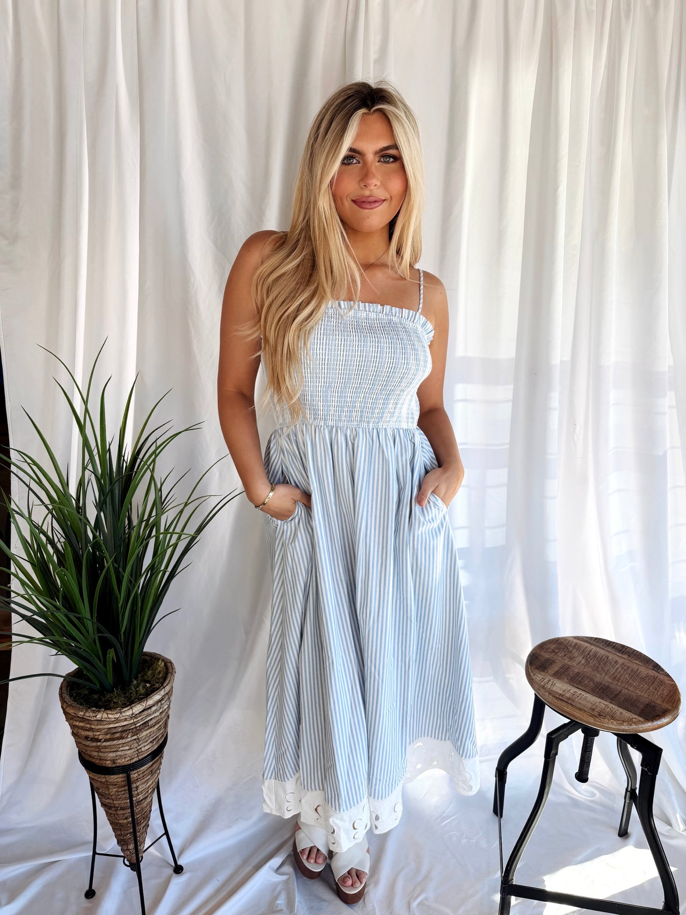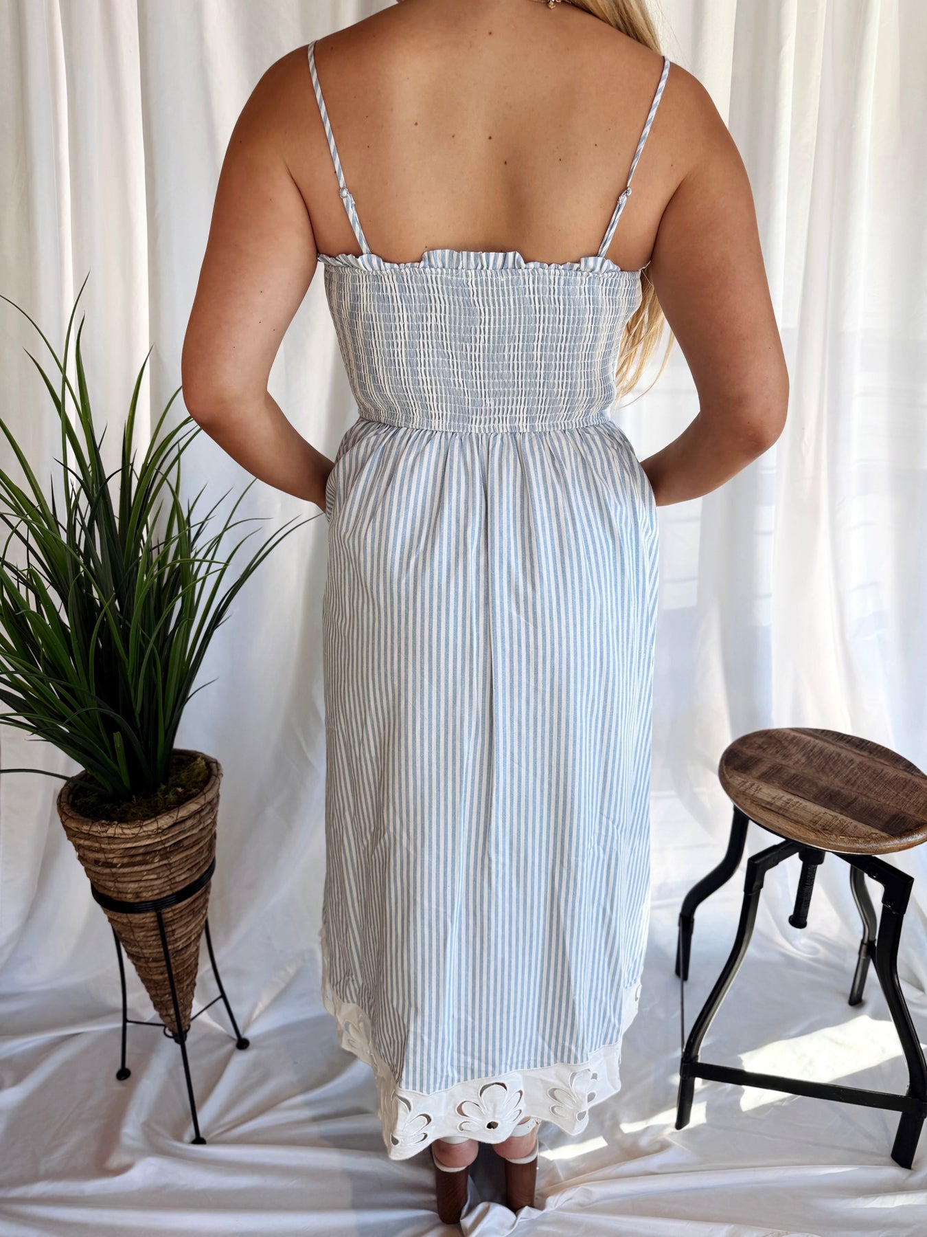 Escape to somewhere sunny in this breezy midi dress, where delicate smocking meets charming light blue stripes for an effortlessly chic vibe. The intricate embroidery details add a touch of whimsy, while the relaxed fit keeps you comfortable from brunch to sunset strolls. Perfect for those days when you want to look put-together without trying too hard—pack it, wear it, love it.