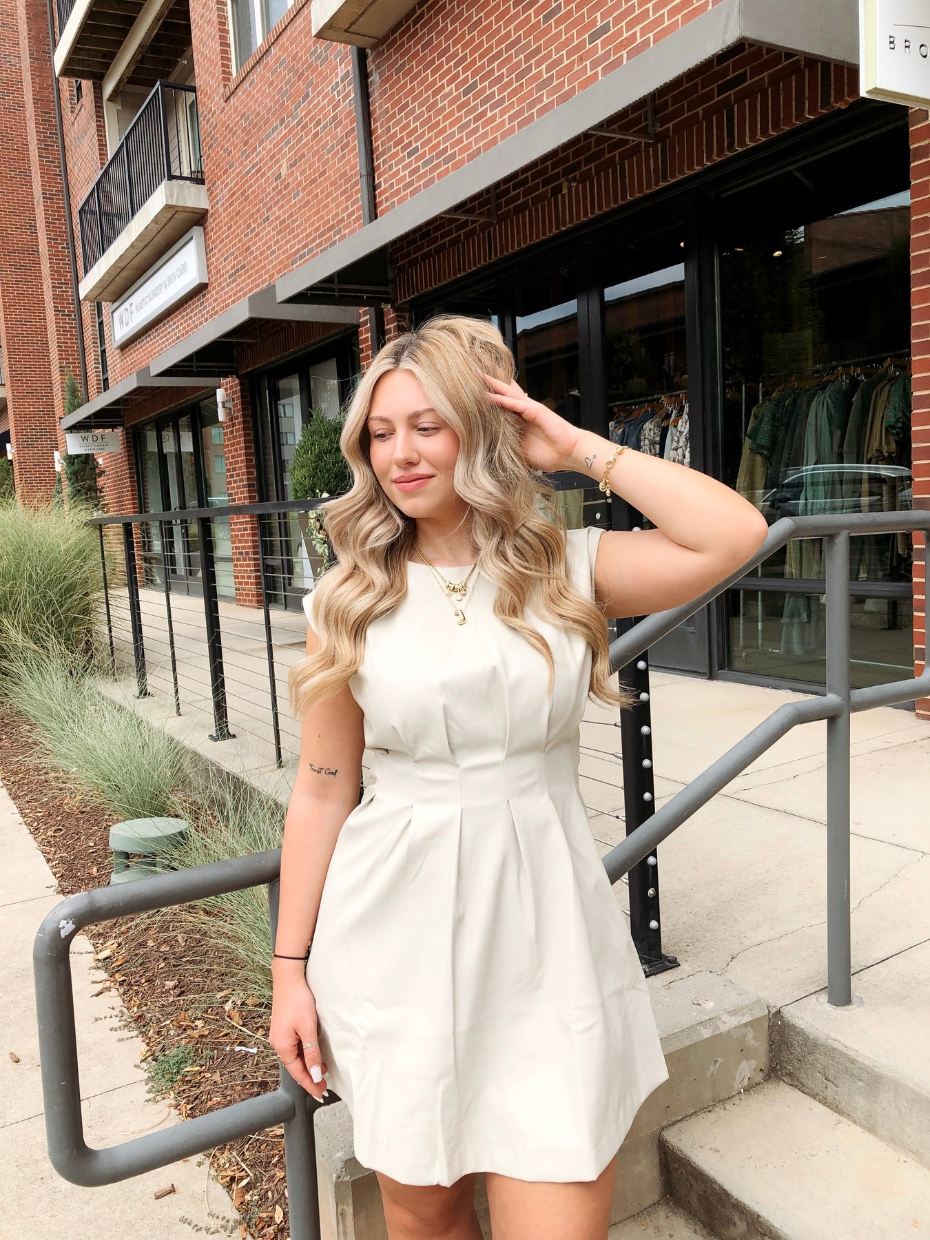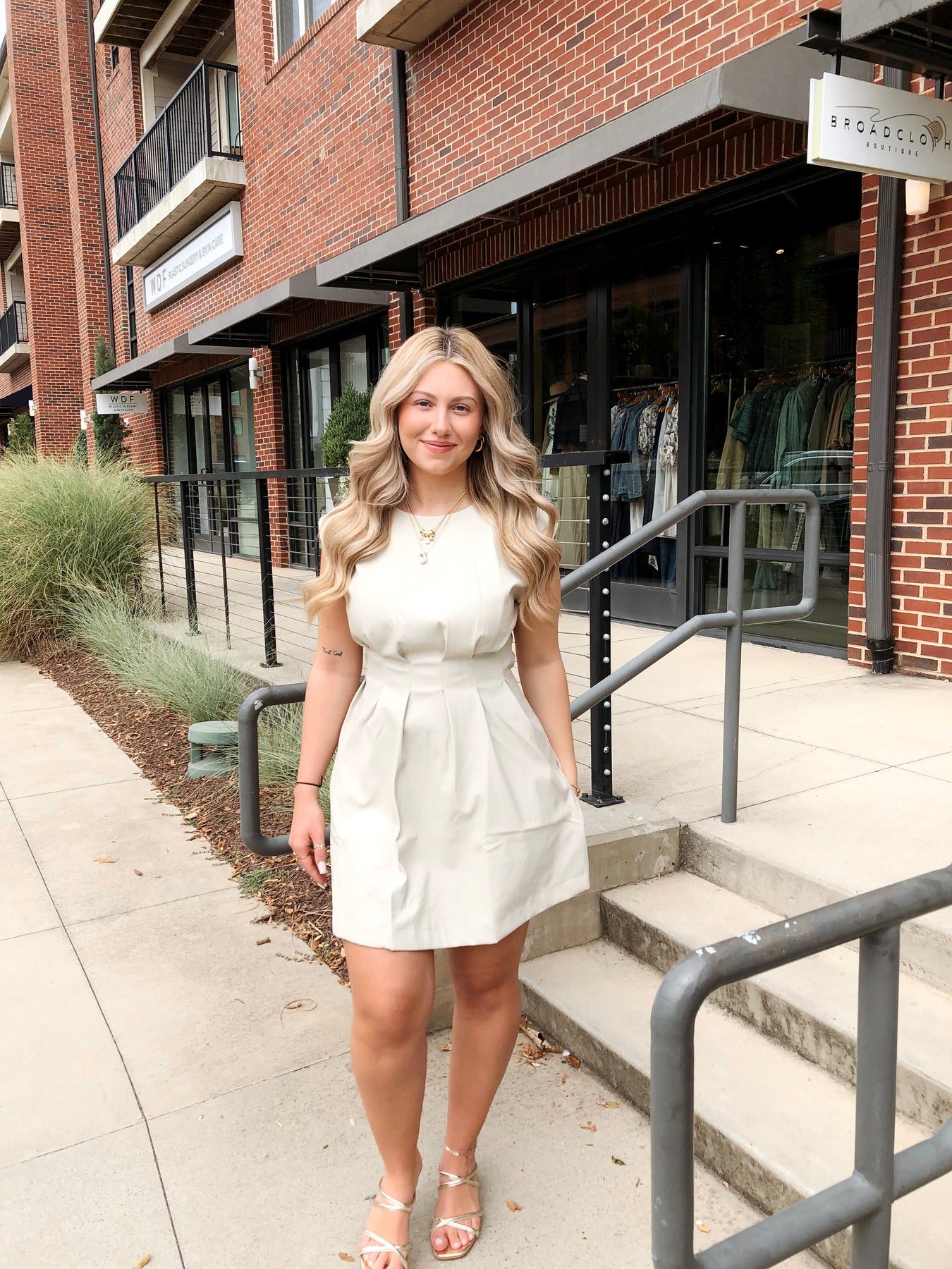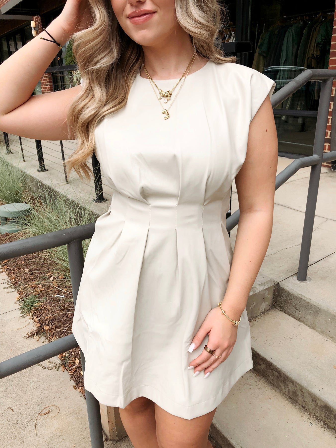 Step into charm with the Charlie Dress, featuring soft beige faux leather that adds a sleek edge to a playful silhouette. Its round neck and waist-pleated midi cut create a flattering shape that's perfect for twirling through the day or dazzling at night. Effortlessly chic and uniquely fun, this dress brings playful sophistication to your wardrobe.