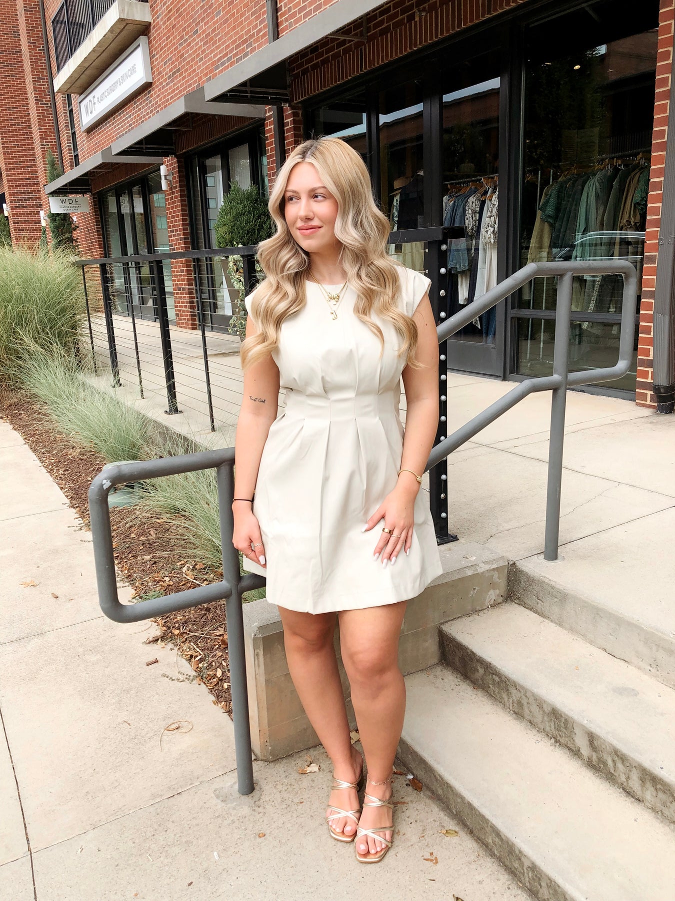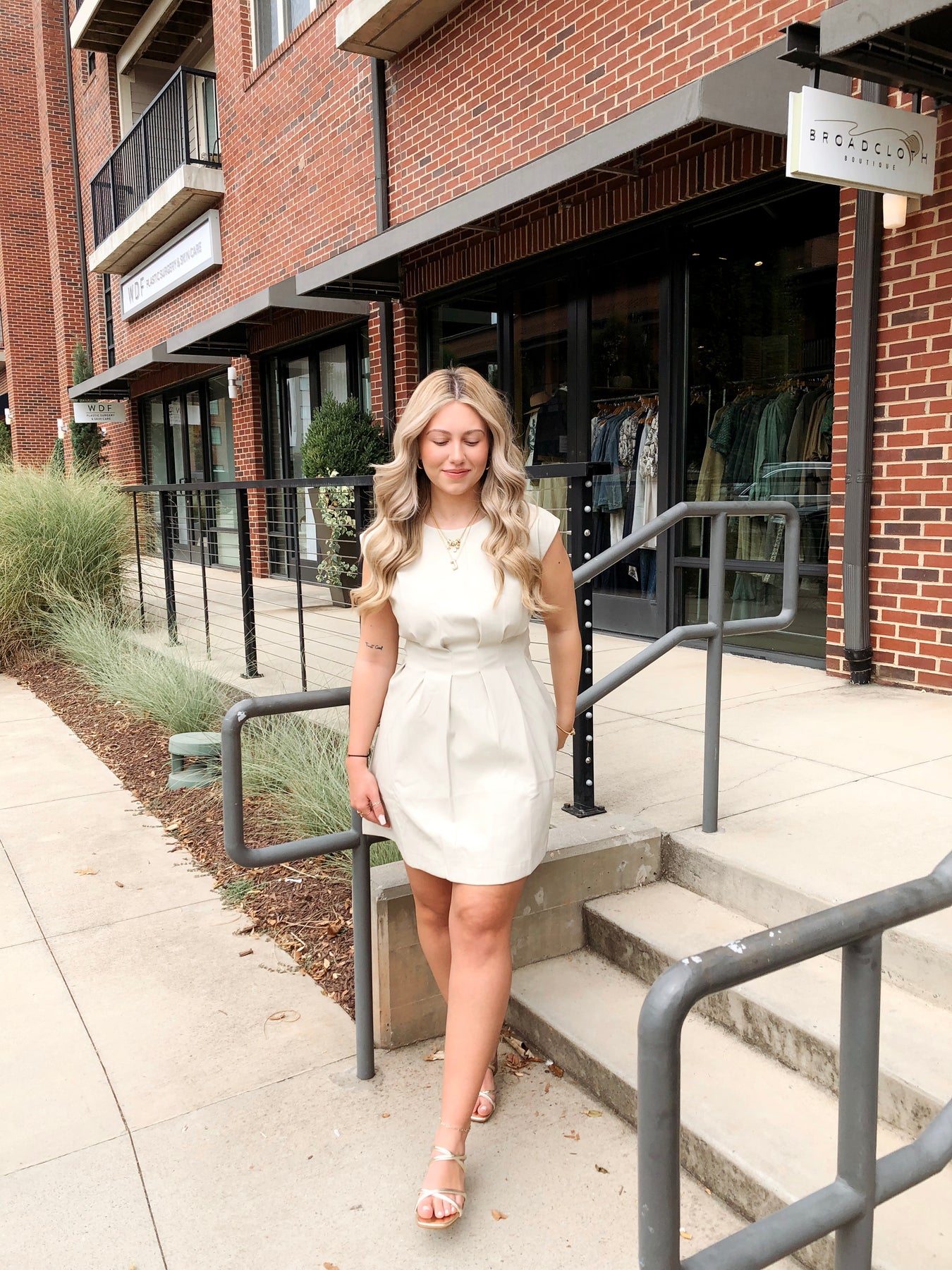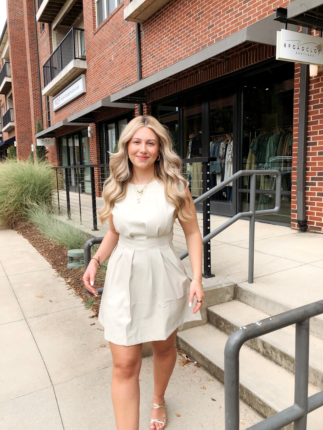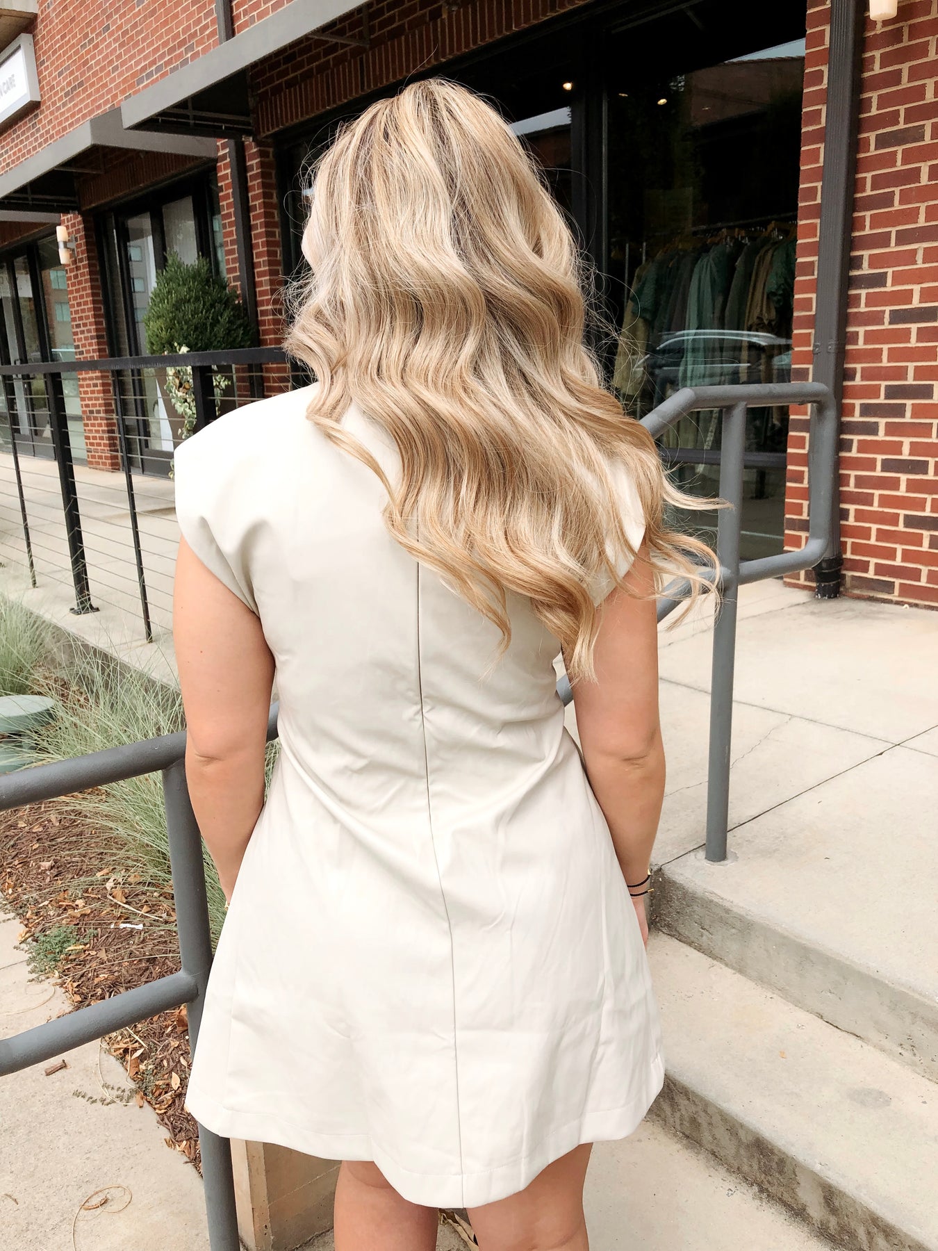 Step into charm with the Charlie Dress, featuring soft beige faux leather that adds a sleek edge to a playful silhouette. Its round neck and waist-pleated midi cut create a flattering shape that's perfect for twirling through the day or dazzling at night. Effortlessly chic and uniquely fun, this dress brings playful sophistication to your wardrobe.