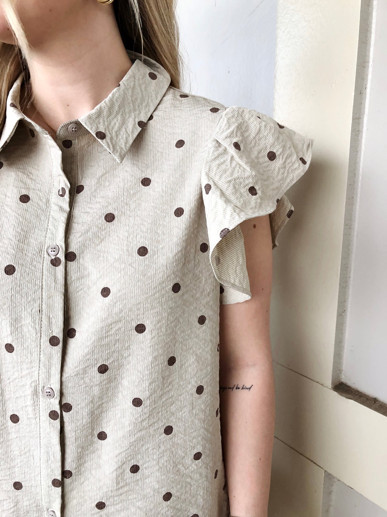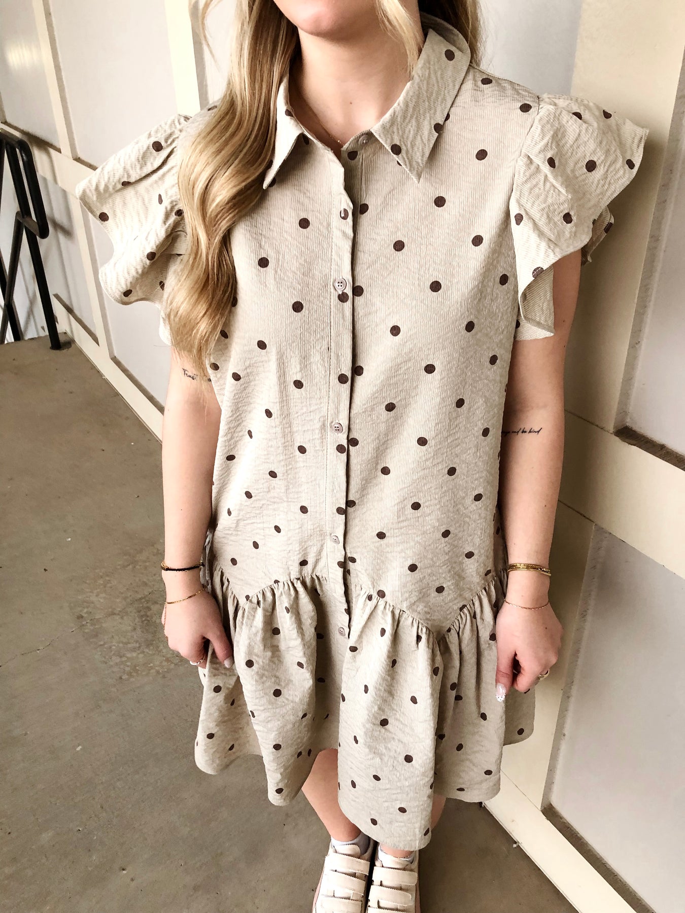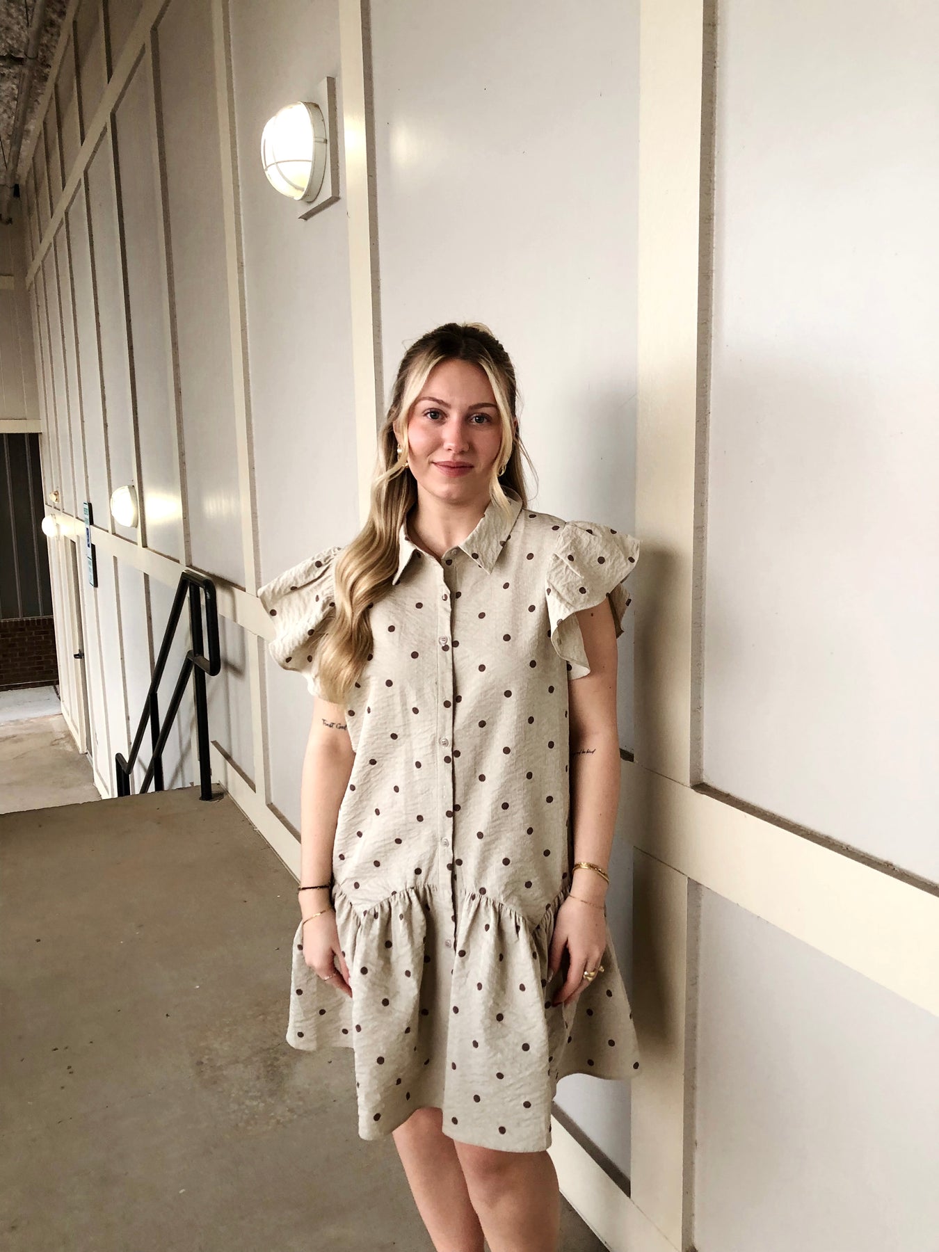 Twirl into spring with this charming seersucker dress that's equal parts vintage-inspired and modern fun. The taupe and brown polka dot pattern brings timeless appeal, while delicate ruffle sleeves add a flirty touch that's impossible to resist. Crafted from breathable seersucker fabric, it's perfect for warm weather adventures—whether you're heading to brunch, a garden party, or anywhere that calls for effortless style. A playful pick that proves pretty never goes out of fashion.