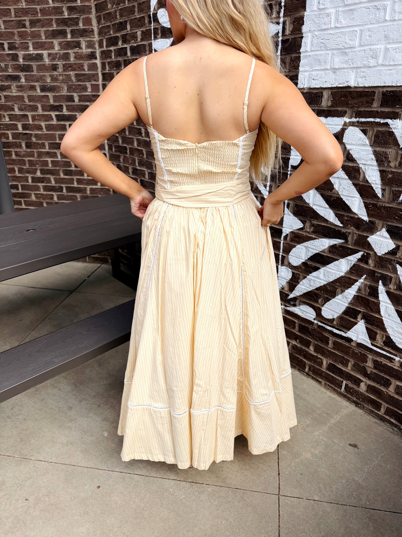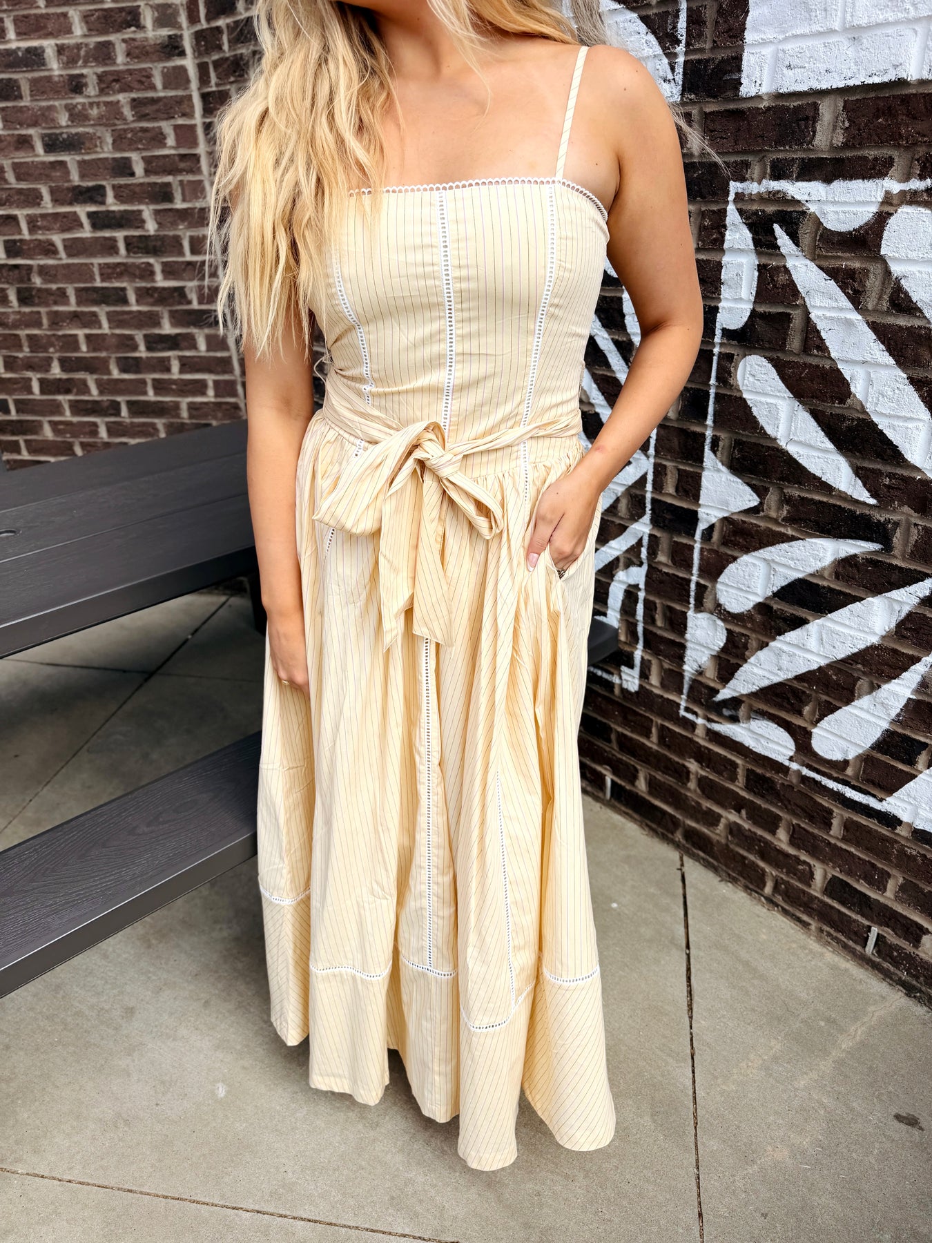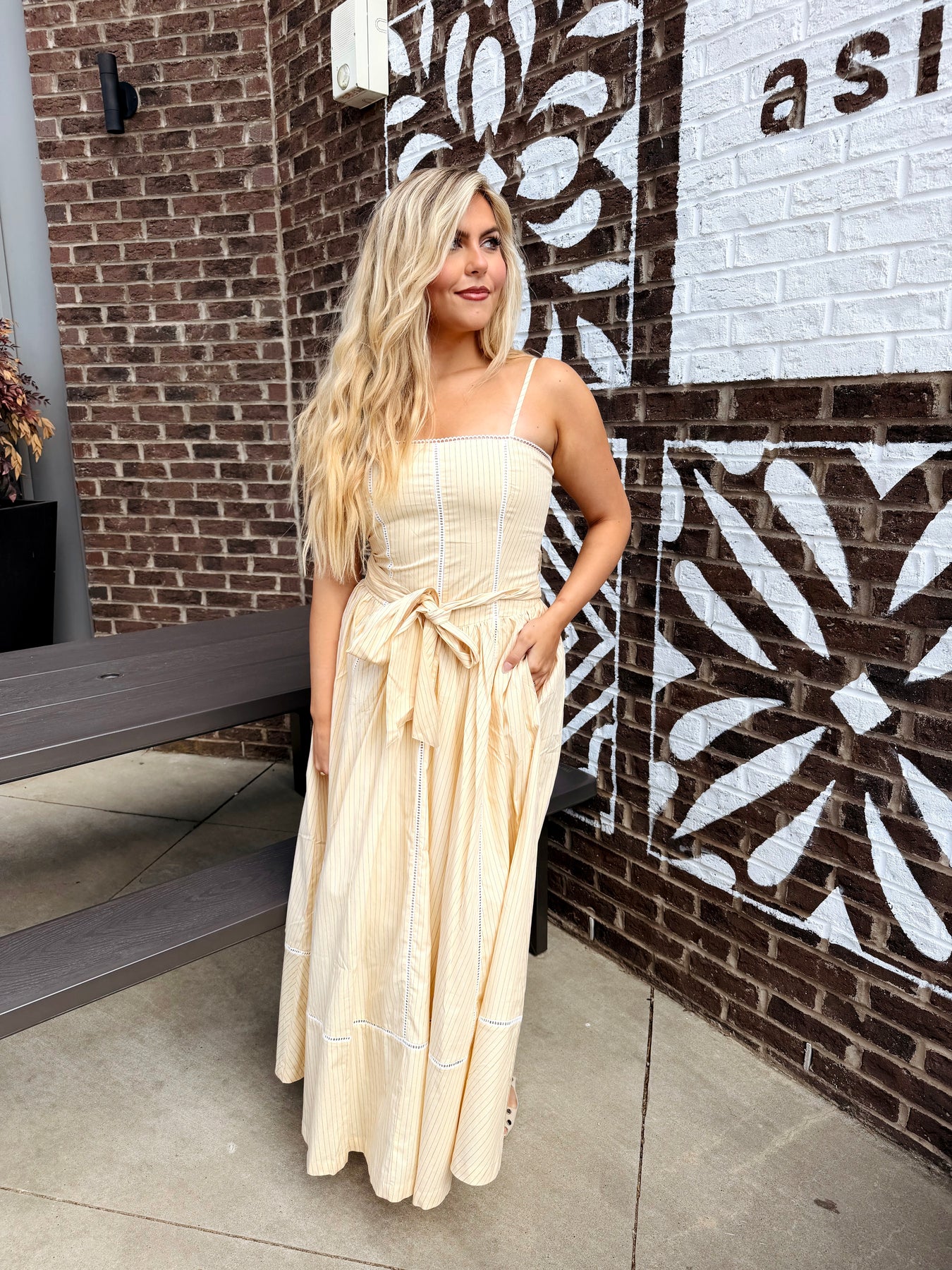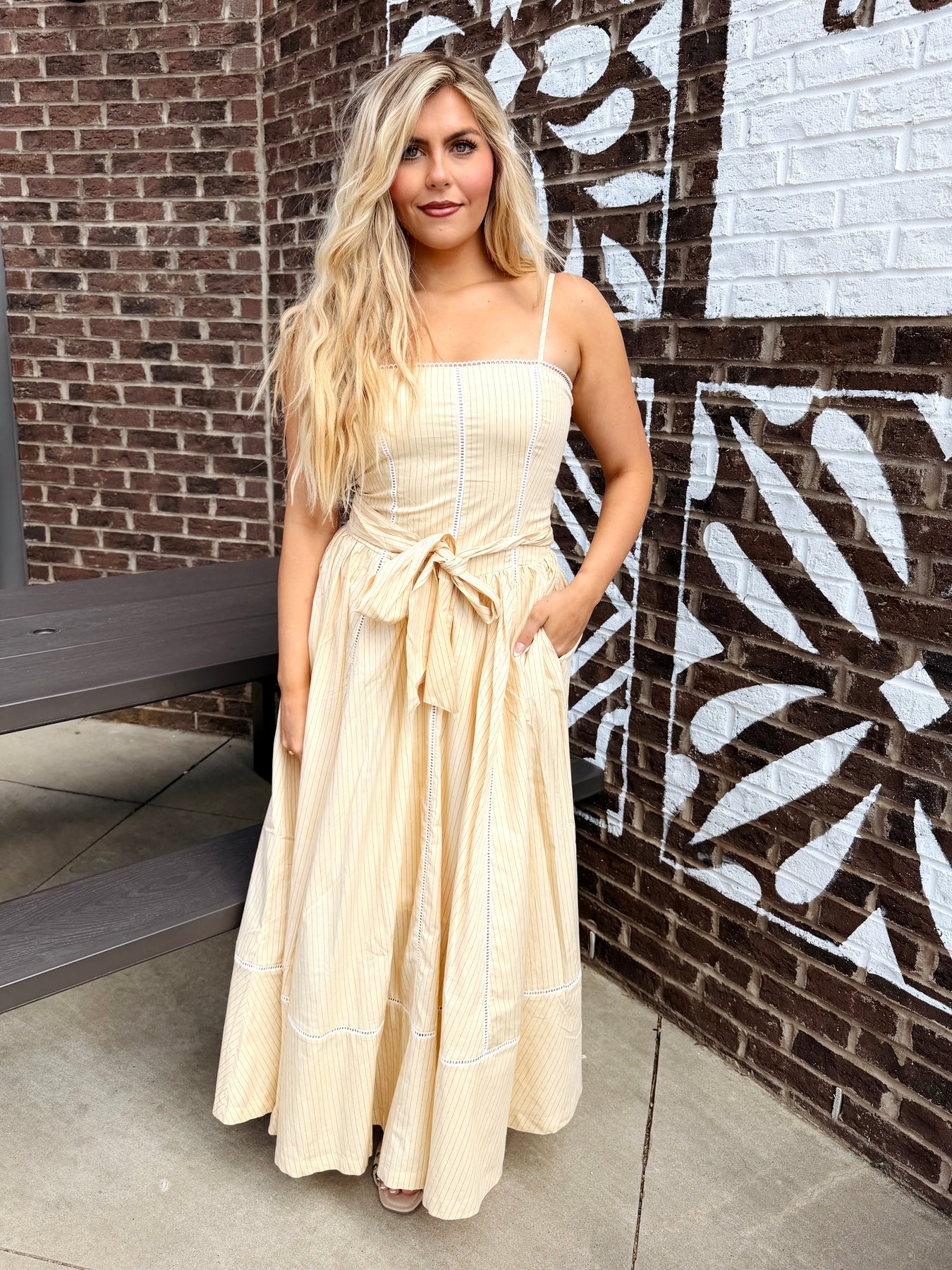 Elevate your spring wardrobe with the Emma Dress, a stunning pale yellow maxi that captures effortless elegance. Delicate lace detailing adds subtle sophistication, while adjustable straps ensure the perfect fit. The tie waist defines your silhouette, and the smocked back provides all-day comfort without compromising style. Ideal for Easter celebrations, garden parties, or any occasion calling for understated glamour.