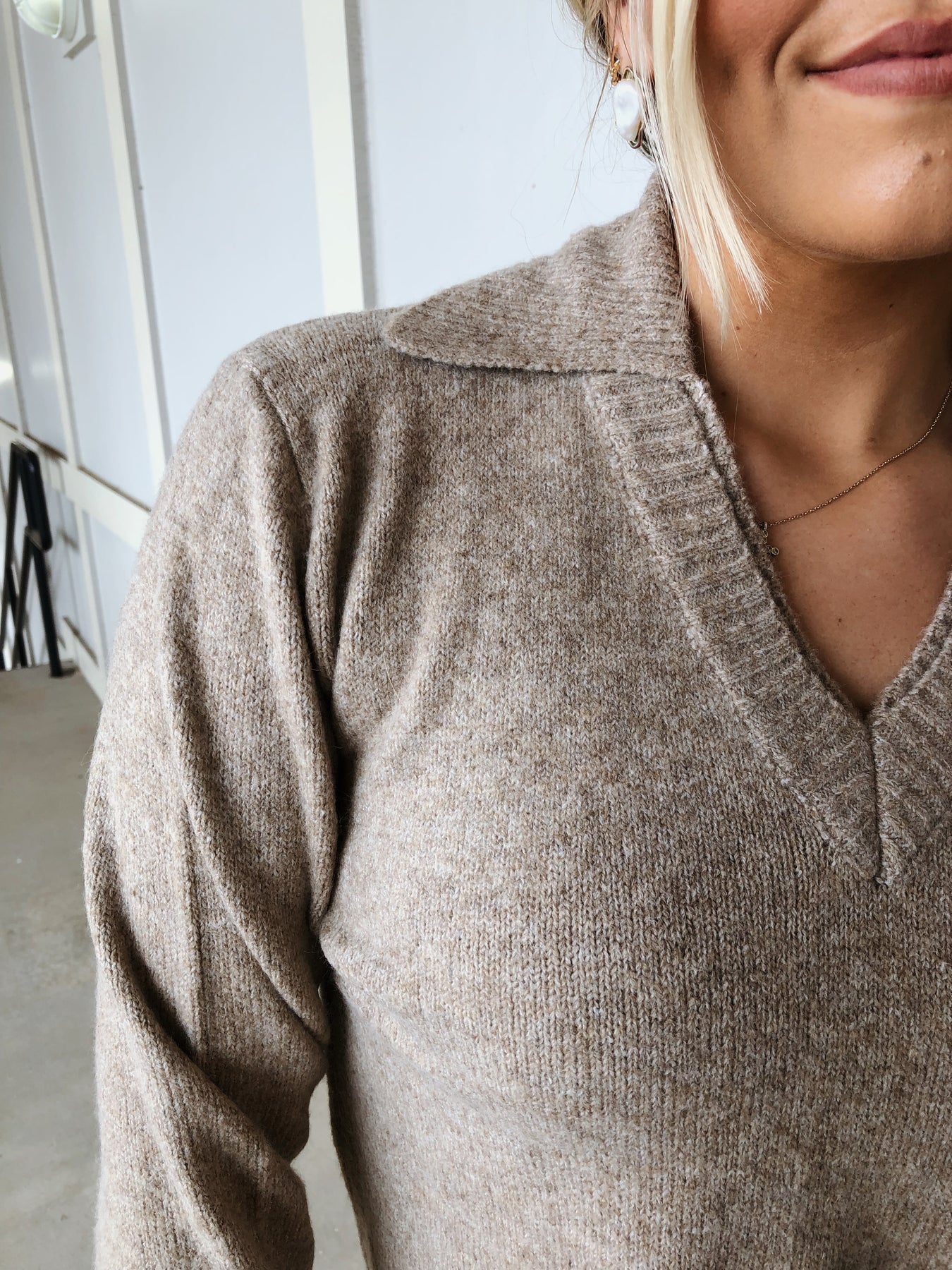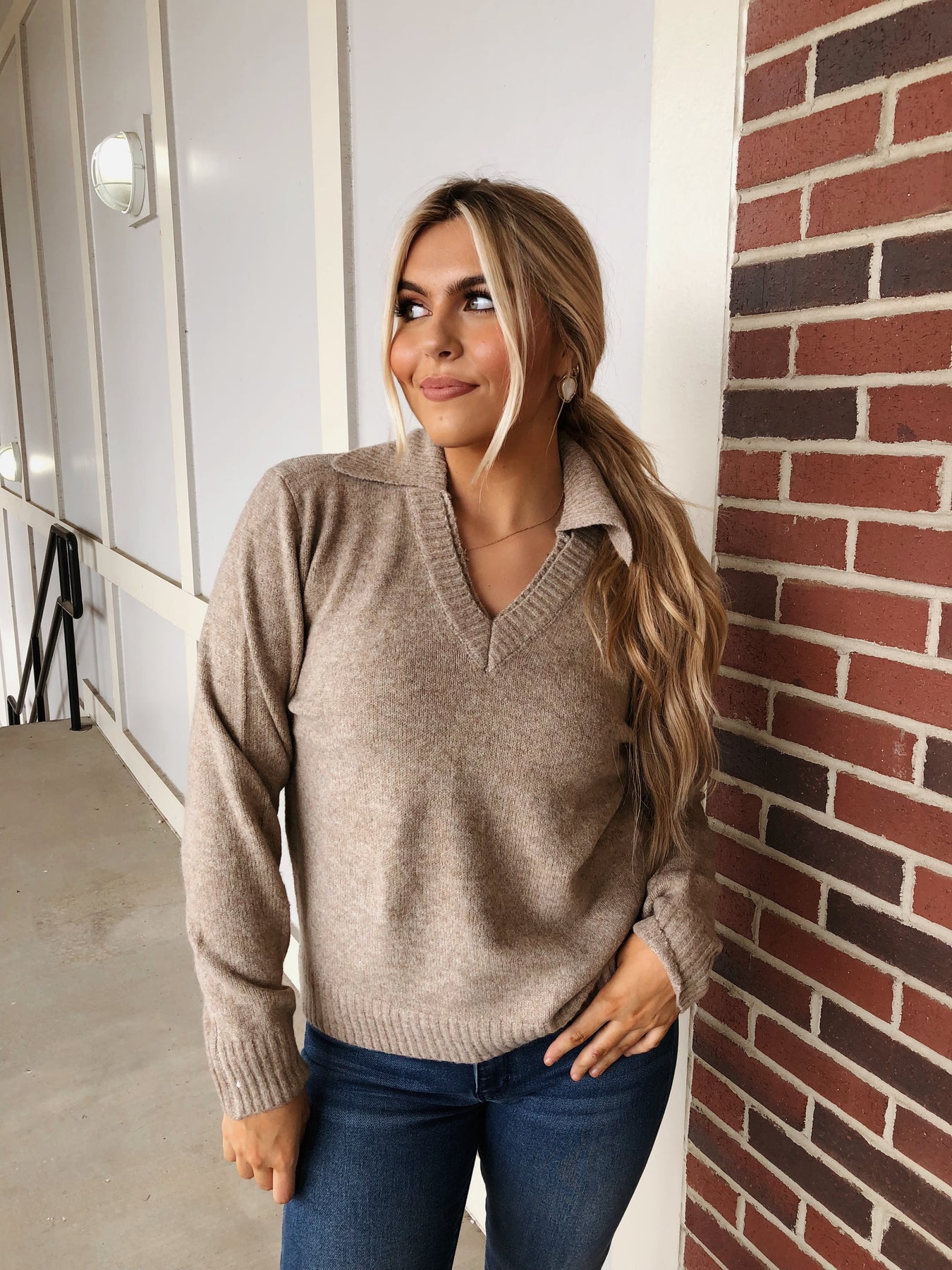 Embrace cozy charm with our taupe V-neck collared sweater, designed to wrap you in warmth and style. The playful collar adds a fun twist to a classic silhouette, making it perfect for layering or wearing solo on cooler days. Soft, inviting fabric lets you feel all the feels—comfort, confidence, and a touch of whimsy—wherever you go.