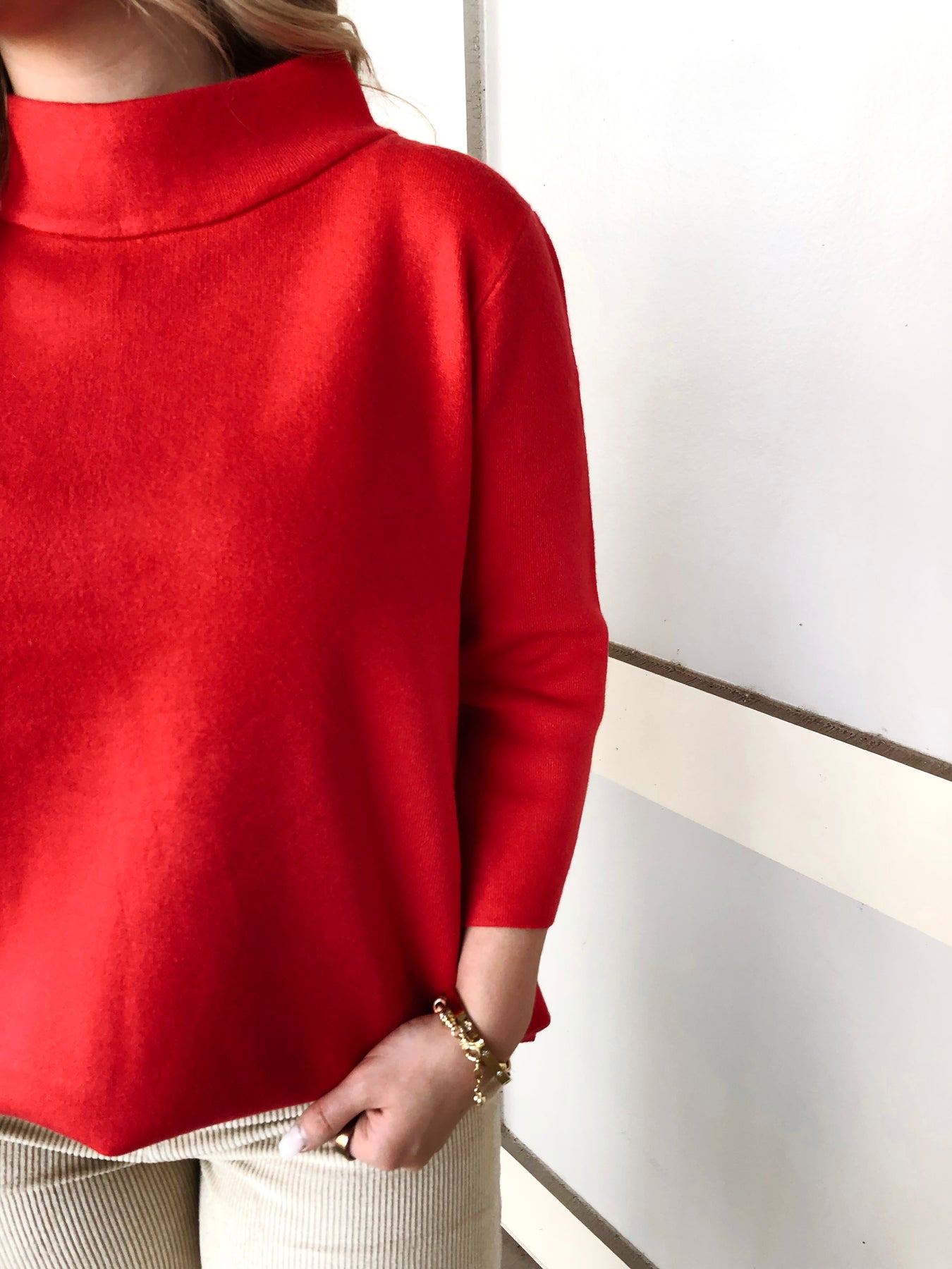 Get cozy in the "I Like Me Better" sweater, featuring a vibrant red mock neck and playful 3/4 bell sleeves. This soft, comfy sweater adds a flirty twist to your casual wardrobe—perfect for feeling confident and stylish with a touch of fun!