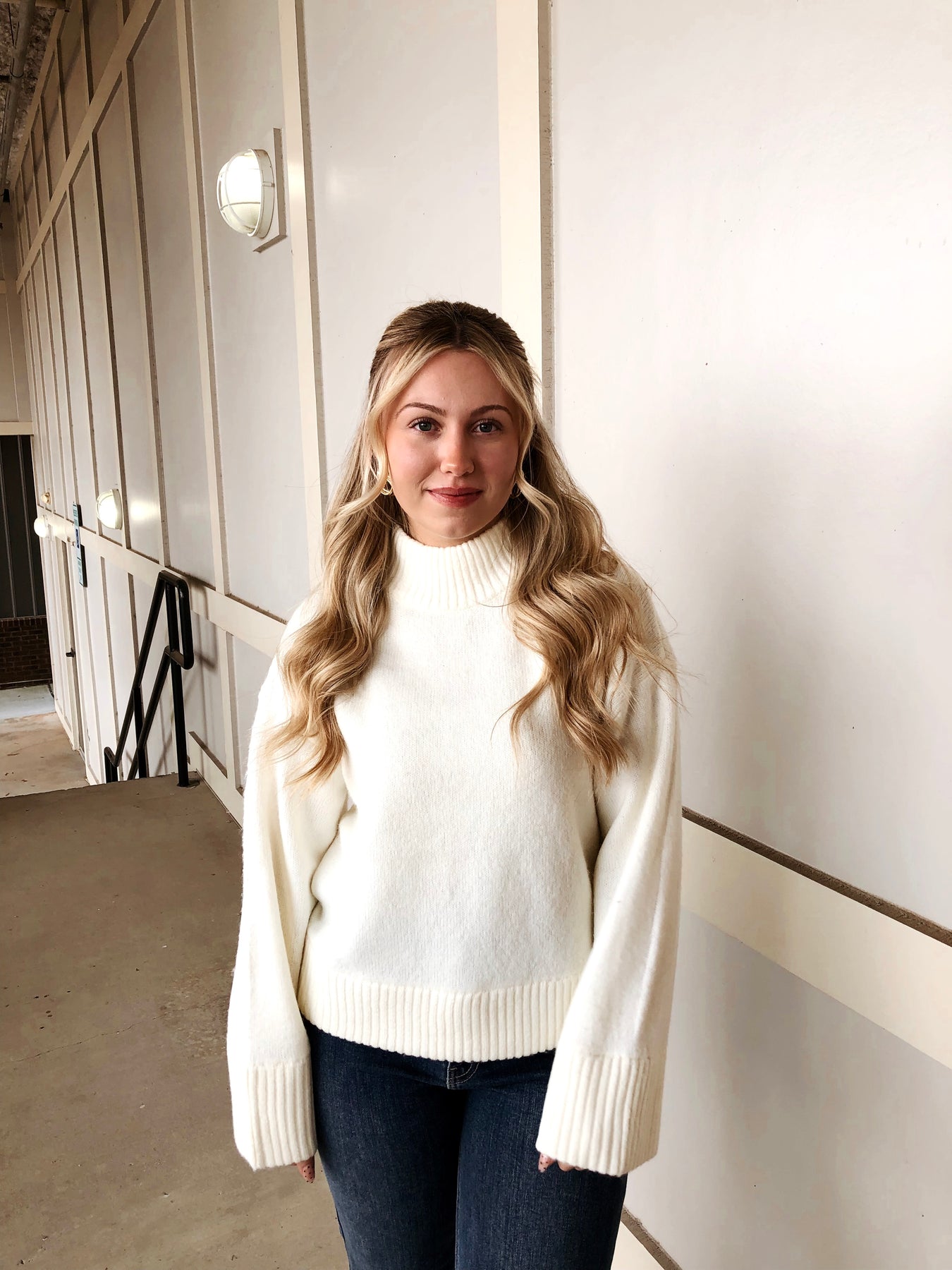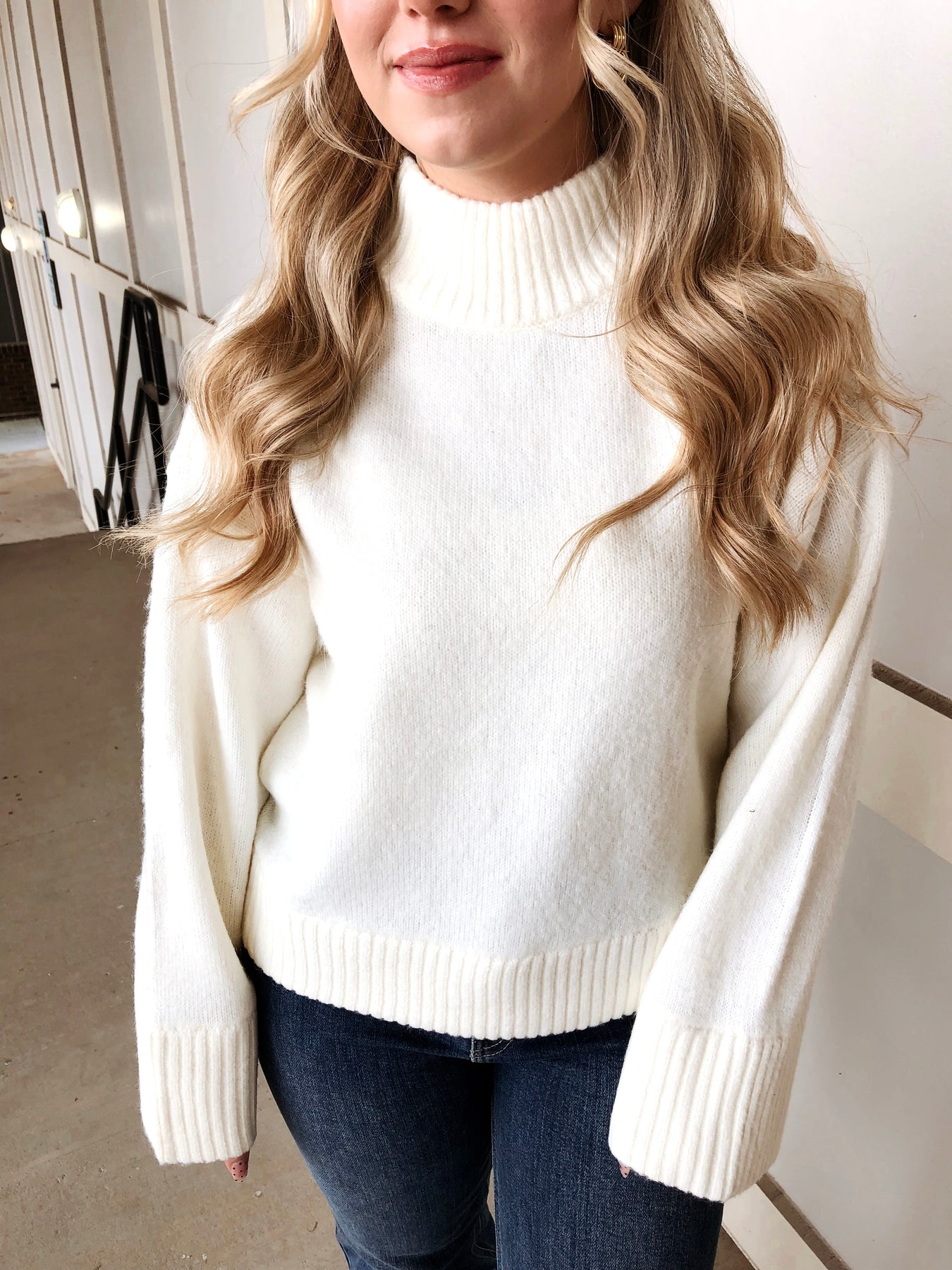 The IVI Sweater brings effortless cool to your everyday rotation. This cream-colored mock neck style features a relaxed dropped shoulder silhouette that feels as good as it looks. Wide ribbing frames the neckline, cuffs, and hem for a polished finish that keeps everything in place. Perfect for layering or wearing solo, it's the cozy essential that works harder than it looks.