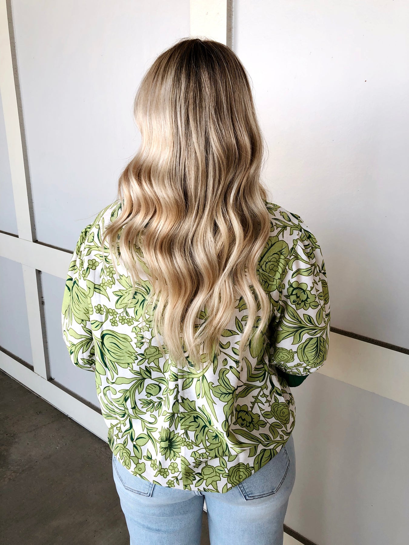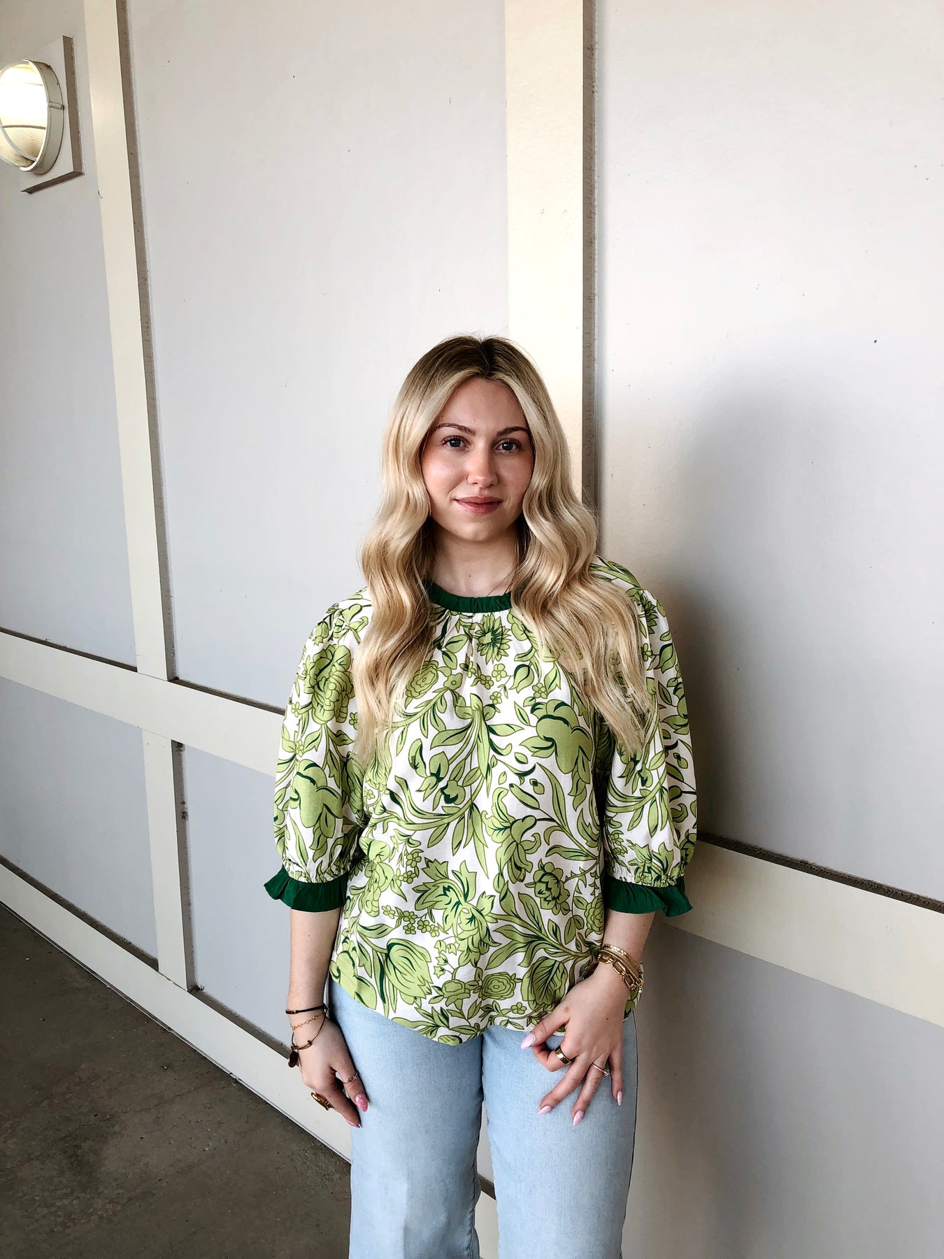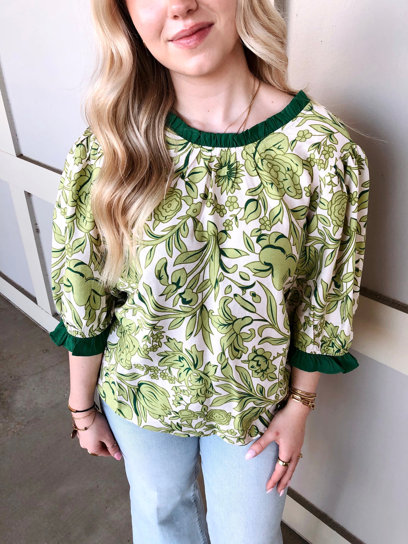 Elevate your wardrobe with this charming floral print top, featuring delicate ruffles that add movement and dimension to your look. The vibrant green floral design brings a fresh, feminine touch perfect for spring and summer styling. Crafted with attention to detail, the ruffle accents frame the neckline and sleeves beautifully, creating an effortlessly polished appearance. Versatile enough for casual outings or dressed-up occasions, this top pairs seamlessly with your favorite jeans, skirts, or trousers for endless styling possibilities.