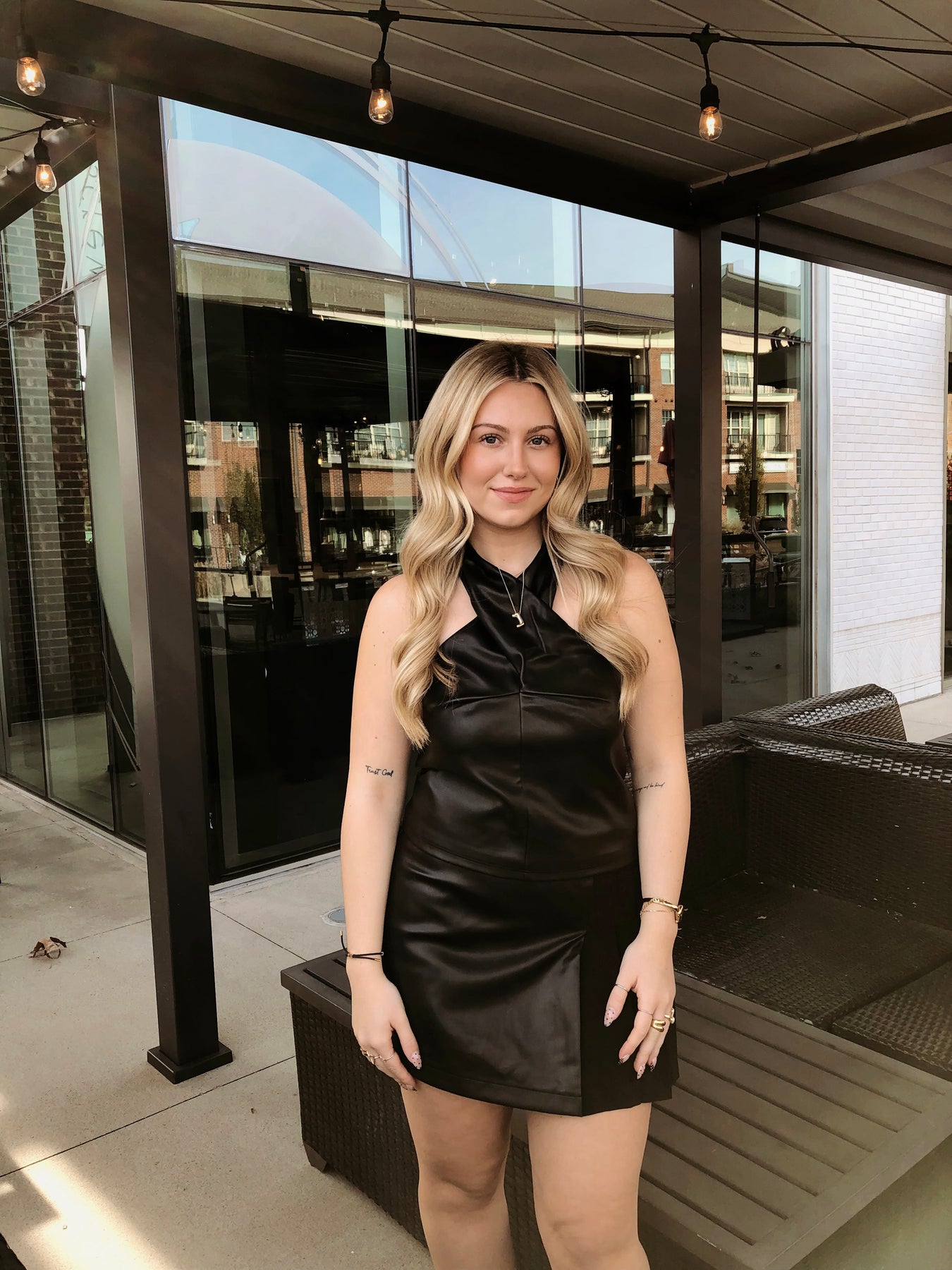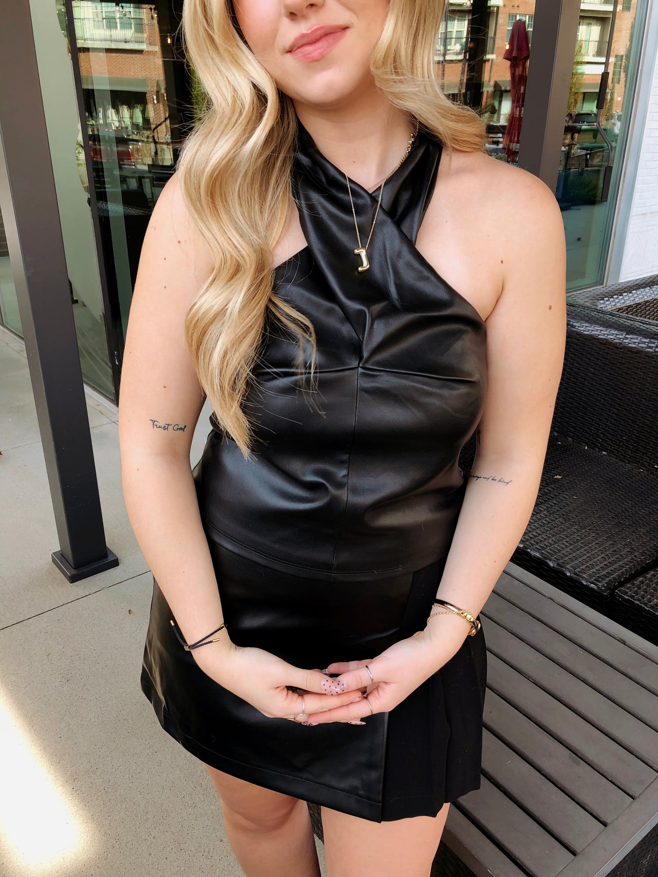 Add a twist to your wardrobe with the Marcelle Top. This halter top, made of black faux leather, features a unique twisted neckline that is sure to make a statement. Stand out in style and comfort with this fun and edgy top.