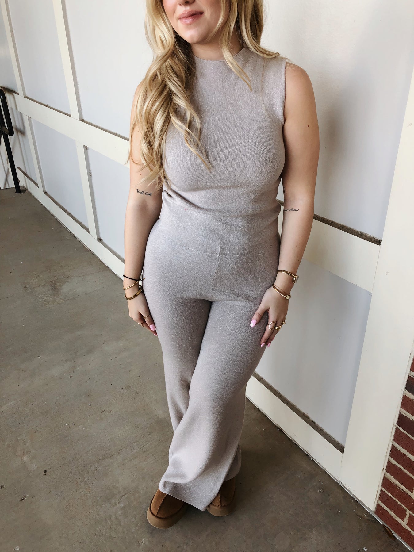 Elevate your holiday wardrobe with this stunning mock neck sleeveless top, crafted from soft silver lurex that catches the light beautifully. Perfect for festive occasions, wear it solo for a chic statement or pair it with our Santa Baby pants for a coordinated look that's ready to celebrate. Effortlessly glamorous and undeniably eye-catching.