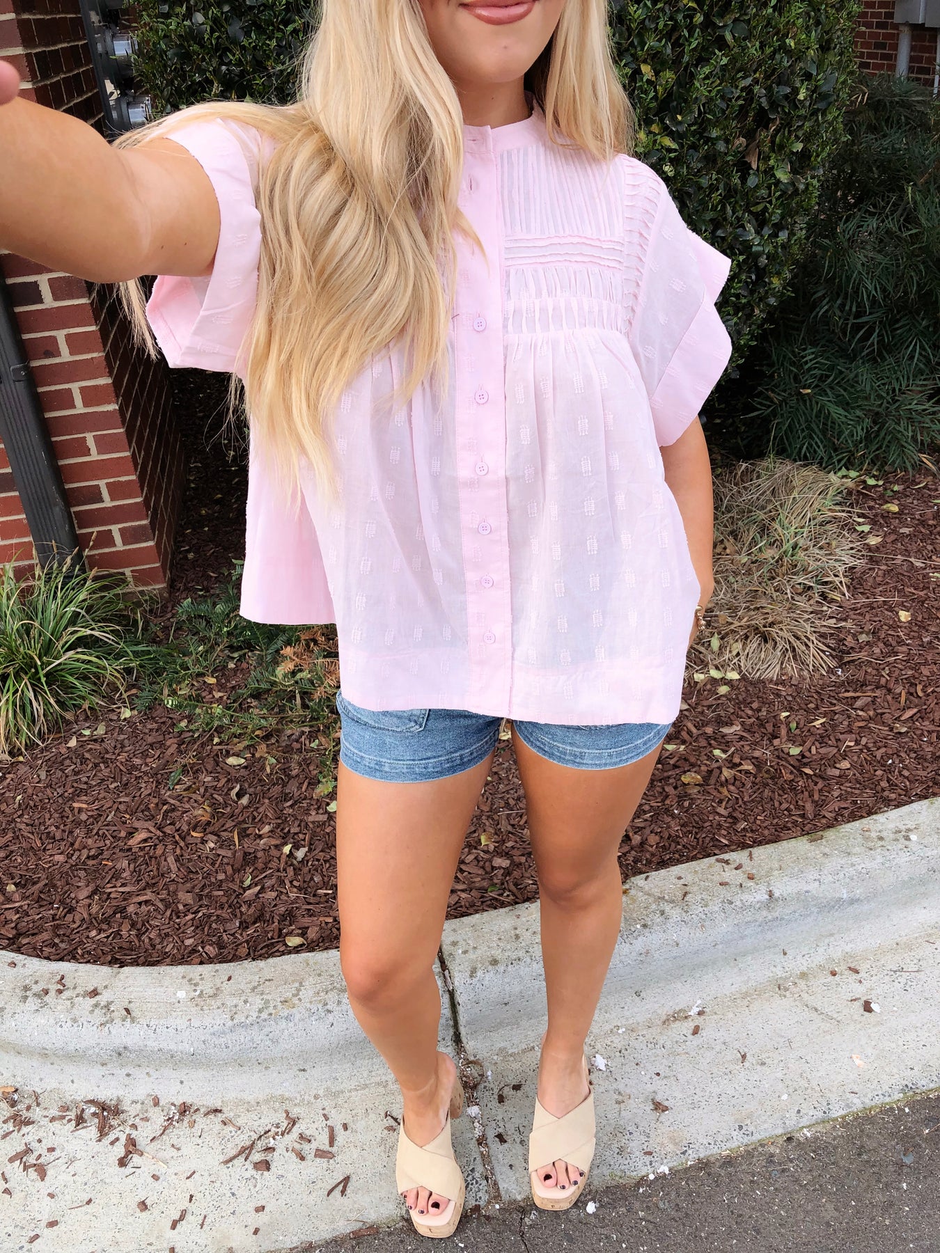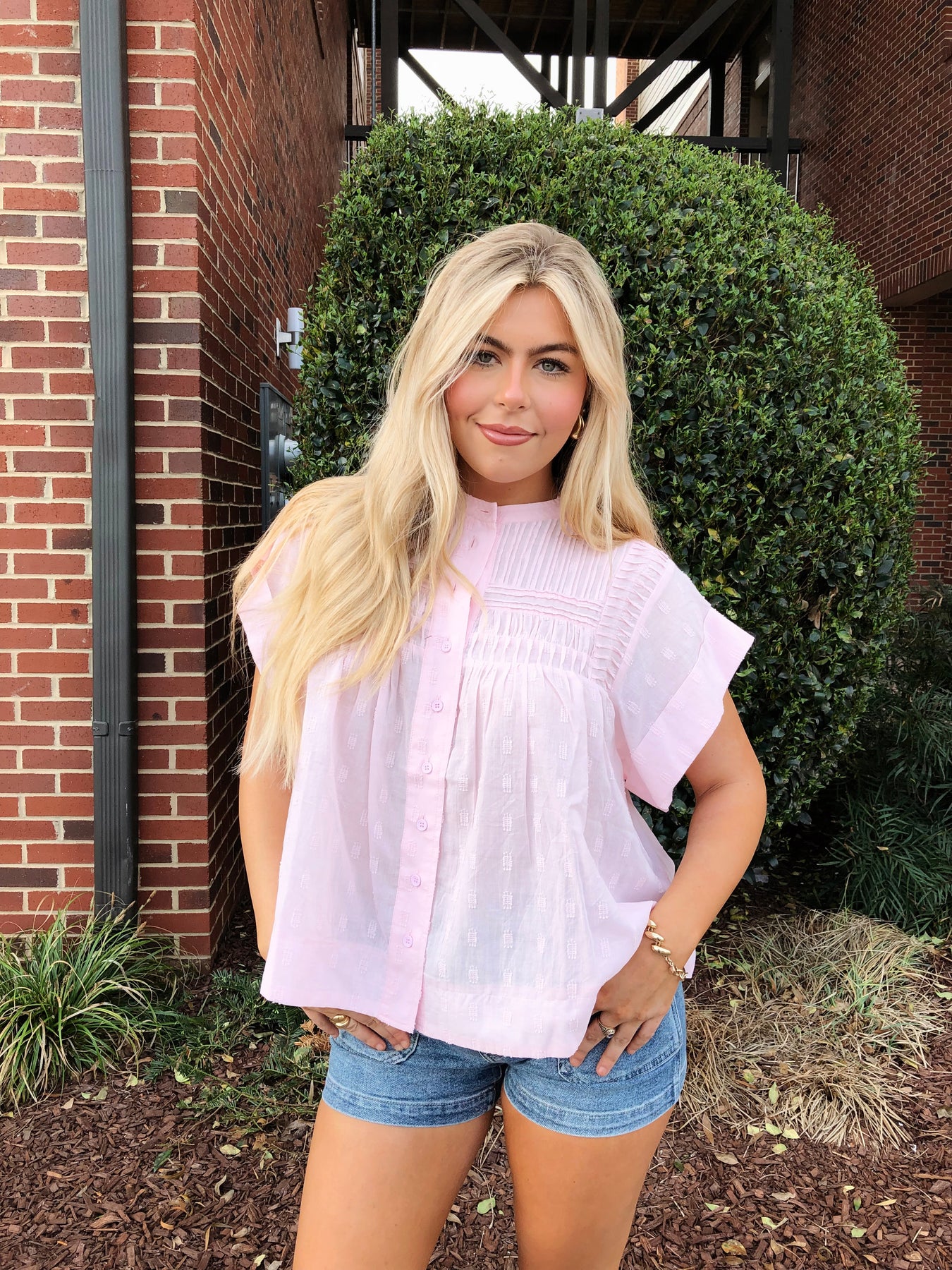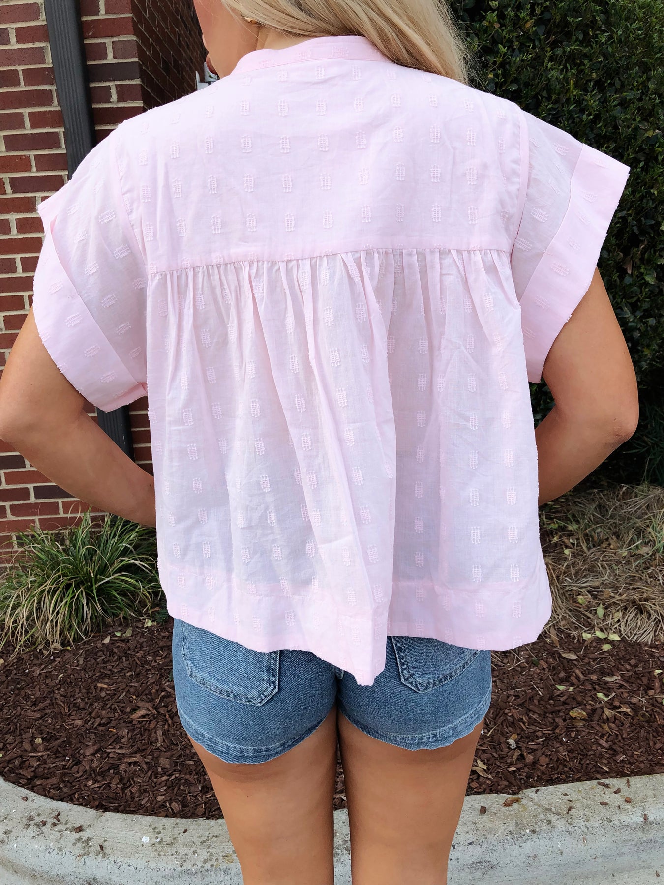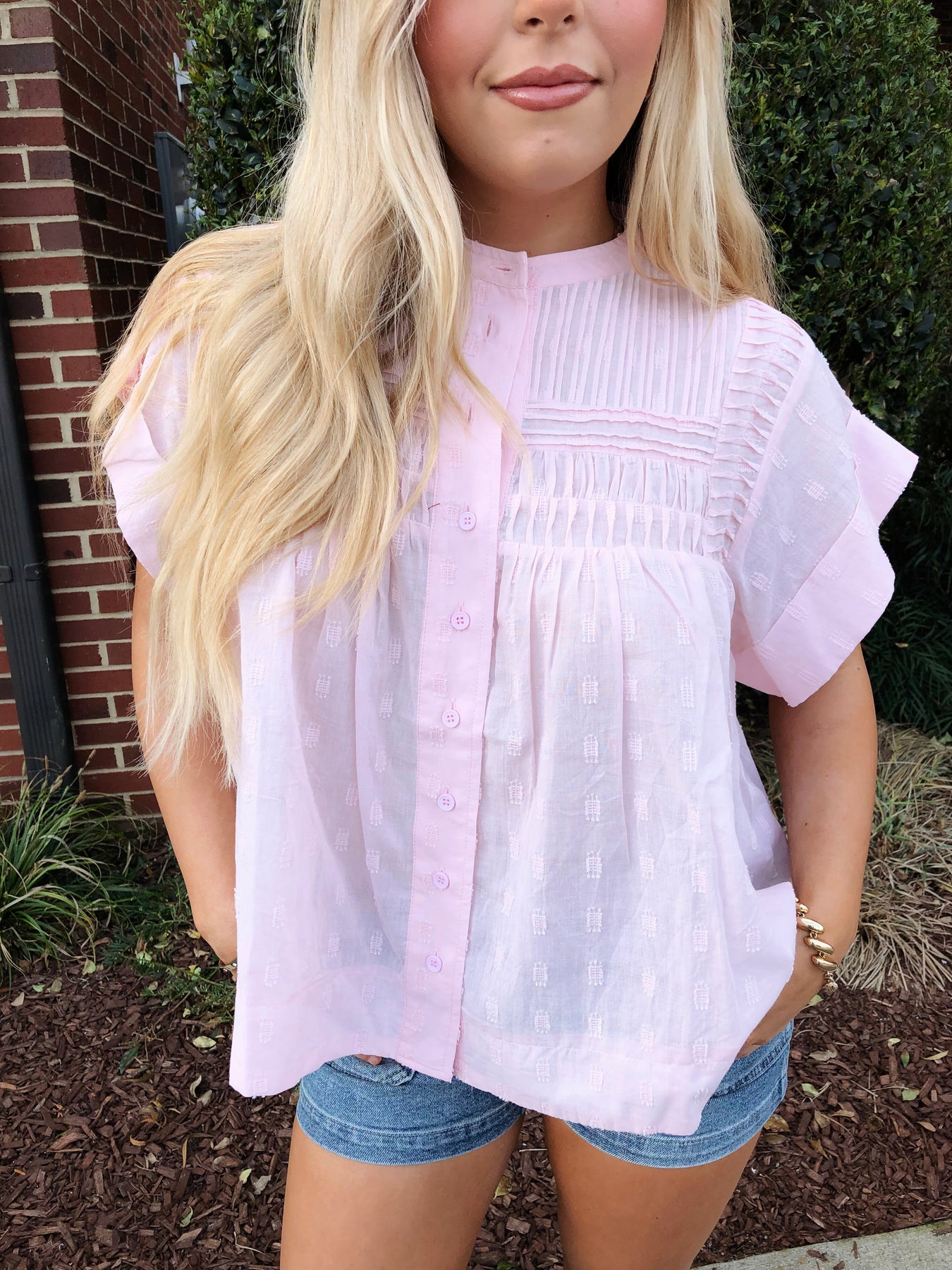Effortless elegance meets playful charm in this light pink sleeveless button-down top. Delicate ruffles frame the neckline and armholes, adding feminine texture and movement to your everyday wardrobe. The classic button-front design offers versatile styling—dress it up with tailored trousers or keep it casual with denim. Perfect for spring and summer, this piece transitions seamlessly from office to weekend brunch.