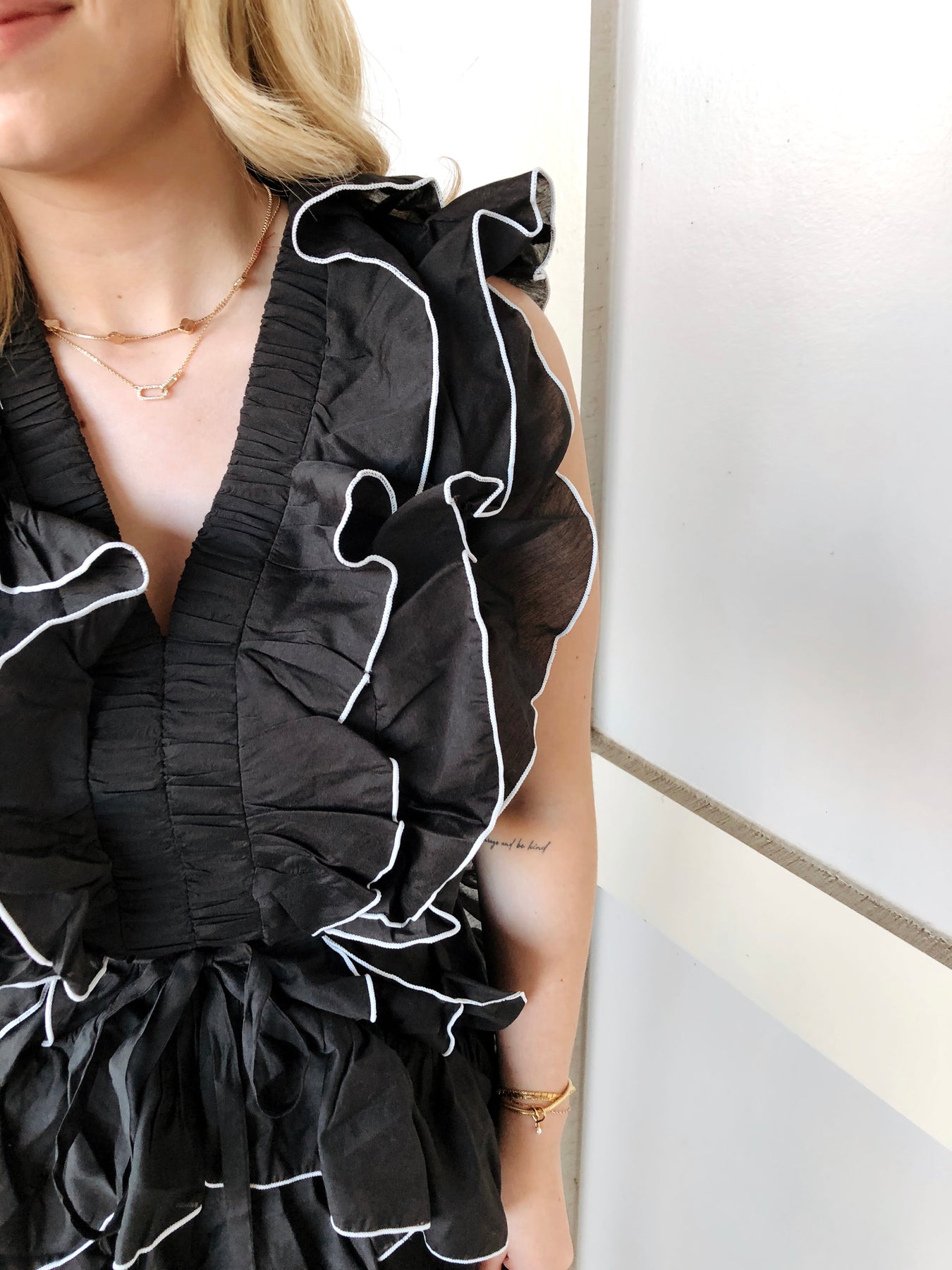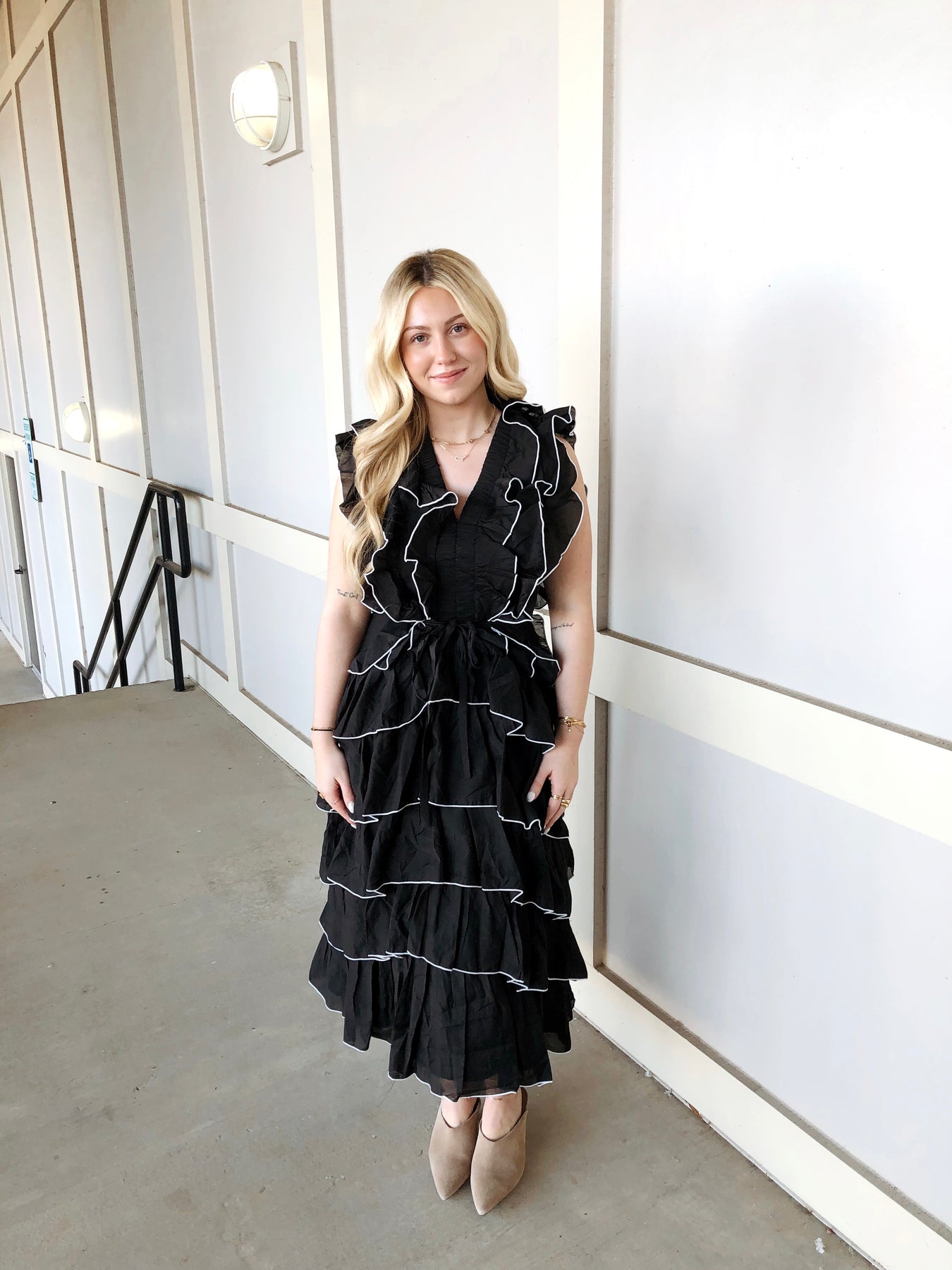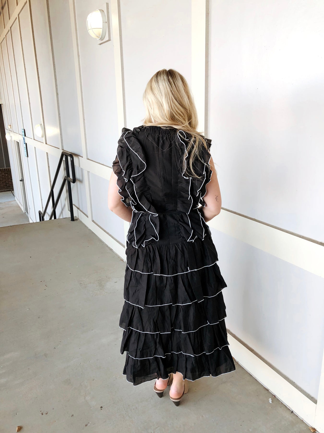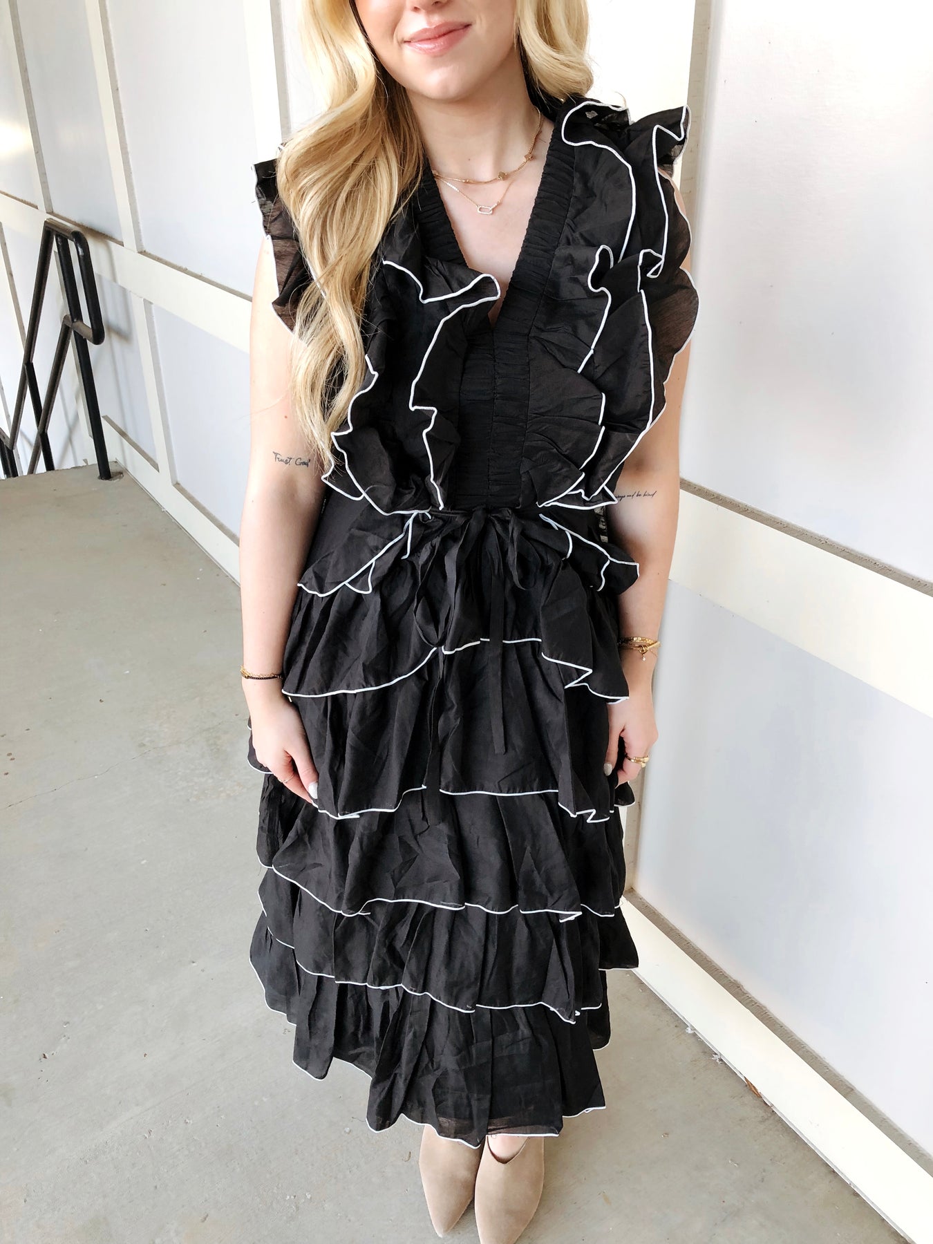 The AVALON DRESS is your ticket to effortless elegance with a playful twist. This sleeveless midi beauty features cascading ruffles that dance with every move, creating dimension and movement that'll turn heads. The striking black and white color combo works overtime—dress it up for date night or keep it casual for weekend adventures. Perfect for anyone who wants to make a statement without trying too hard. Slip it on and let those ruffles do the talking.