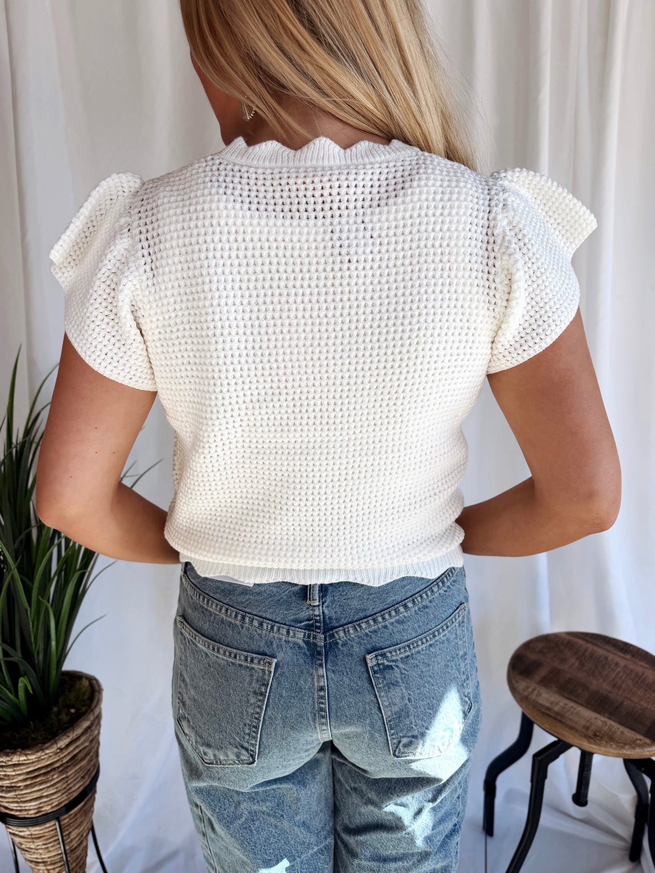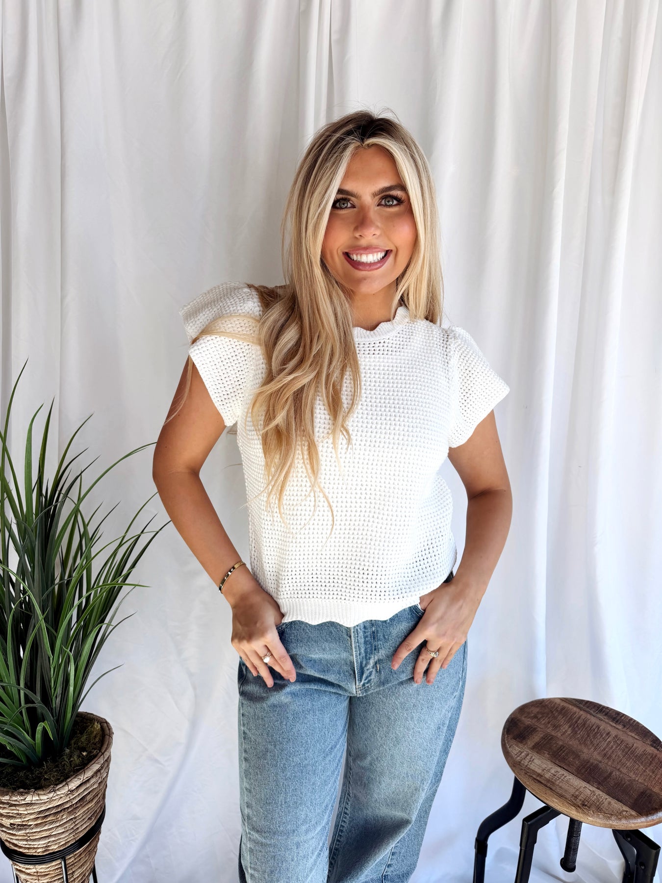 Elevate your everyday style with this charming knit top featuring delicate scallop detailing at the neckline and waistline. The crisp white fabric offers versatile appeal, while the playful scalloped edges add a touch of whimsy and feminine flair. Perfect for layering or wearing solo, this piece brings effortless sophistication to any outfit. Soft, comfortable, and endlessly wearable—your new wardrobe essential awaits.
