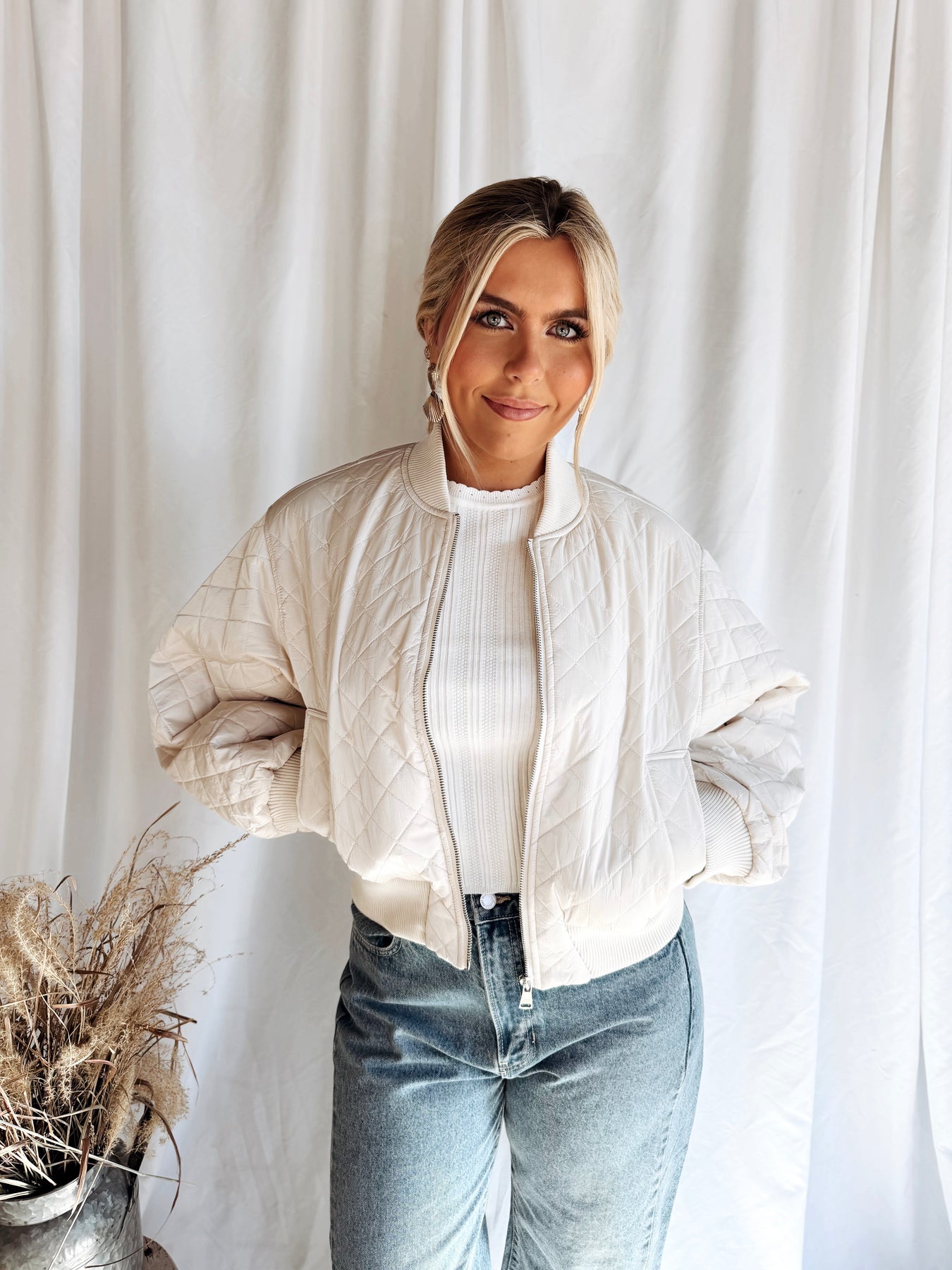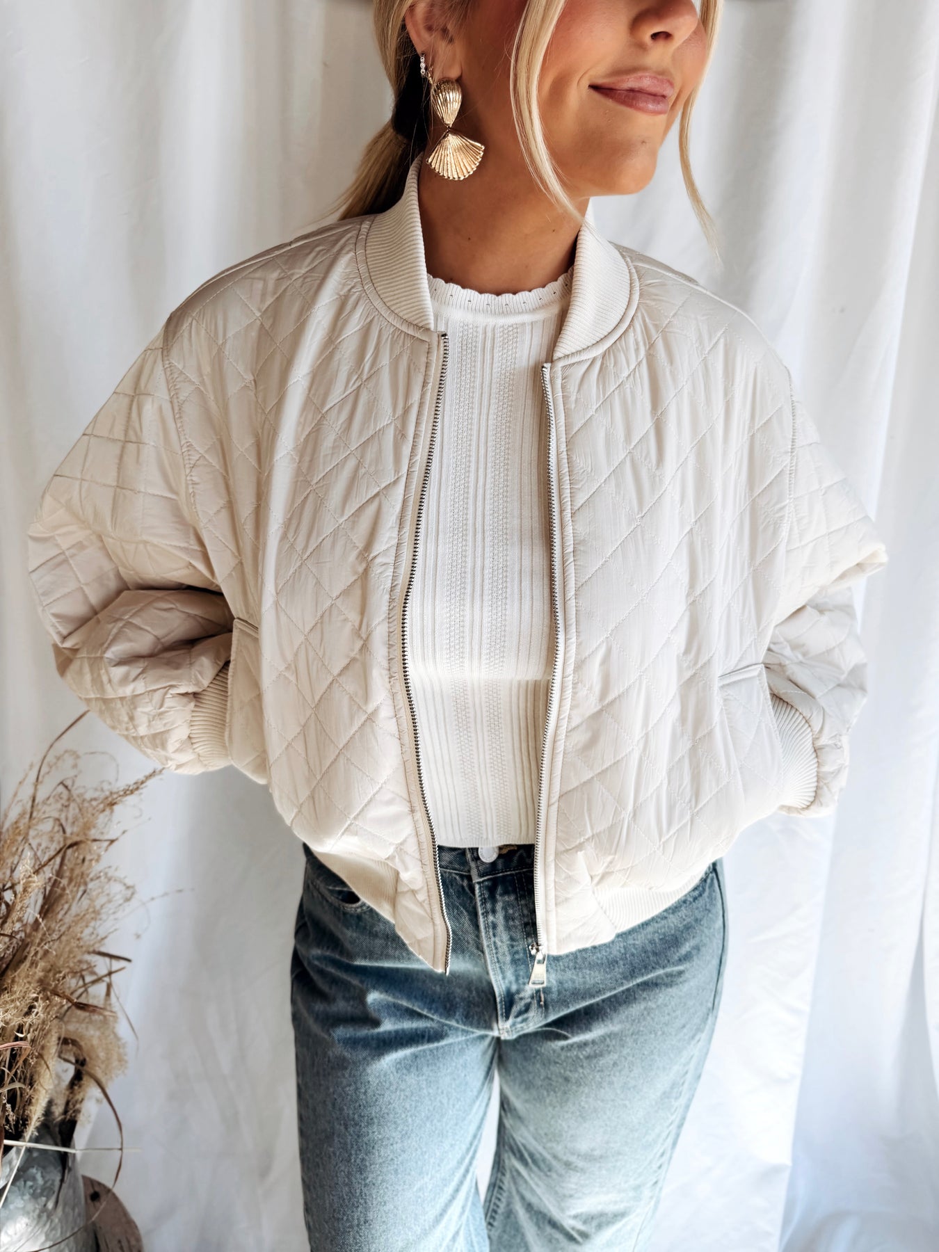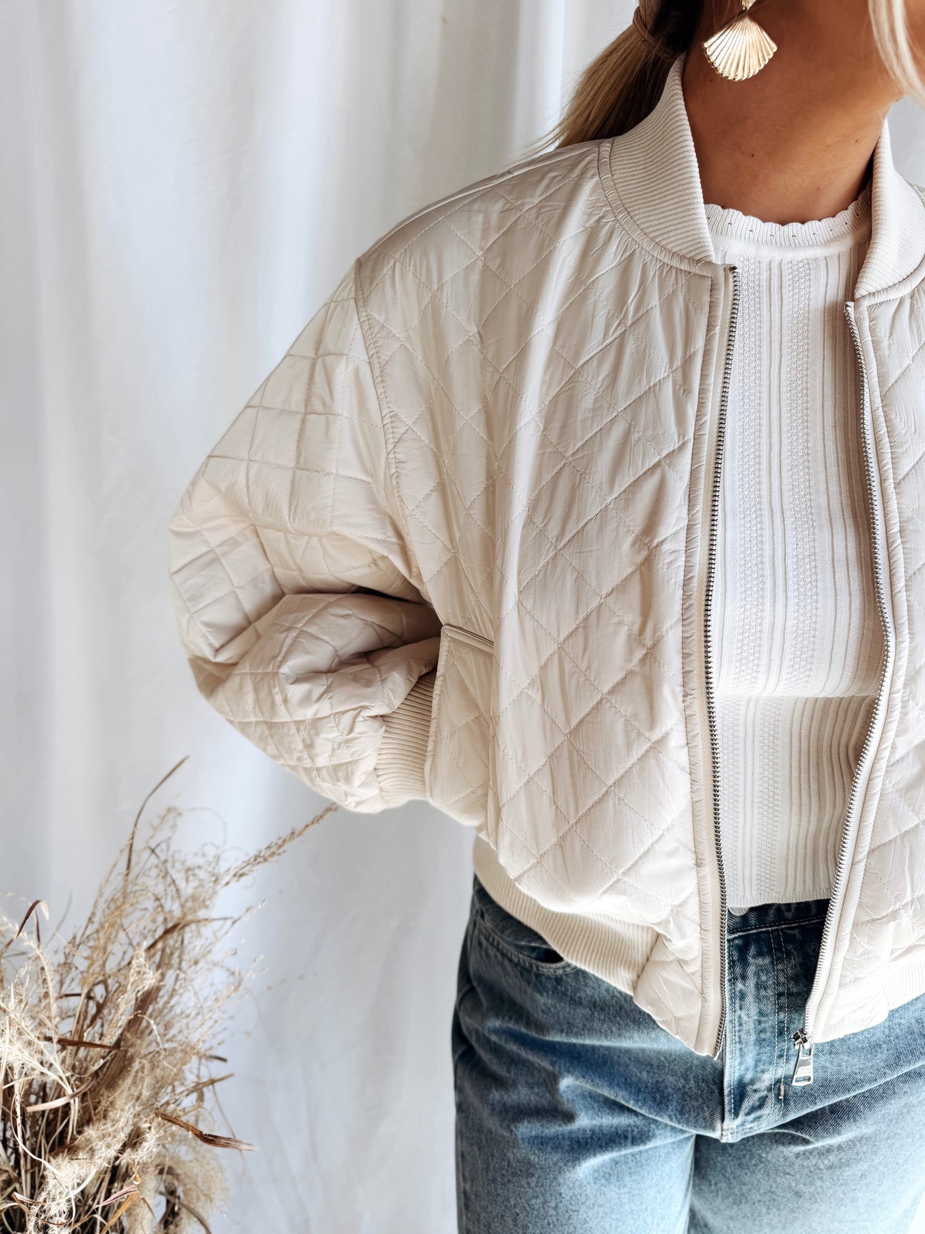 The Darla Jacket is your new go-to layer for effortless style. This cream-colored quilted beauty features a smooth zipper front that makes getting dressed a breeze. Perfect for layering over your favorite tees or dresses, it adds just the right amount of warmth without the bulk. Whether you're running errands or meeting friends, the Darla keeps you cozy and looking put-together. A timeless piece that works with everything in your closet!