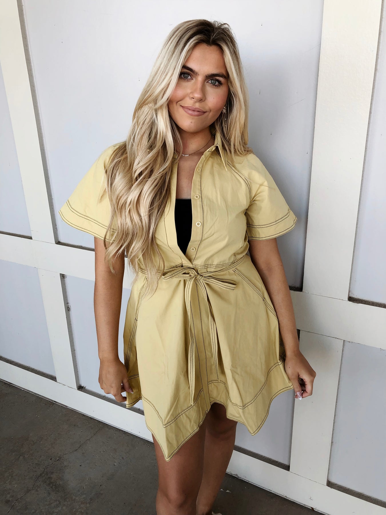 Slip into effortless charm with this collared button-up dress that's ready for anything. The crisp front closure gives you easy styling, while the tie-around waist cinches your silhouette with a playful flourish. Perfect for dressing up or down, this versatile piece transitions seamlessly from casual days to evening plans. A wardrobe essential that feels like your only wish come true.