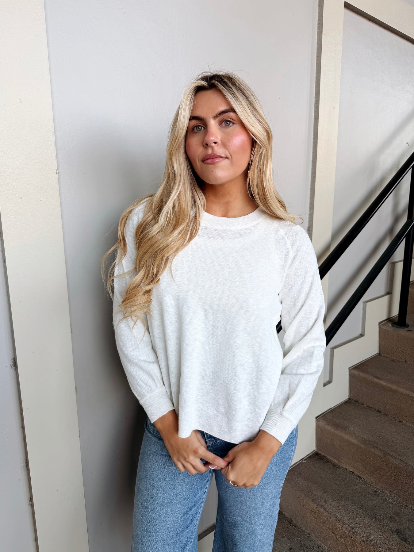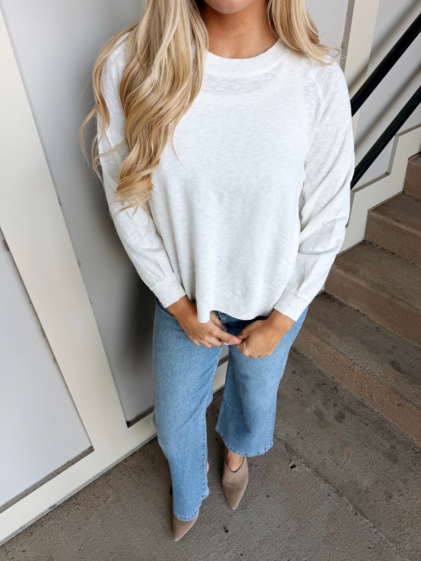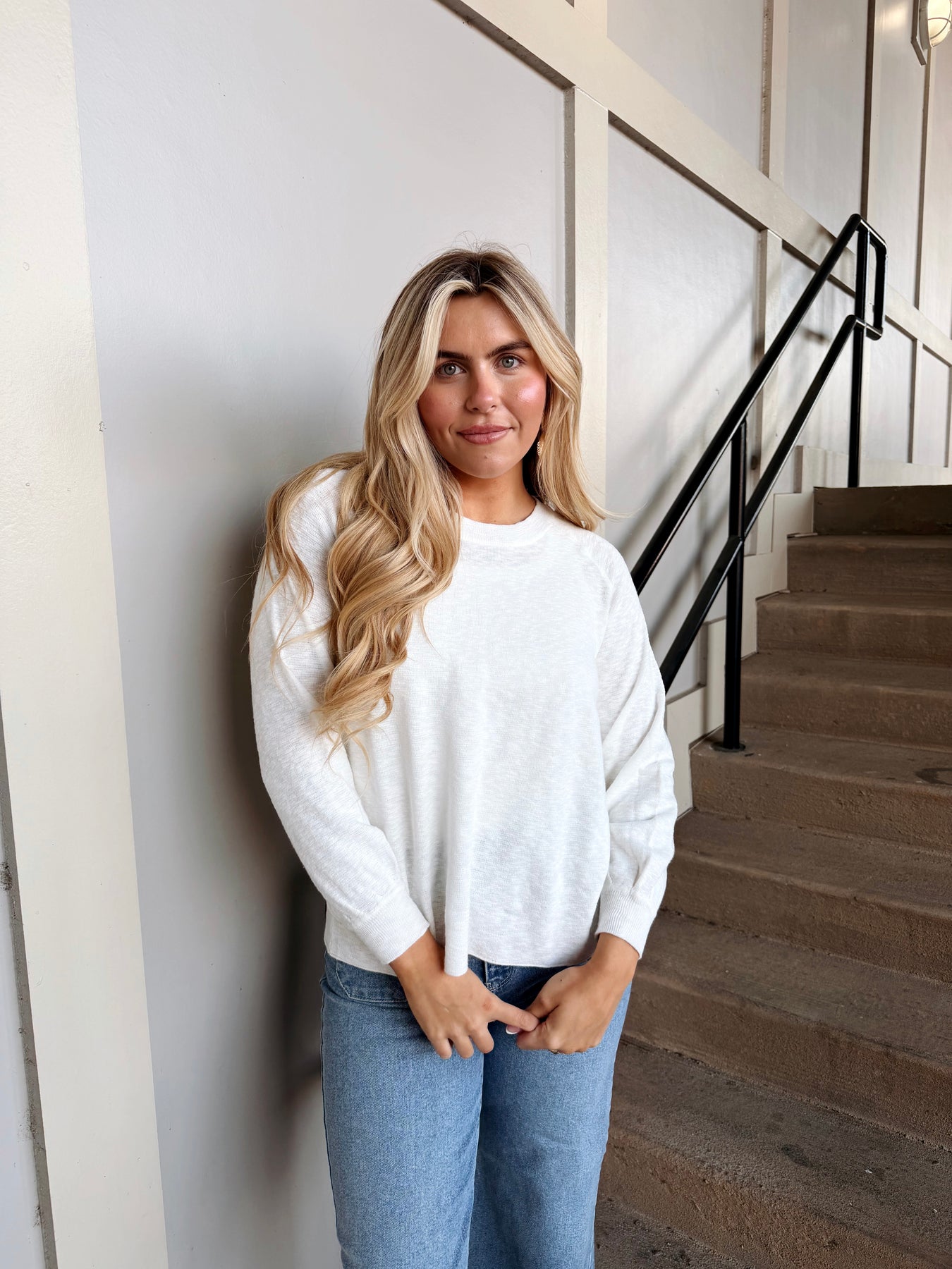 The Bailey Sweater is your new go-to layer for effortless style. This lightweight long sleeve sweater in crisp white works beautifully solo or layered under your favorite pieces. Perfect for transitional weather, it's cozy enough to keep you comfortable without the bulk. Throw it on with jeans, a skirt, or dress it up for a polished look that feels anything but stuffy. Simple, versatile, and ready for whatever your day brings.